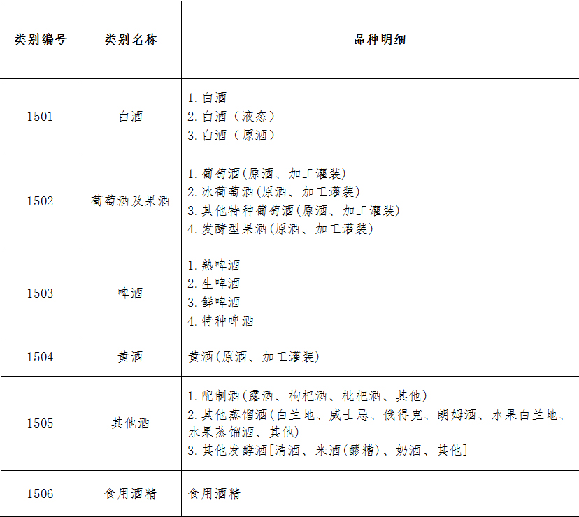 酒類產品類別編號及類別名稱:1501白酒;1502葡萄酒及果酒;1503啤酒;1504黃酒;1505其他酒;1506食用酒精
