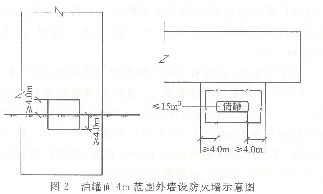 小型可燃液體中間罐常放在廠房外墻附近,為安全起見,要求可能受到火災作用的部分外墻采用防火墻,并提倡將儲罐直接埋地設置。條文“面向儲罐一面4.0m范圍內的外墻為防火墻”中“4.0m范圍”的含義是指儲罐兩端和上下部各4m范圍,見圖2。