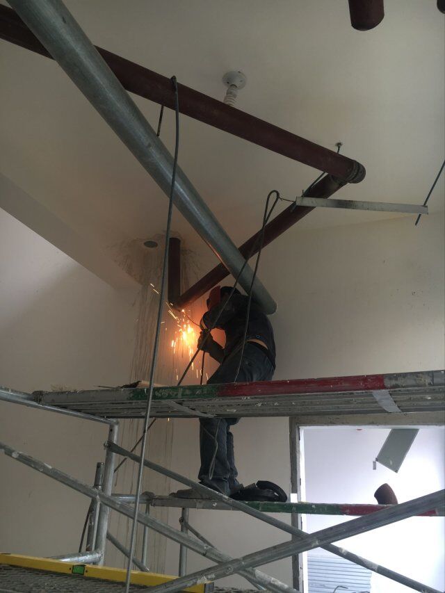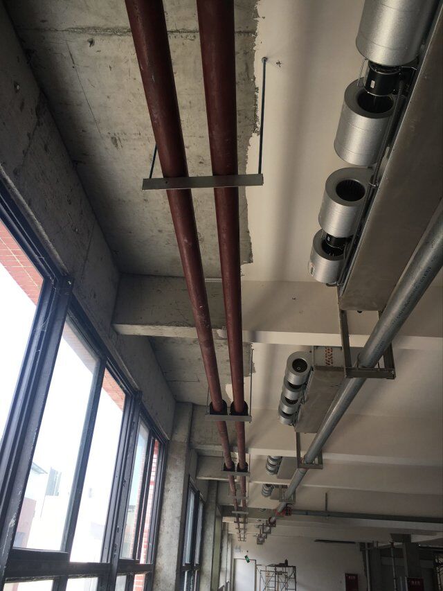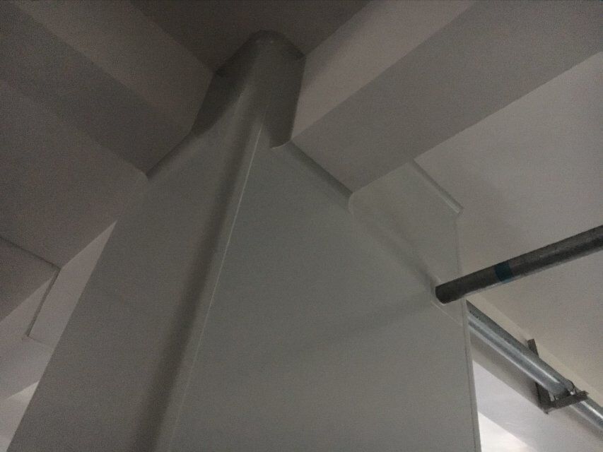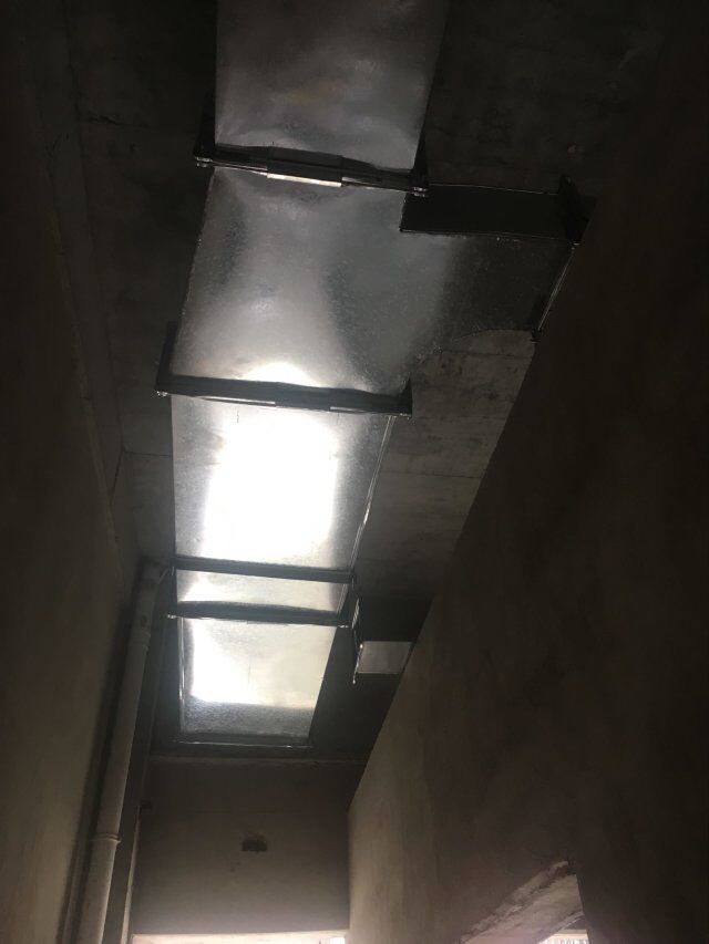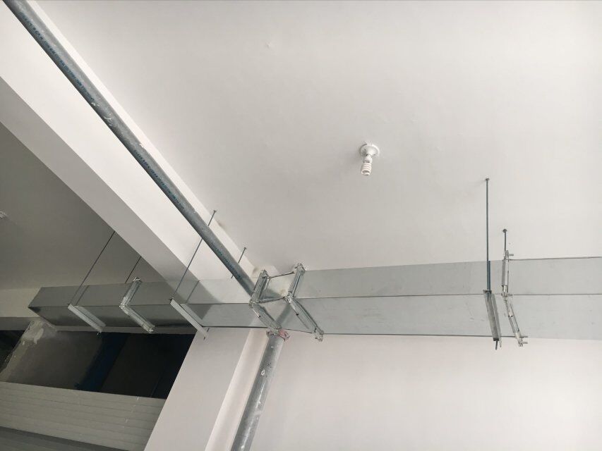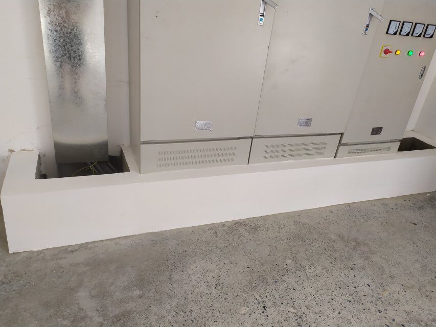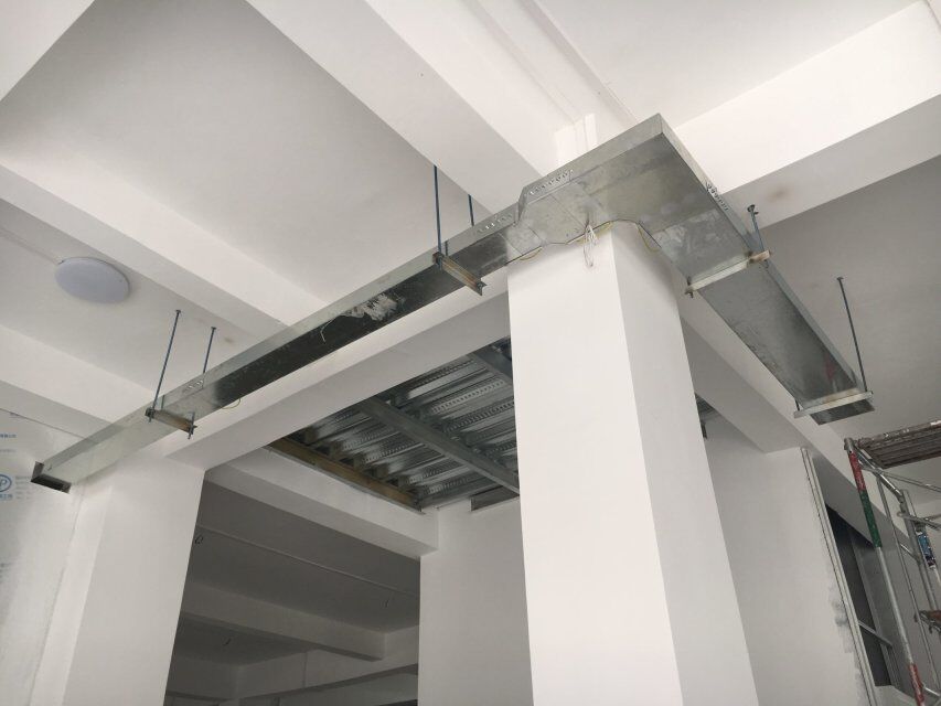 四川美料美味食品科技有限公司廠房裝修現(xiàn)場:排風(fēng)口安裝,地坪施工,地面貼磚