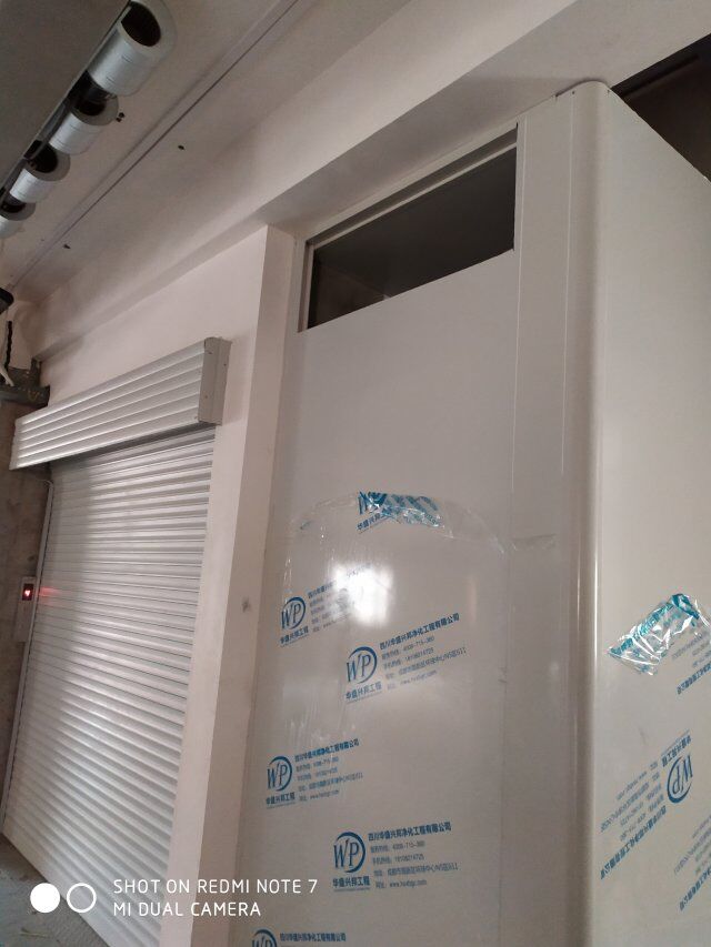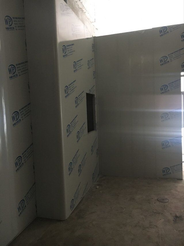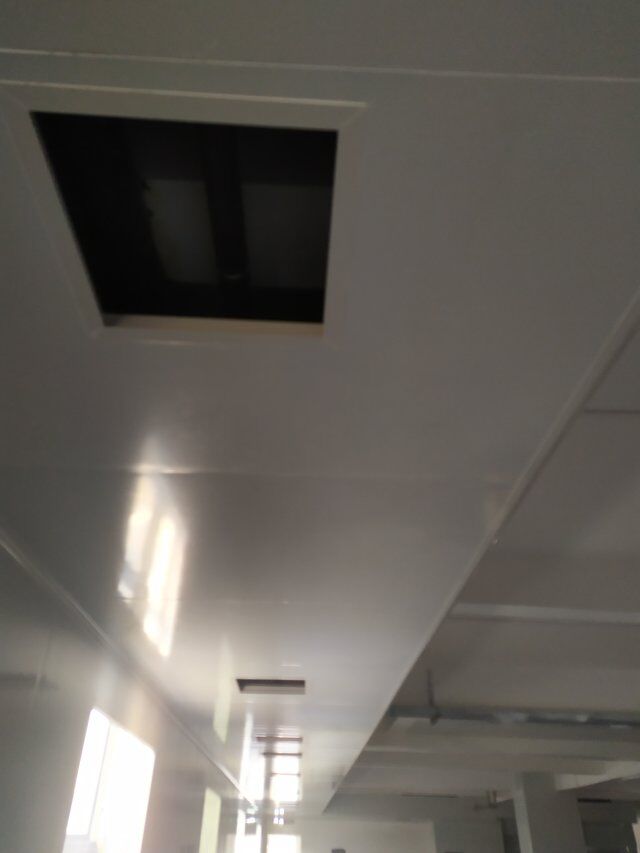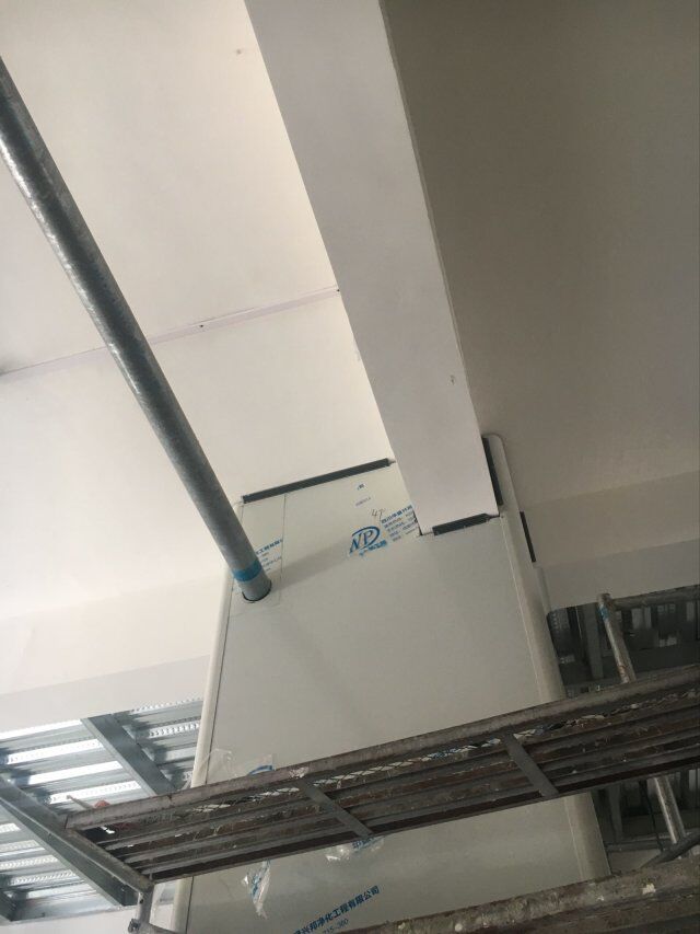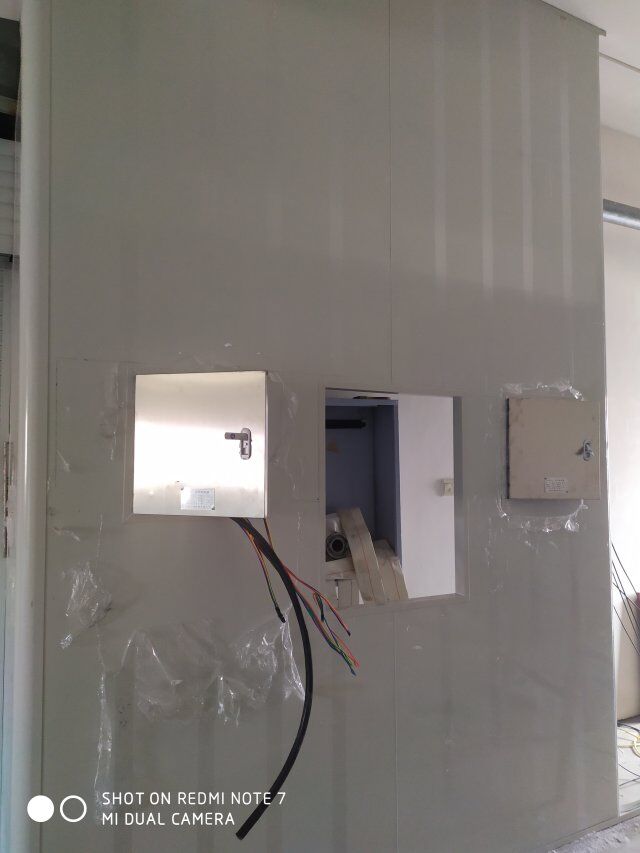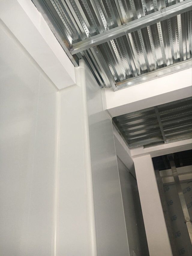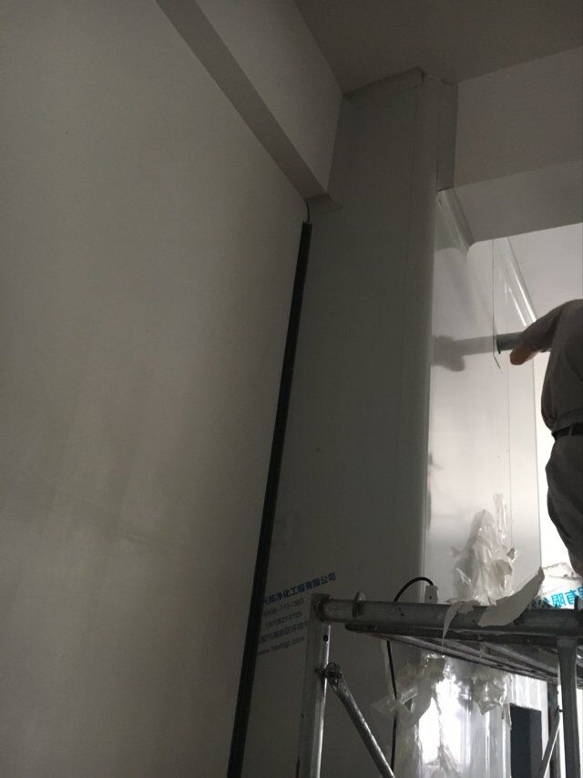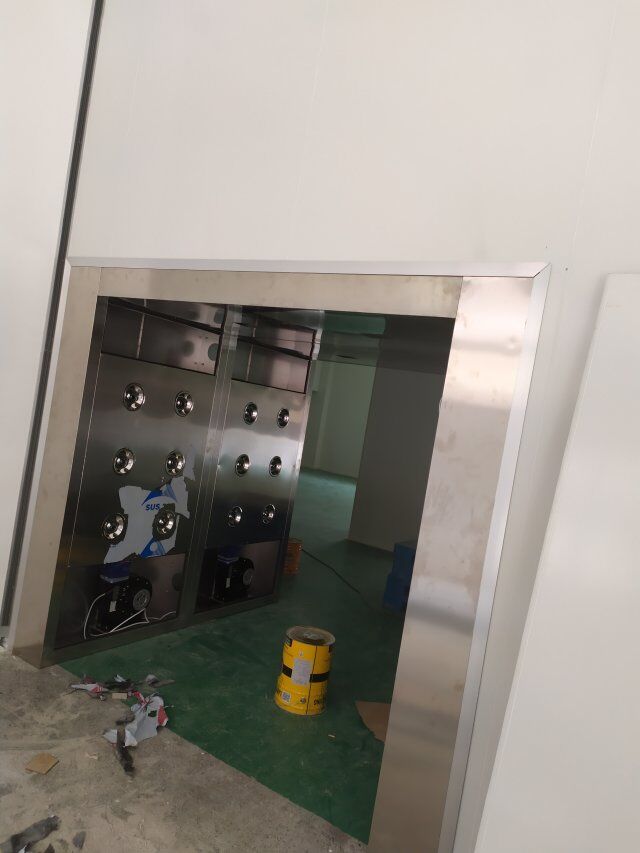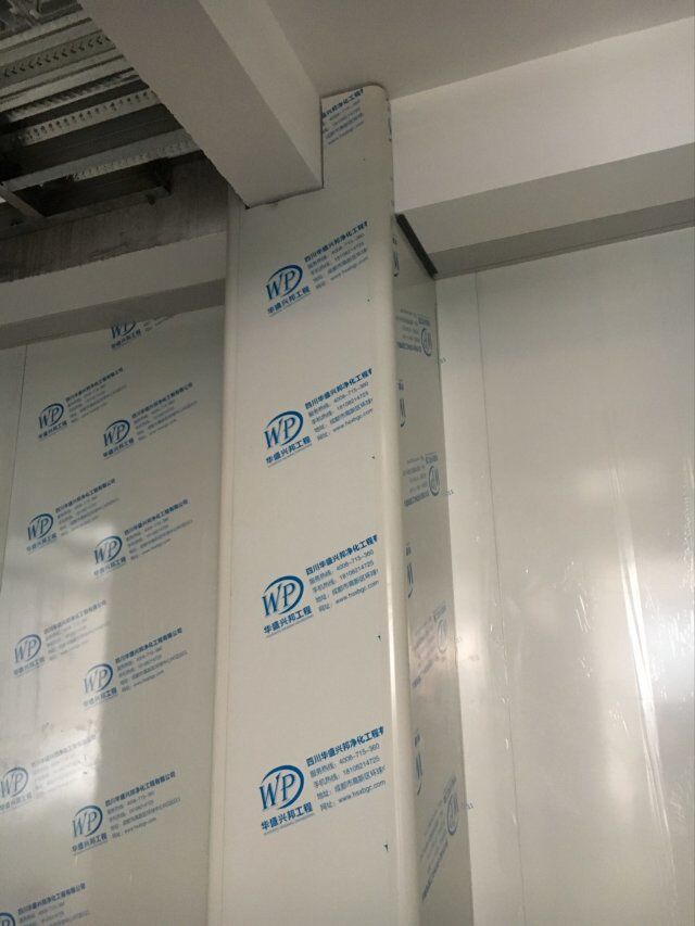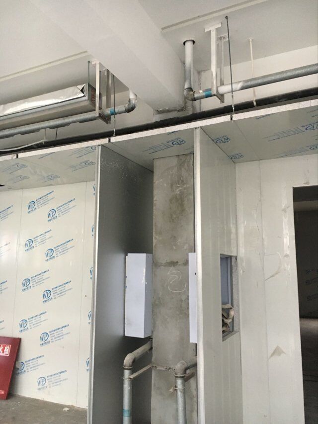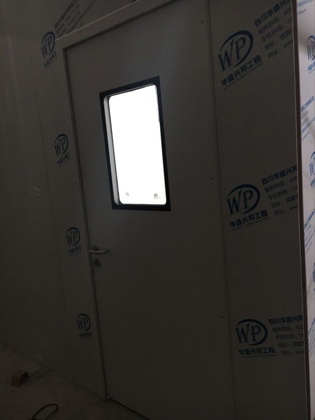 四川美料美味食品科技有限公司廠房裝修現(xiàn)場,風(fēng)淋室調(diào)試安裝完成,板材包邊完成