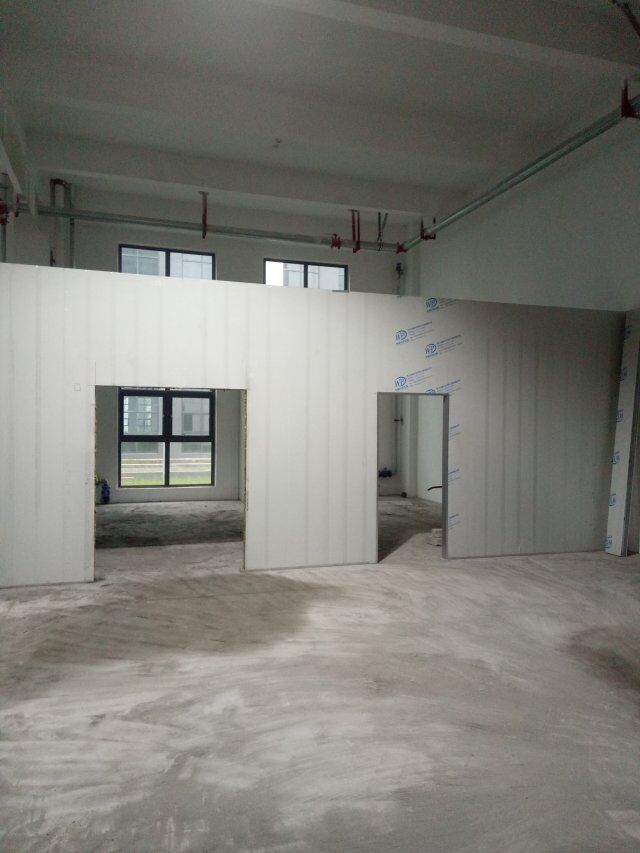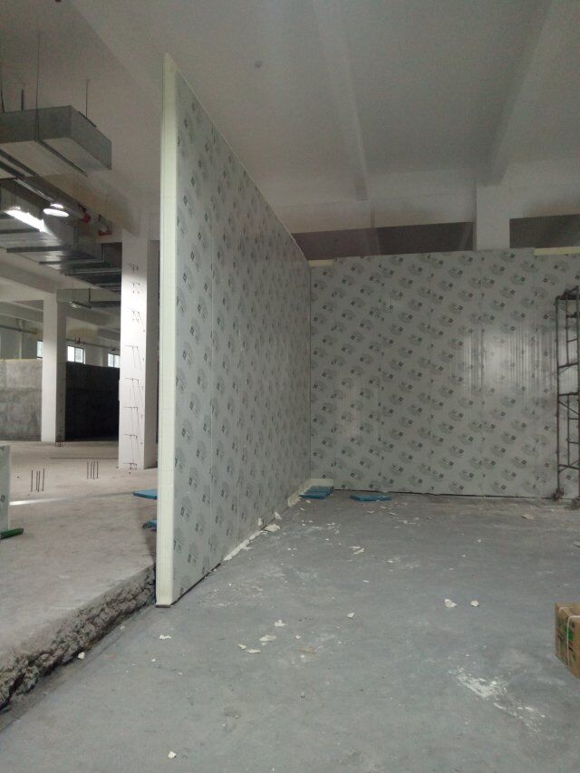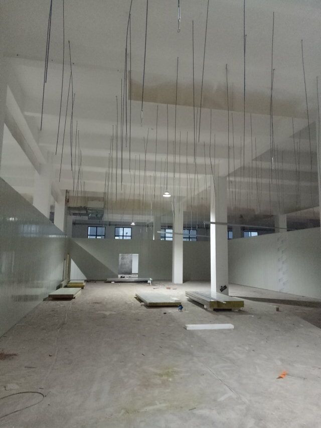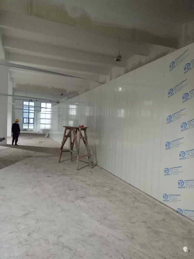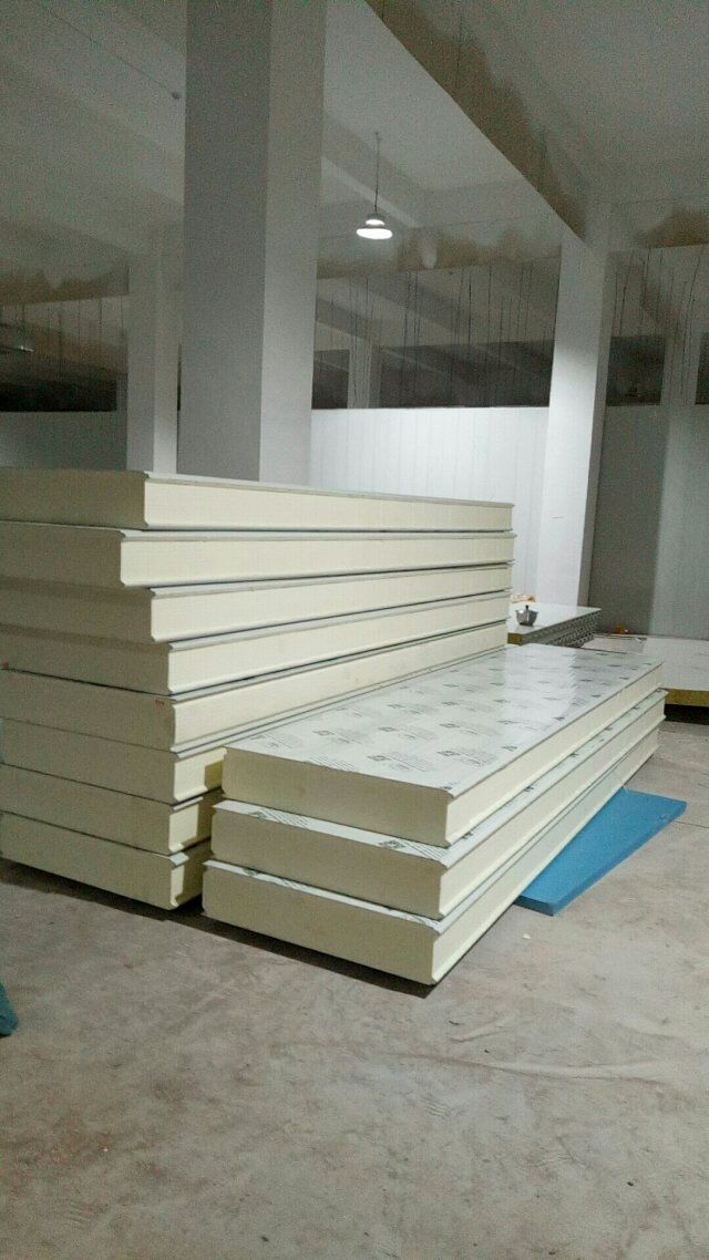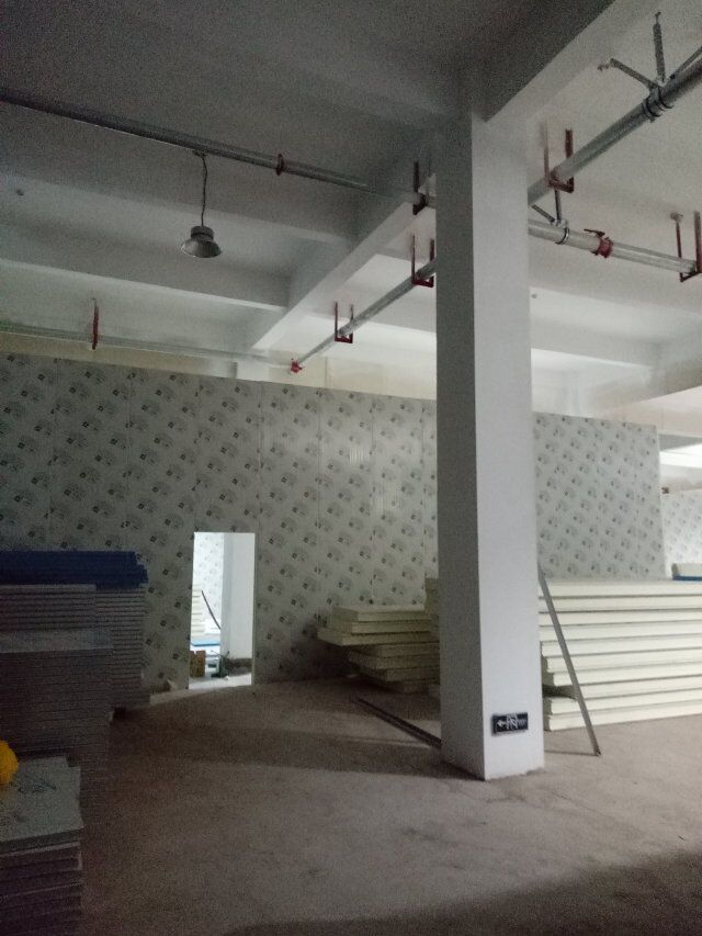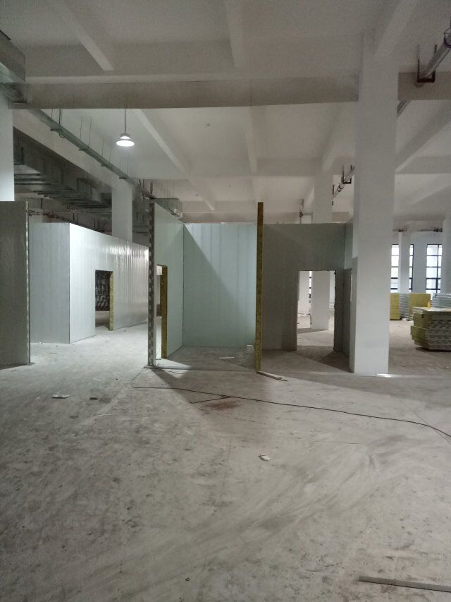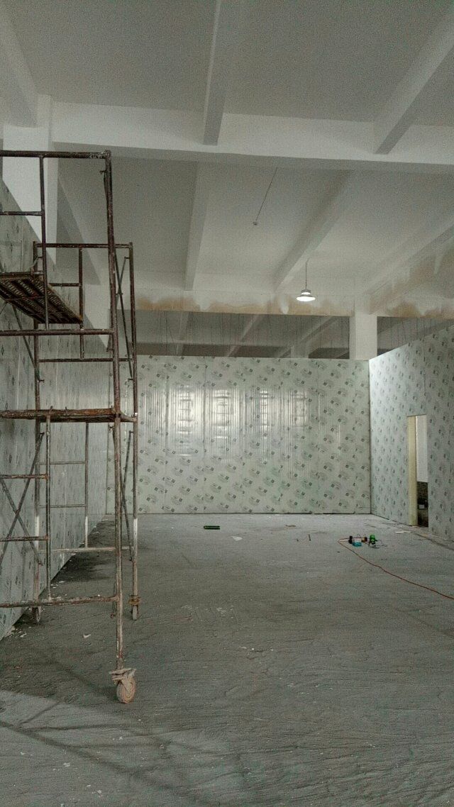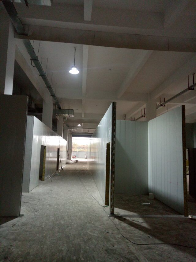 1、速凍庫墻板安裝完成,頂板完成一半, 2、成品凍庫板材到場, 3、T鋁安裝 4、墻板安裝完成80%