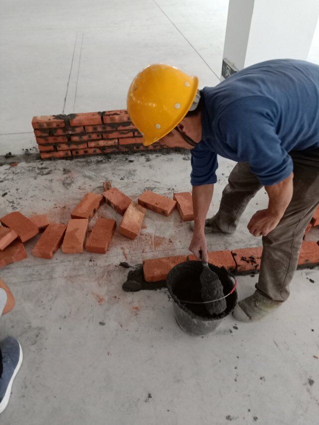 1、室內抬高區域防水施工完成, 2、排水溝兩邊磚體砌筑完成。