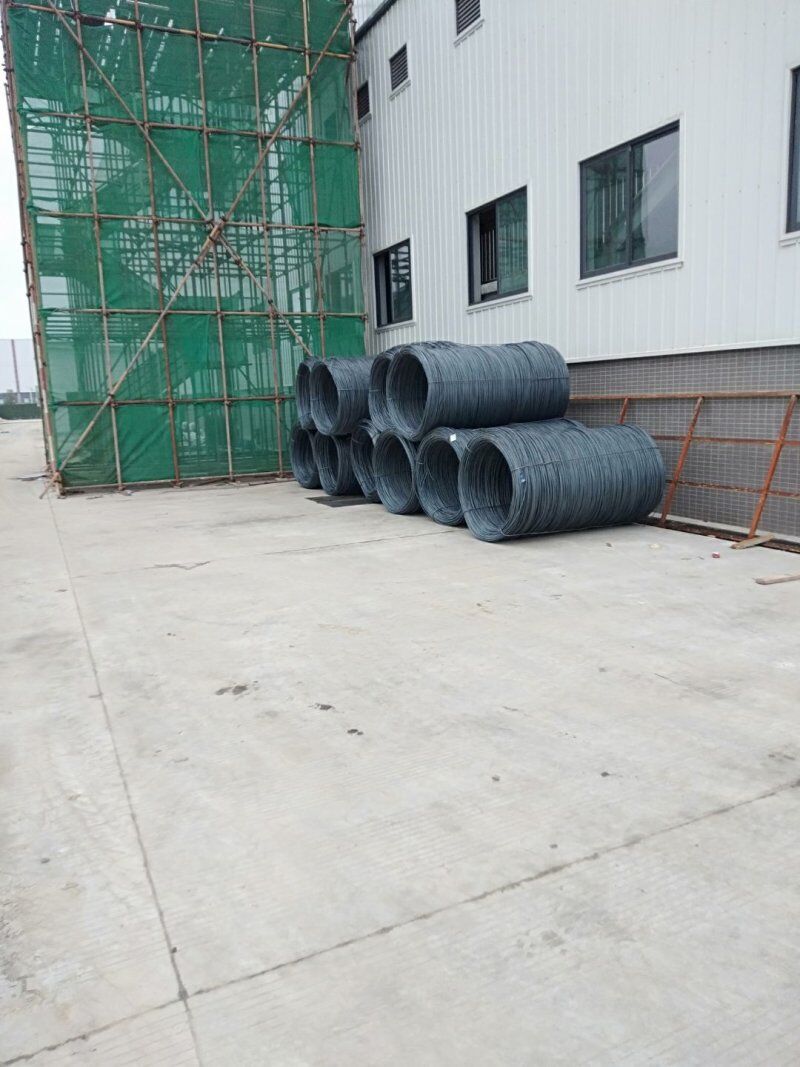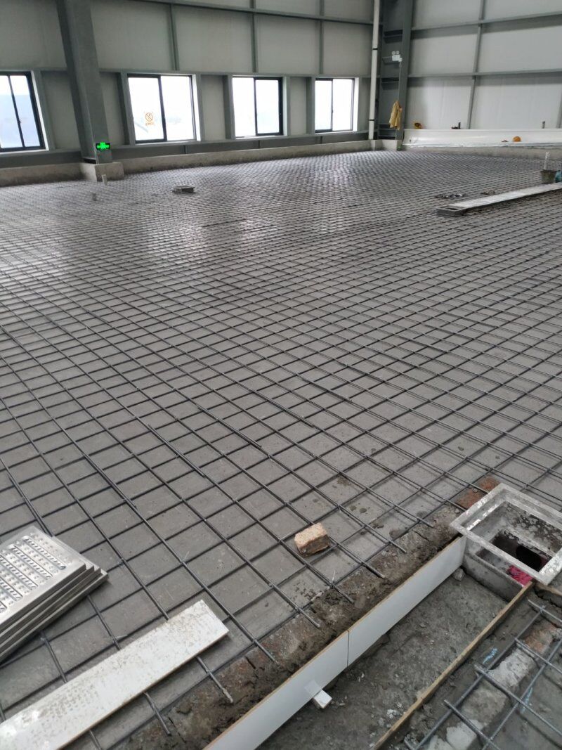 車間施工現場,鋼筋預制捆扎完成,擋水墻抹灰施工,排水溝貼磚完。