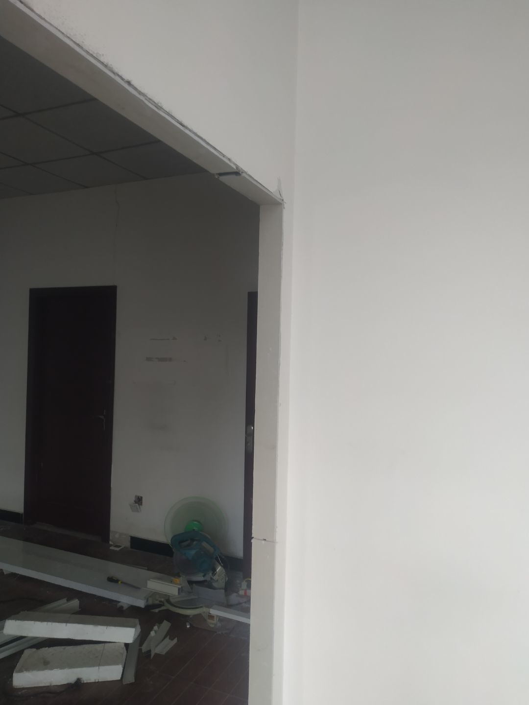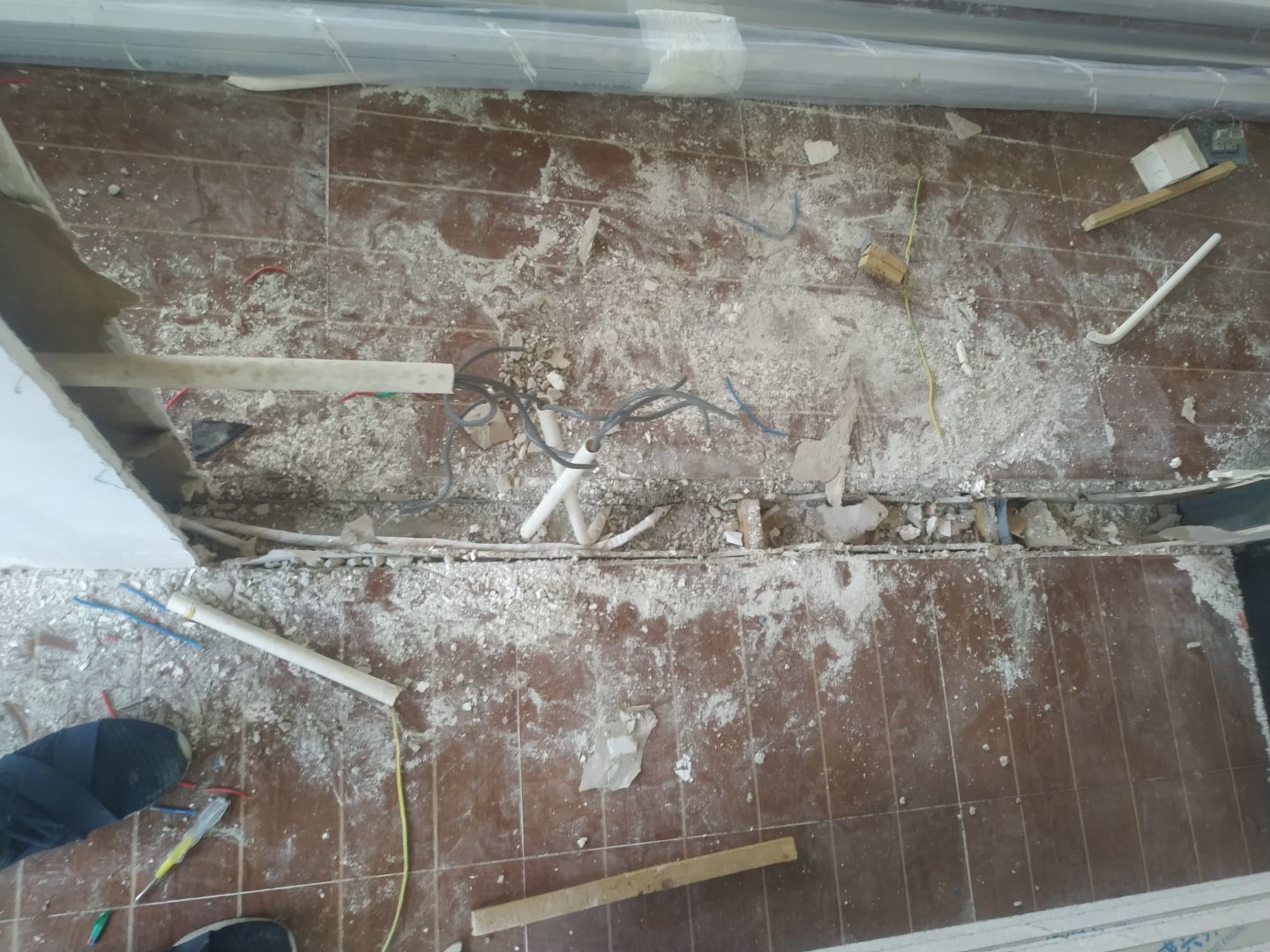 暗埋排水管和給水管地面恢復完成;門洞開洞完成;靠外墻內側墻面鏟除完成,刷界面劑完成。