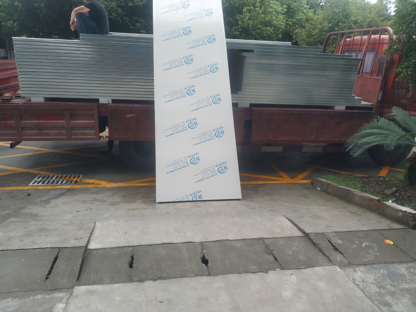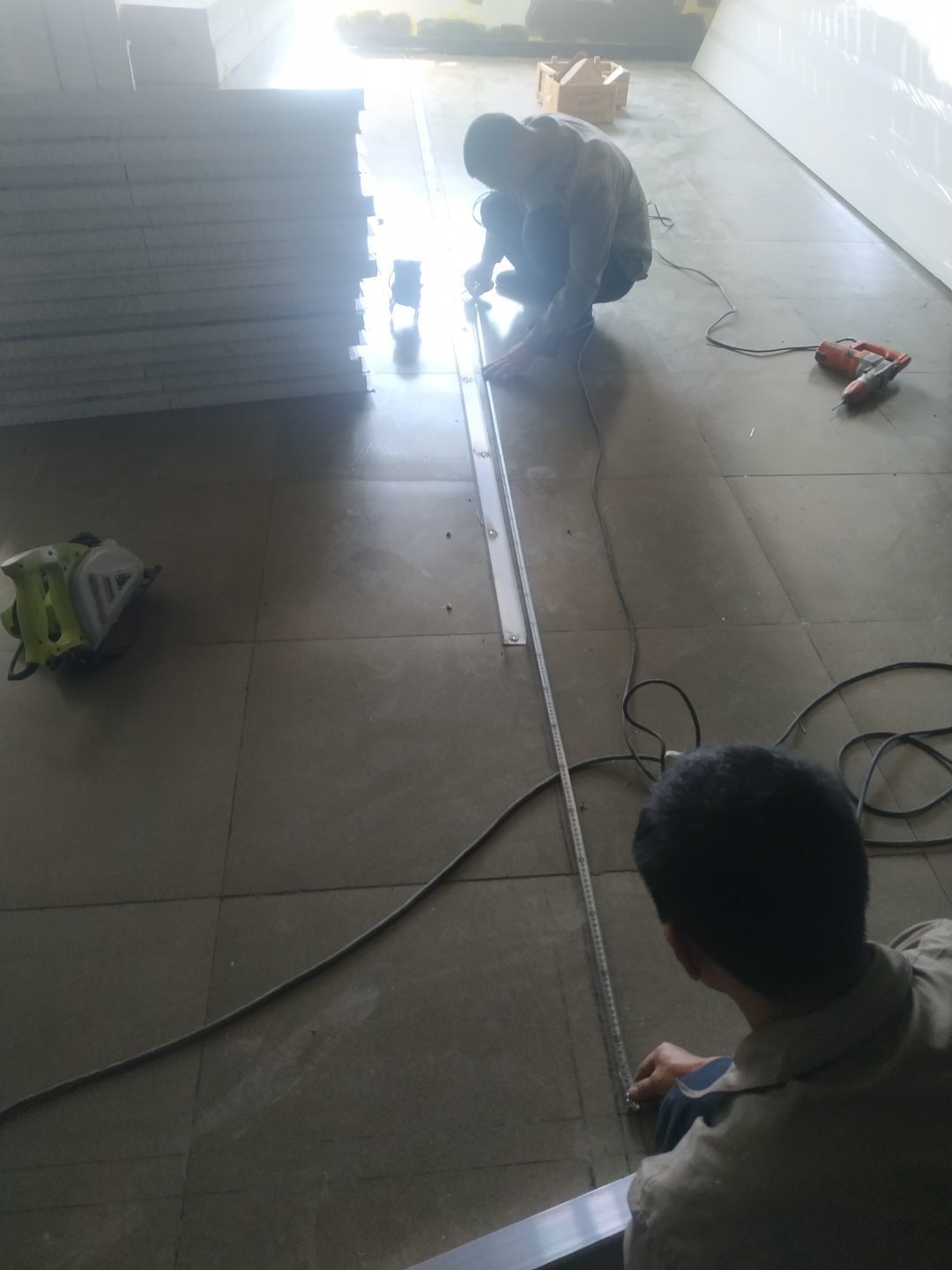 1.彩鋼材料到場卸貨搬運至車間內部。2.放線完成30%,地槽安裝完成30%,墻板安裝完成15%。3.插座移位置改線完成。4.墻面抗裂砂漿修補完成。