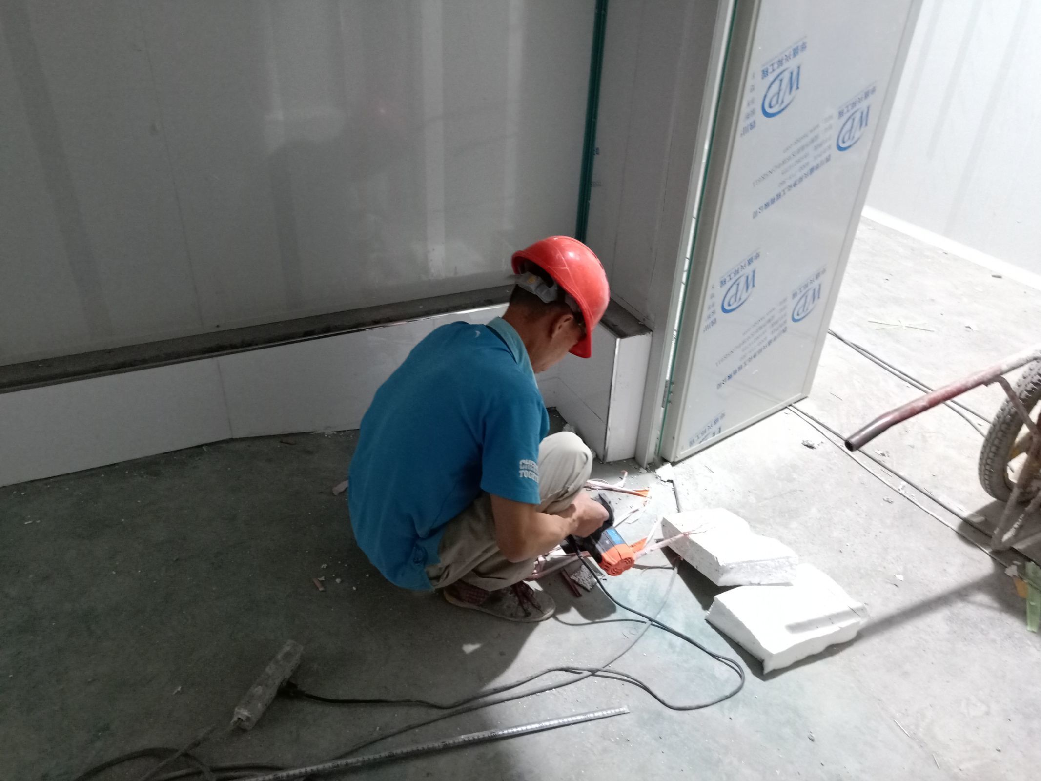 1.污水池扎鋼筋。 2.水電安裝施工 3.有煙道的房間開始彩鋼板吊頂 4.墻邊磚鋪施工