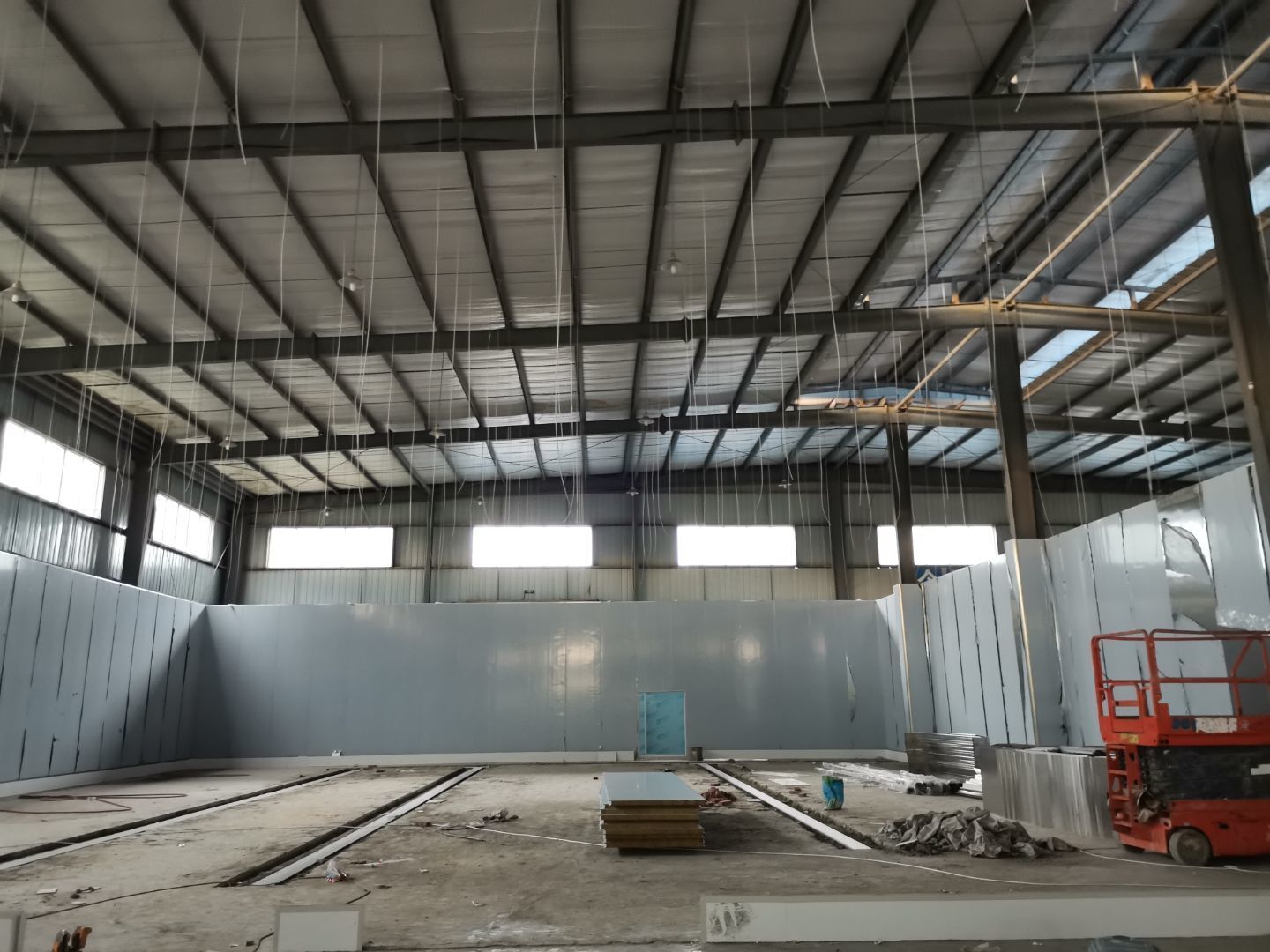 吊筋安裝完成70%,頂板安裝完成20%;彩鋼墻板安裝完成70%,門洞開設(shè)完成70%,自制門框下料完成50%; 場地清理。