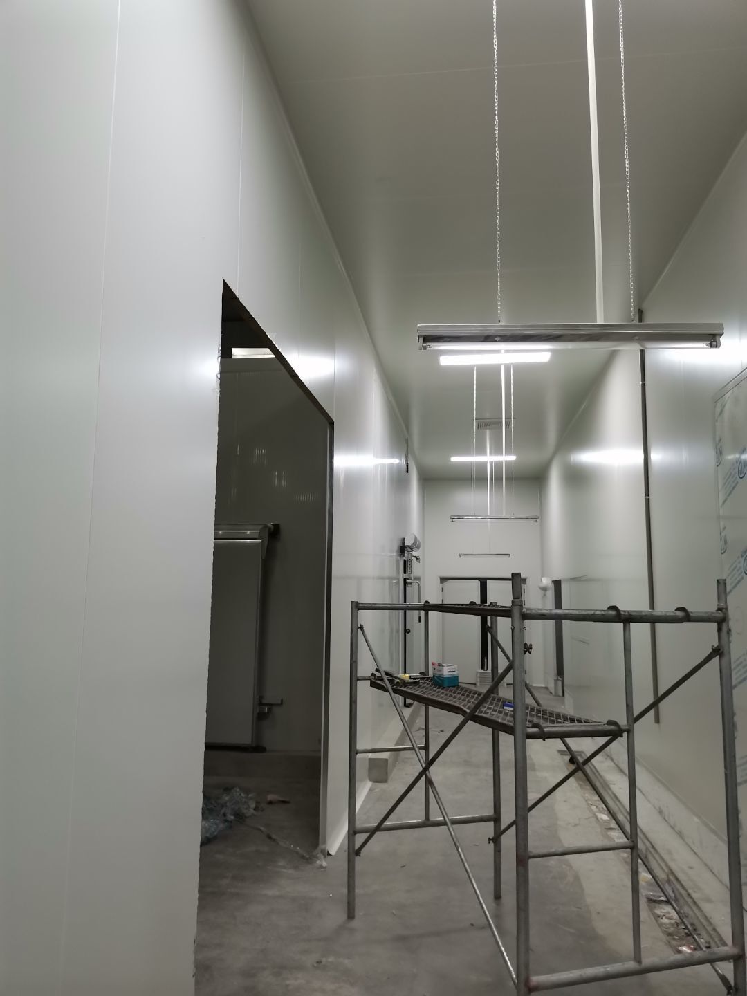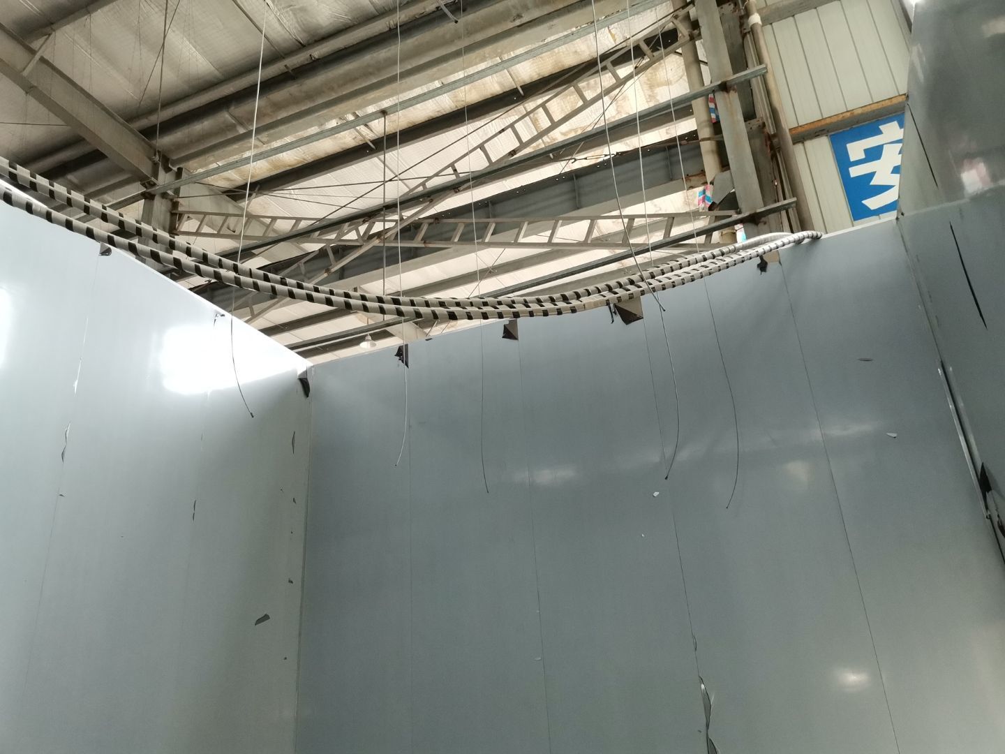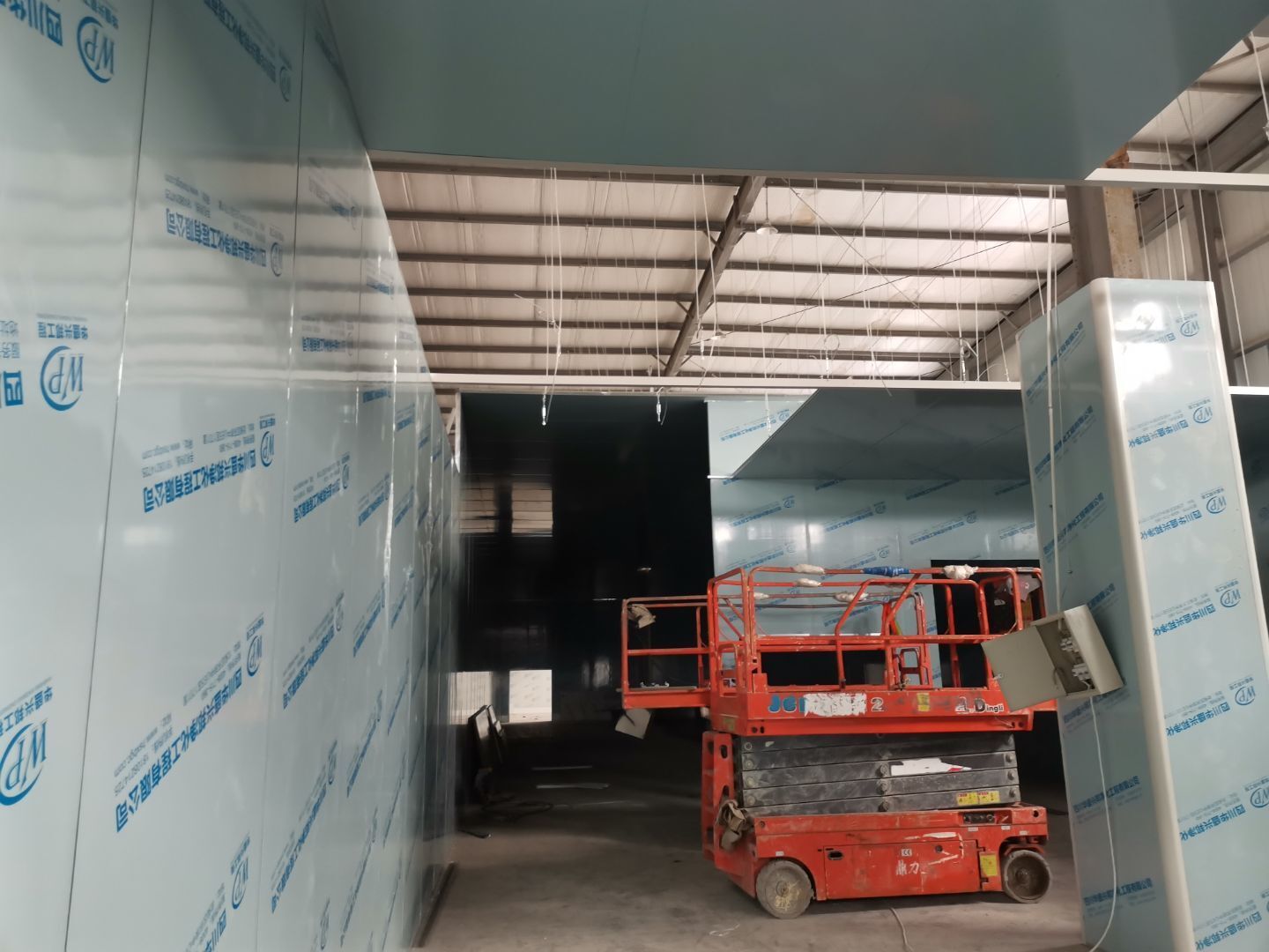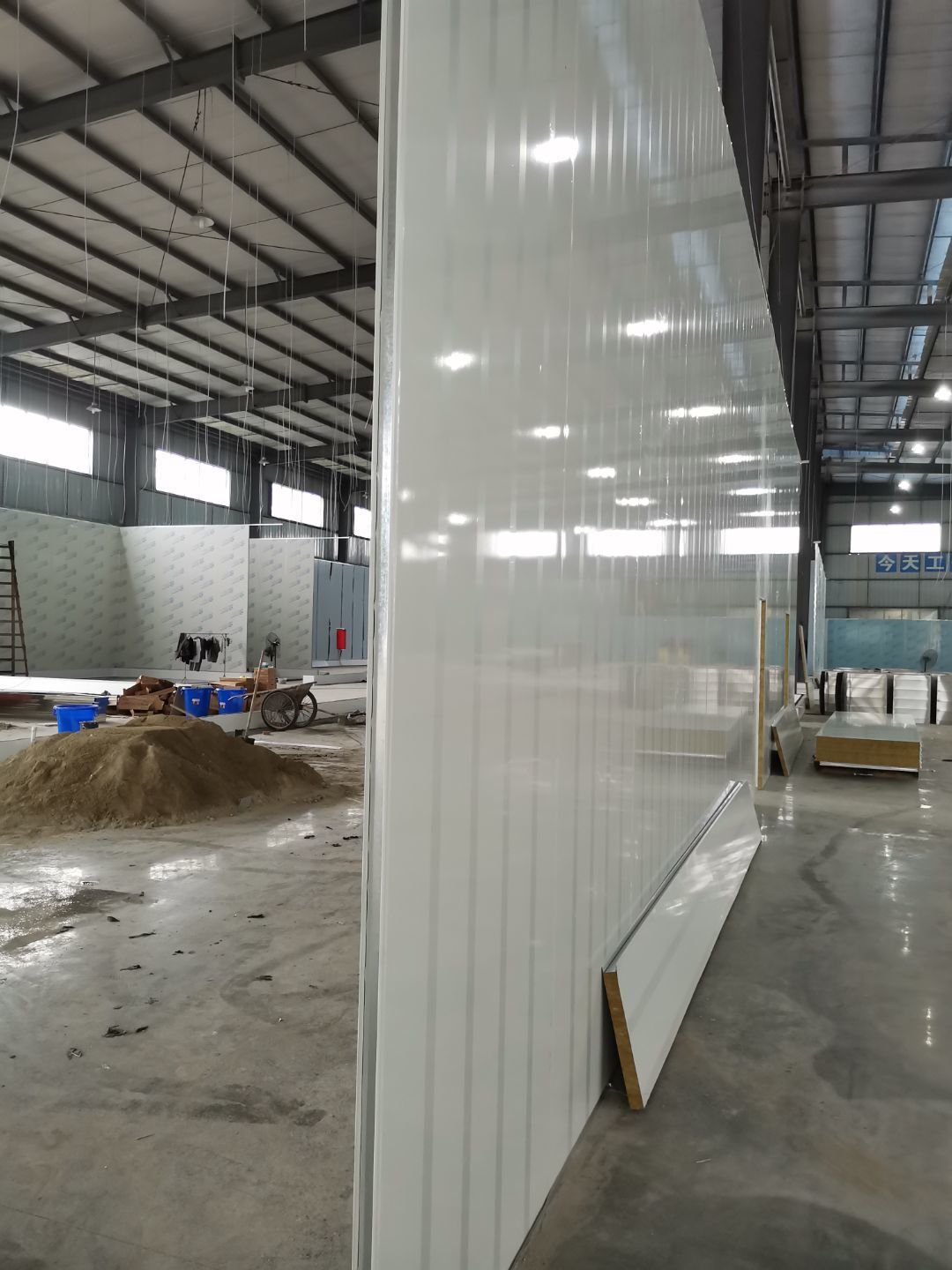 吊筋安裝完成,頂板安裝;彩鋼墻板安裝,門洞開設(shè)完成,水電燈具安裝,插座布線;彩鋼圓弧安裝