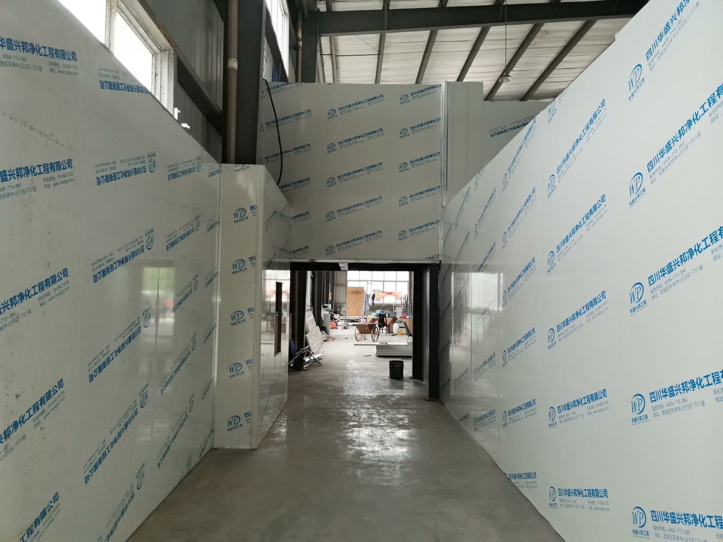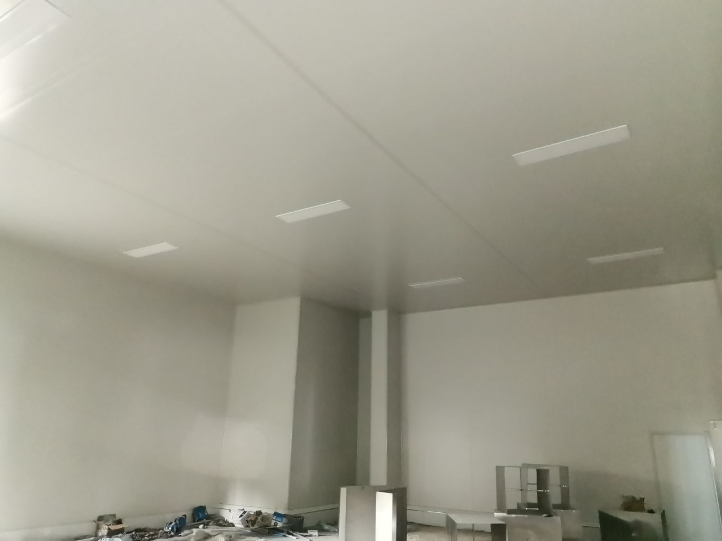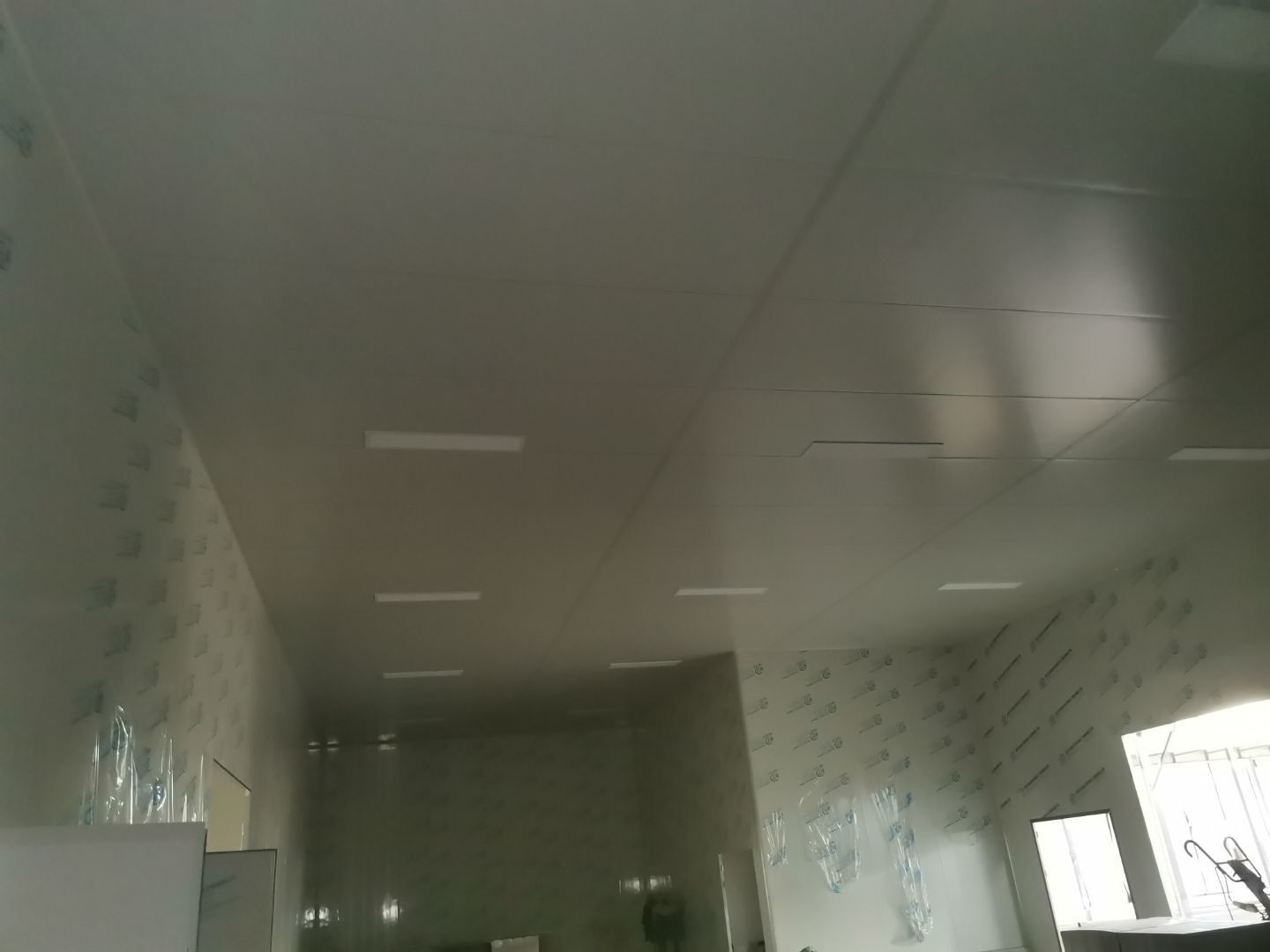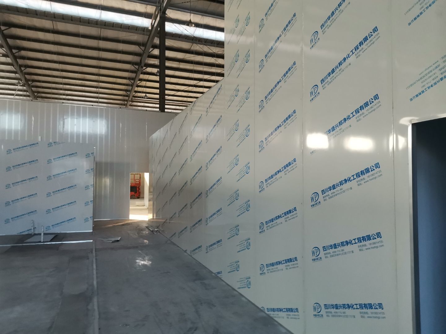 吊筋安裝完成,頂板安裝;彩鋼墻板安裝,門洞開設(shè)完成,水電燈具安裝,插座布線;彩鋼圓弧安裝