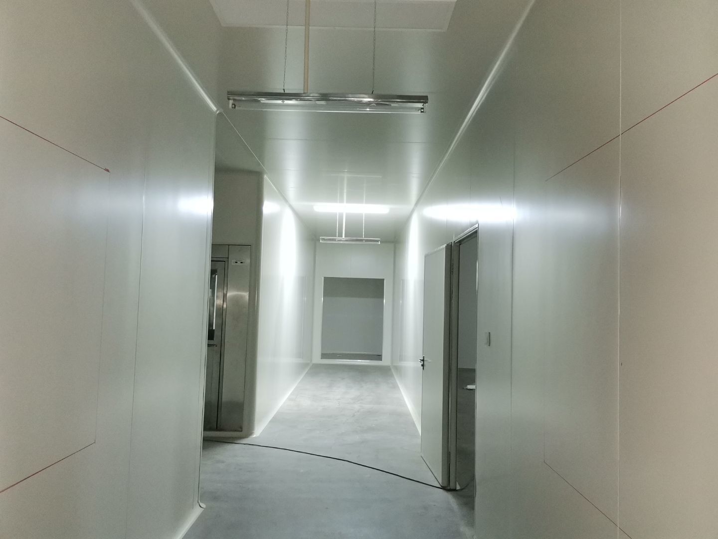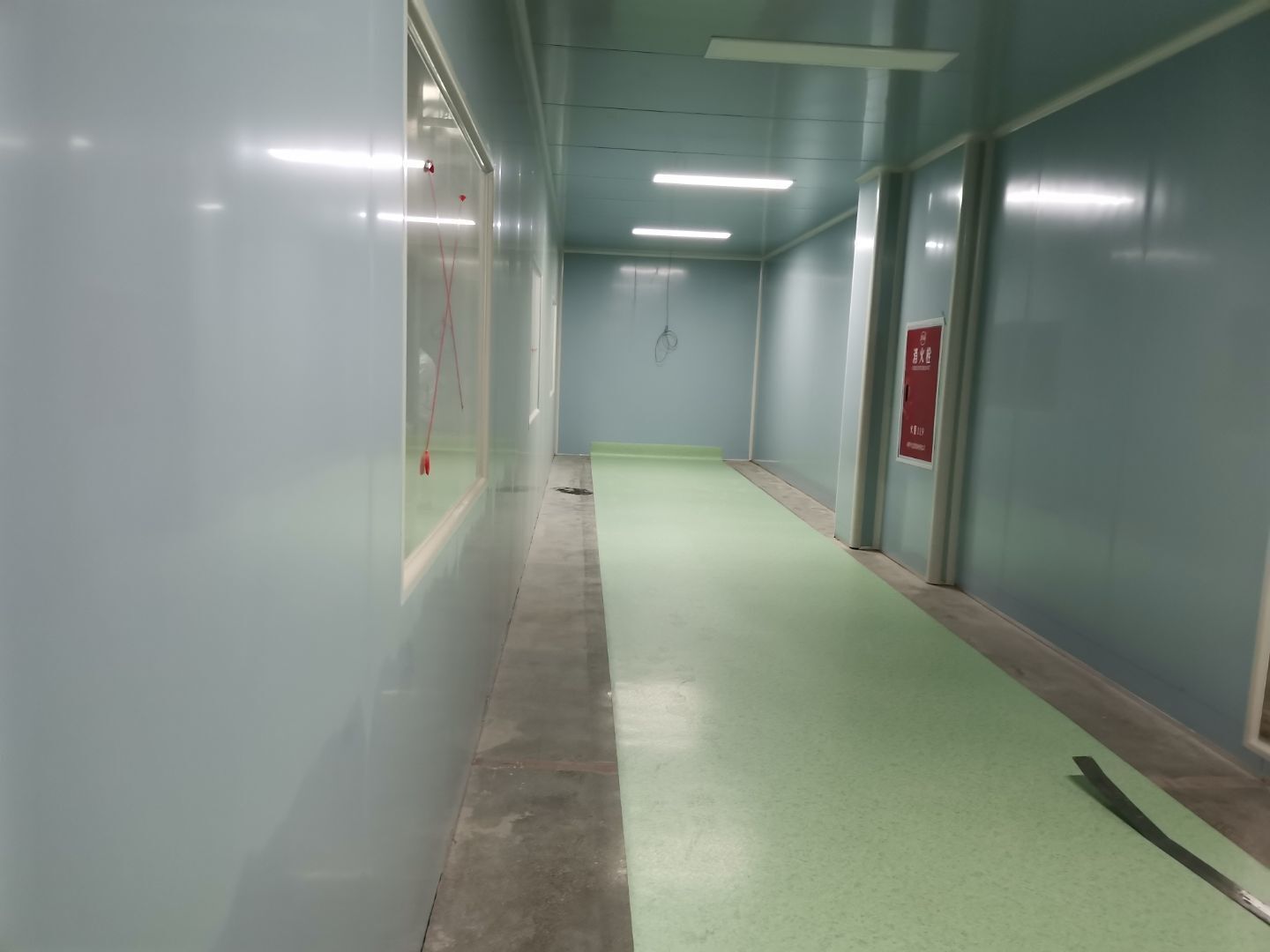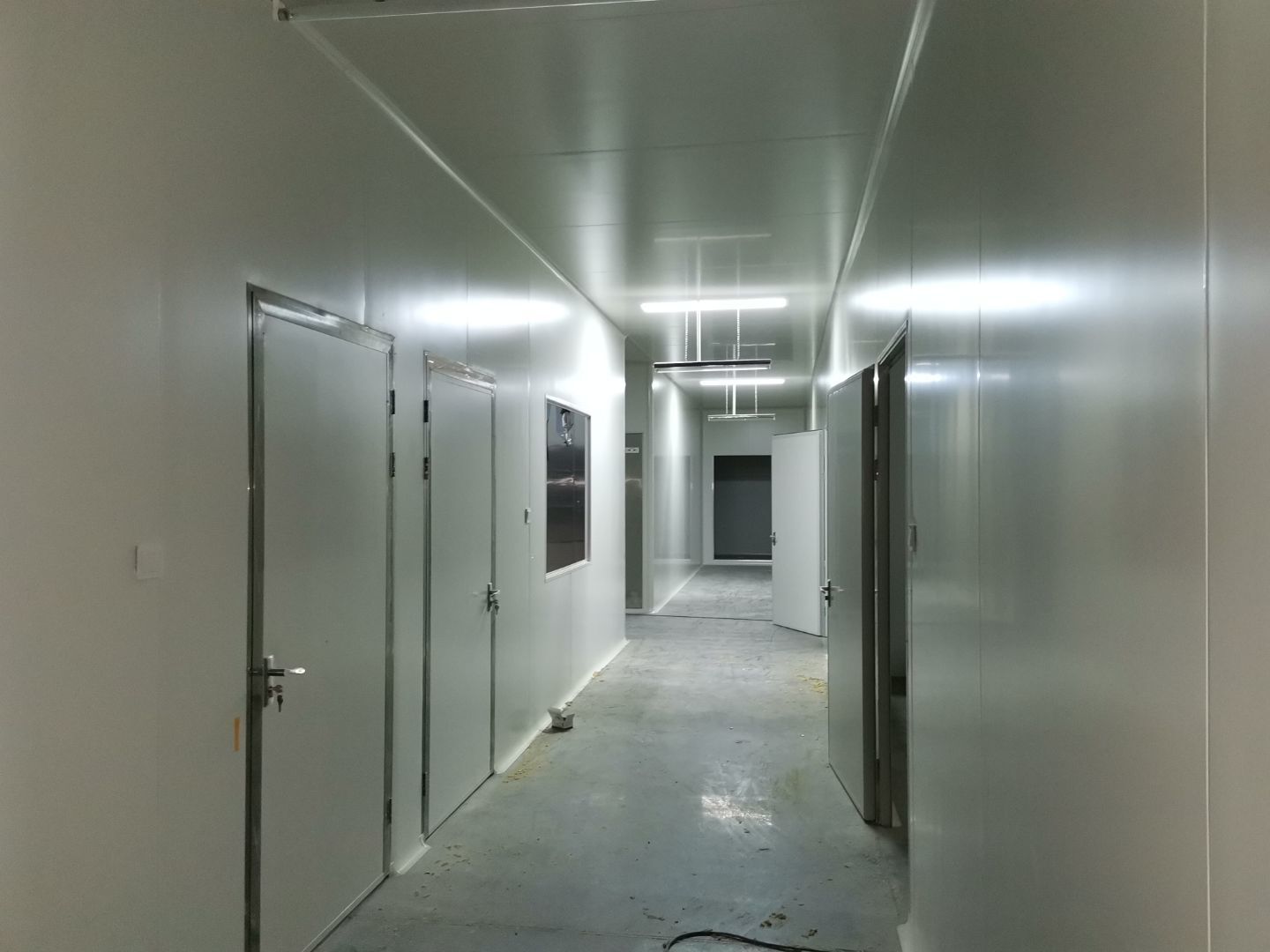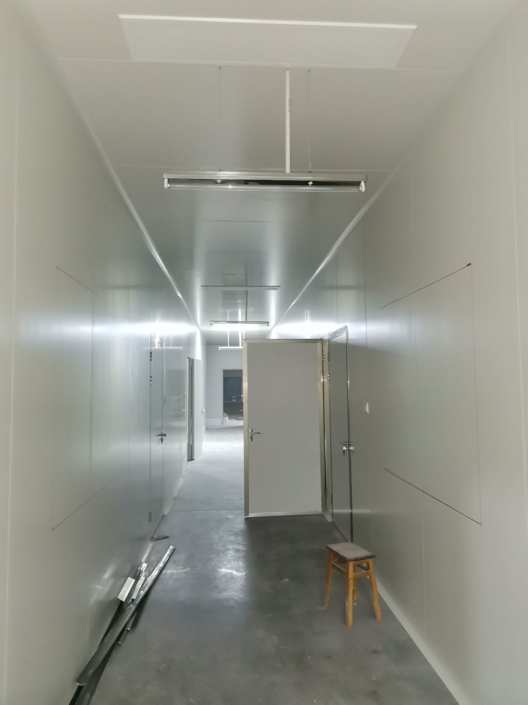 吊筋安裝完成,頂板安裝;彩鋼墻板安裝,門洞開設(shè)完成,水電燈具安裝,插座布線;彩鋼圓弧安裝