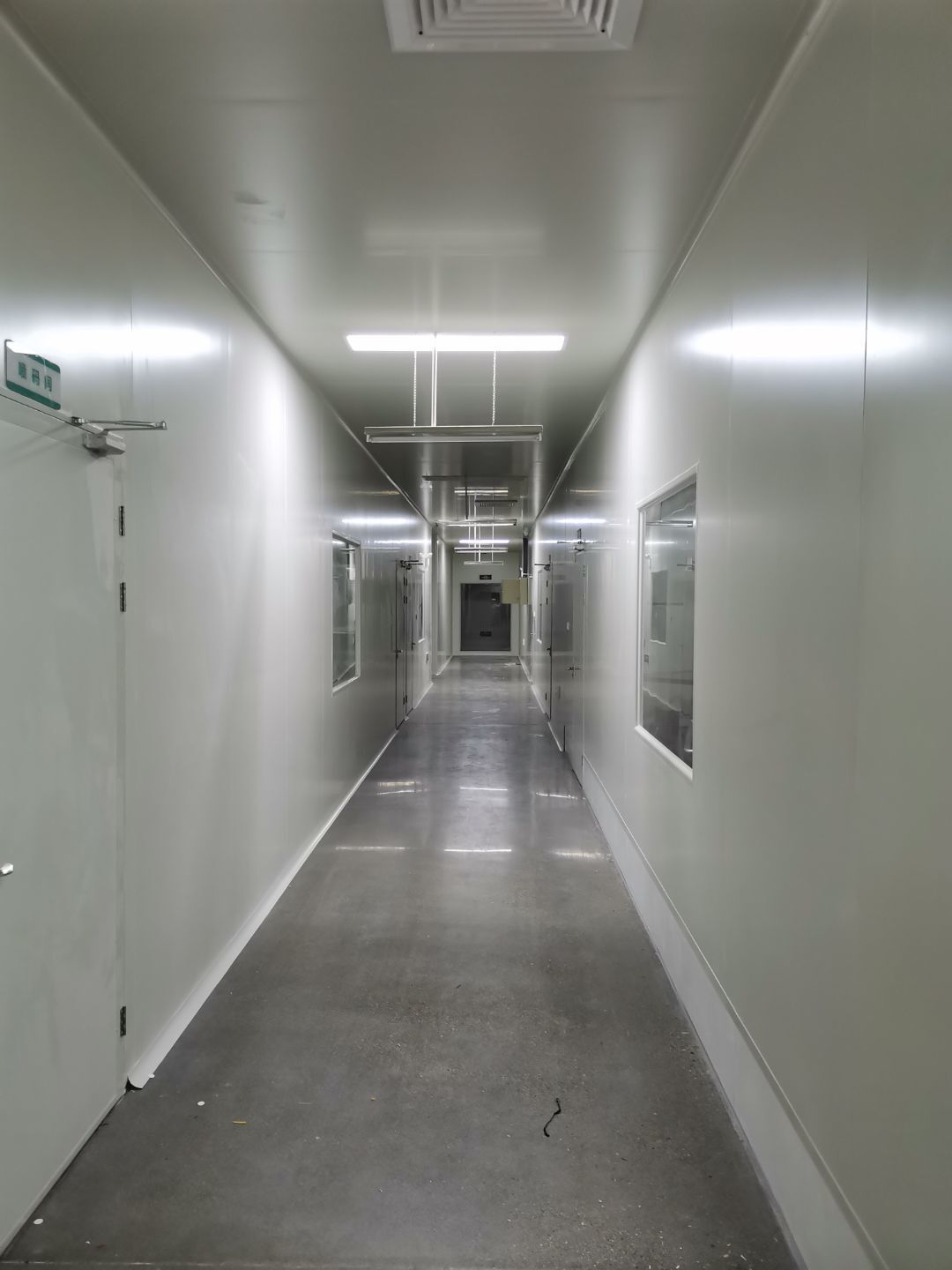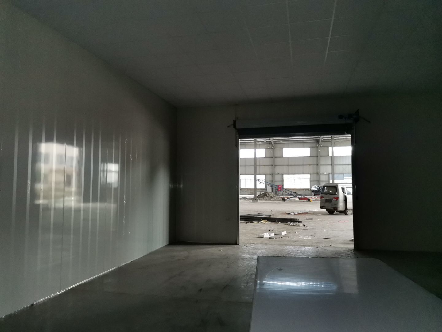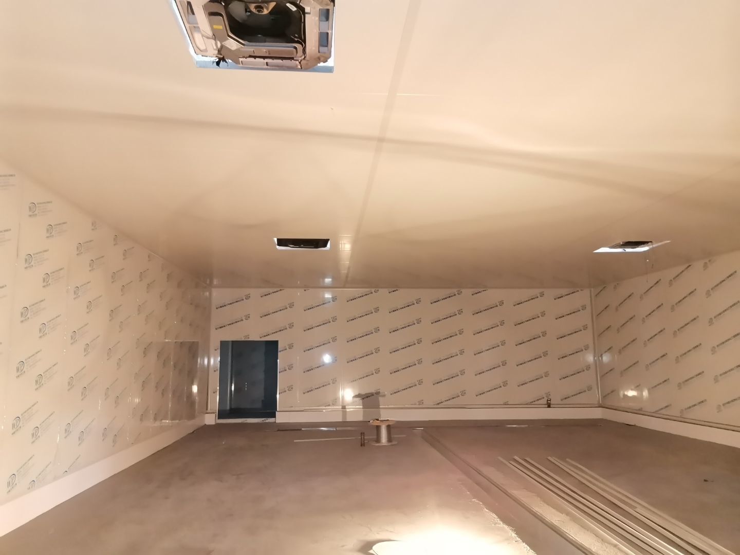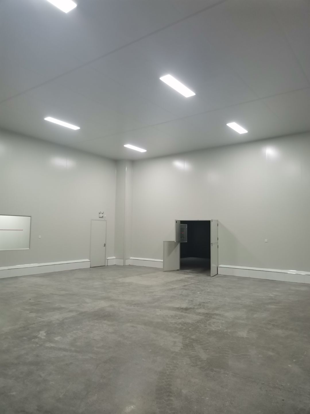 吊筋安裝完成,頂板安裝;彩鋼墻板安裝,門洞開設(shè)完成,水電燈具安裝,插座布線;彩鋼圓弧安裝
