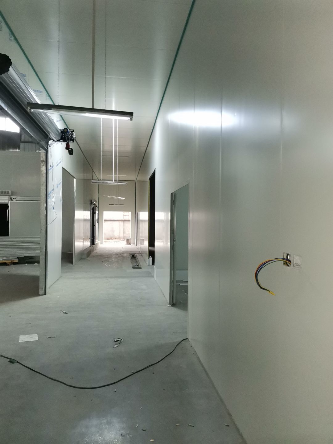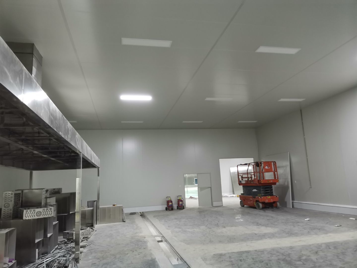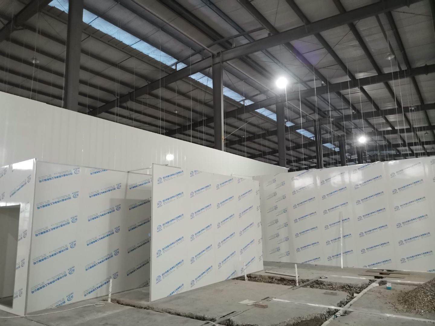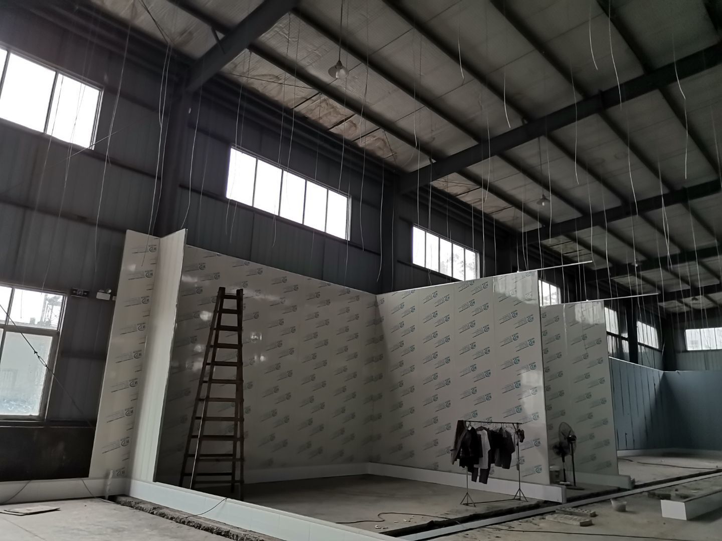 1、 吊筋安裝完成70%,頂板安裝完成70%; 2、彩鋼墻板安裝完成95%,門洞開設(shè)完成90%,自制門框下料完成100%; 3、地坪打磨第三遍完成100%; 4、水電燈具安裝完成90%,插座定位開孔完成100; 5、彩鋼圓弧安裝完成70%; 6、原水溝混凝土面層修補完成100%; 7、墻板撕膜打膠完成45%; 8、冷風(fēng)機主機安裝完成100%,風(fēng)管安裝完成15%; 9、場地清理。