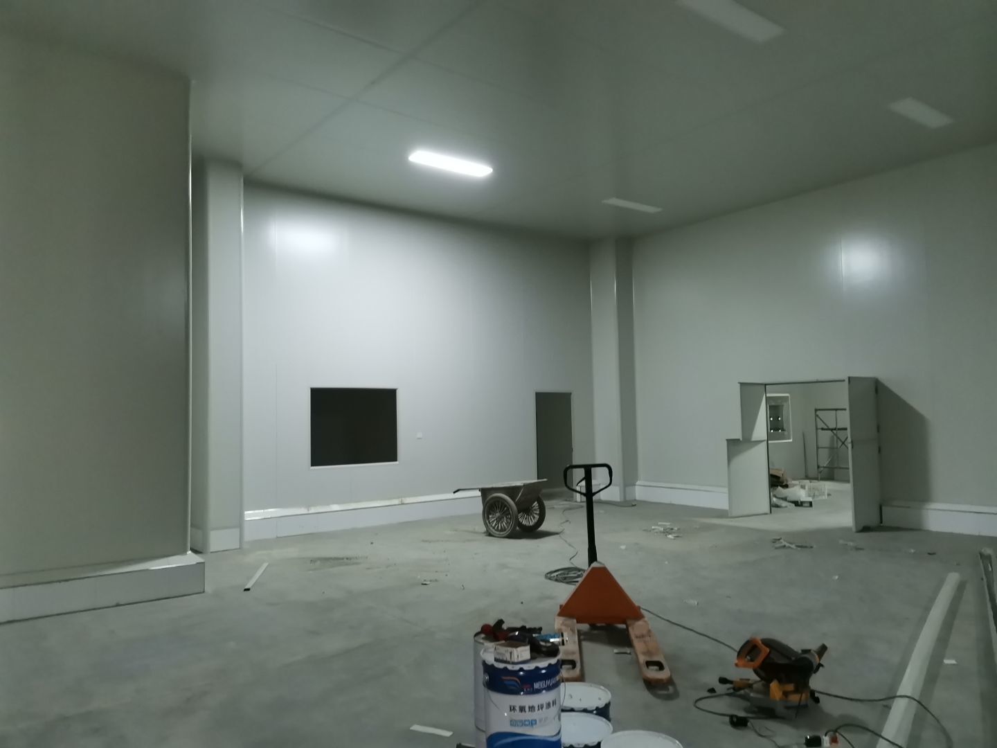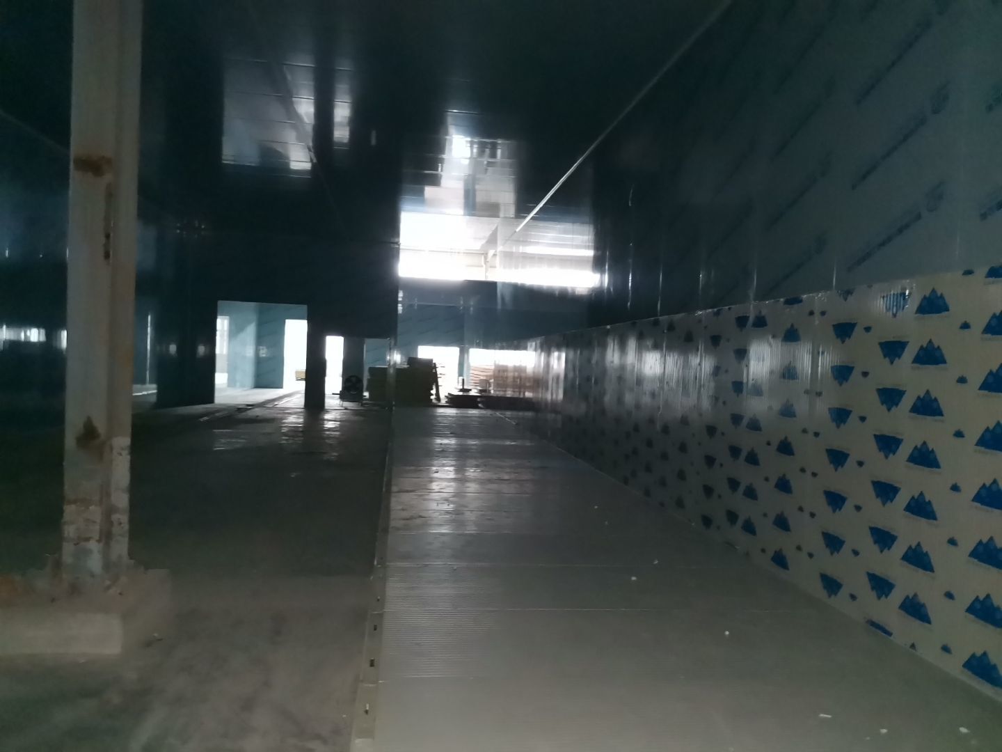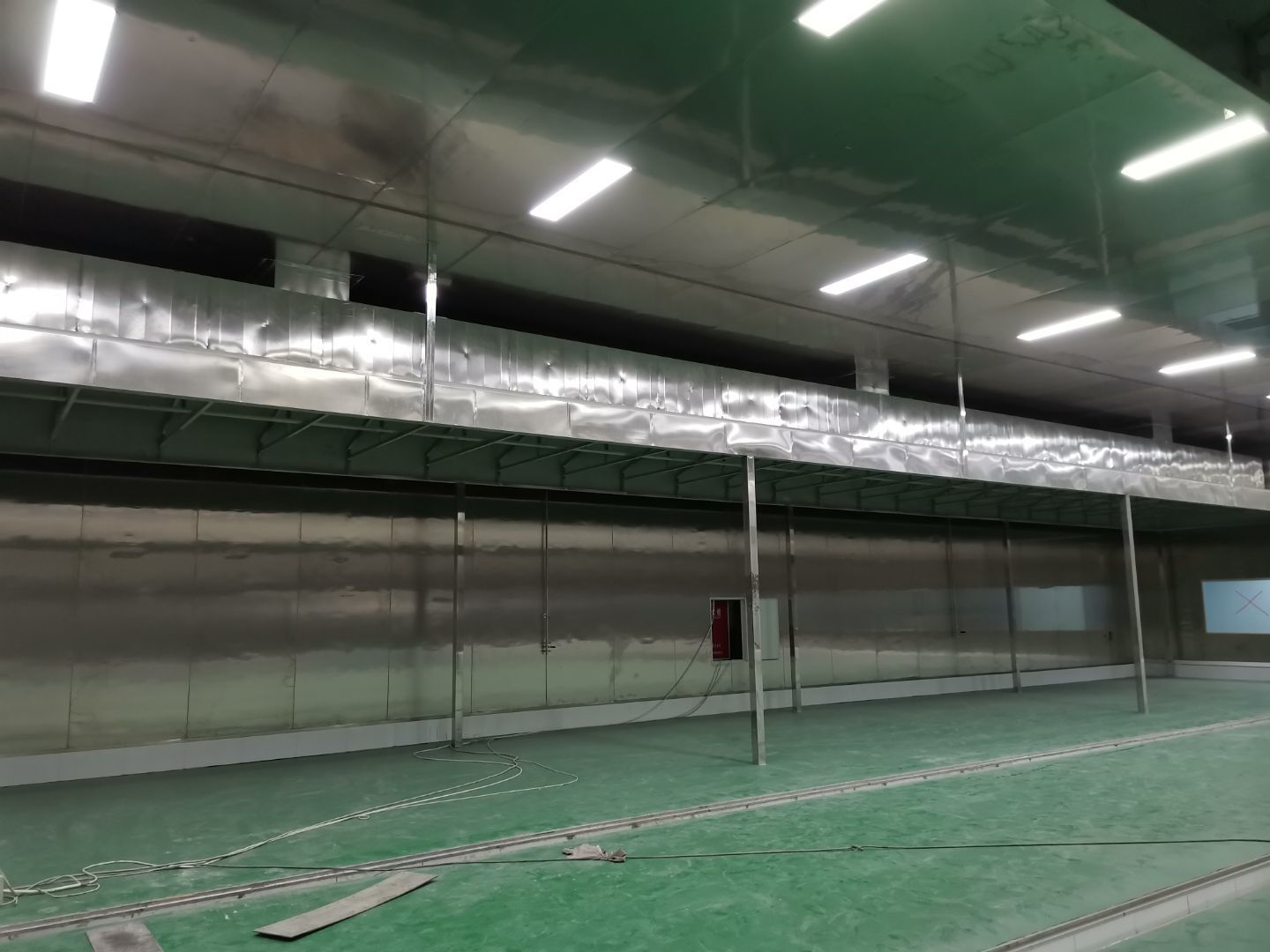 1、 吊筋安裝完成70%,頂板安裝完成70%; 2、彩鋼墻板安裝完成95%,門洞開設(shè)完成90%,自制門框下料完成100%; 3、地坪打磨第三遍完成100%; 4、水電燈具安裝完成90%,插座定位開孔完成100; 5、彩鋼圓弧安裝完成70%; 6、原水溝混凝土面層修補完成100%; 7、墻板撕膜打膠完成45%; 8、冷風(fēng)機主機安裝完成100%,風(fēng)管安裝完成15%; 9、場地清理。