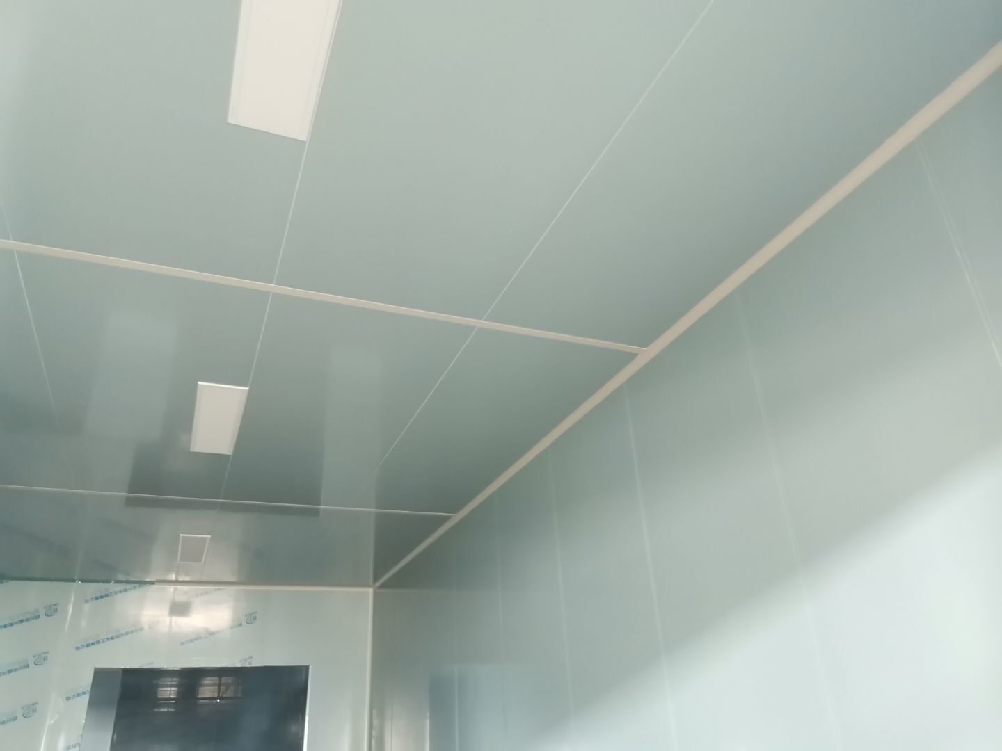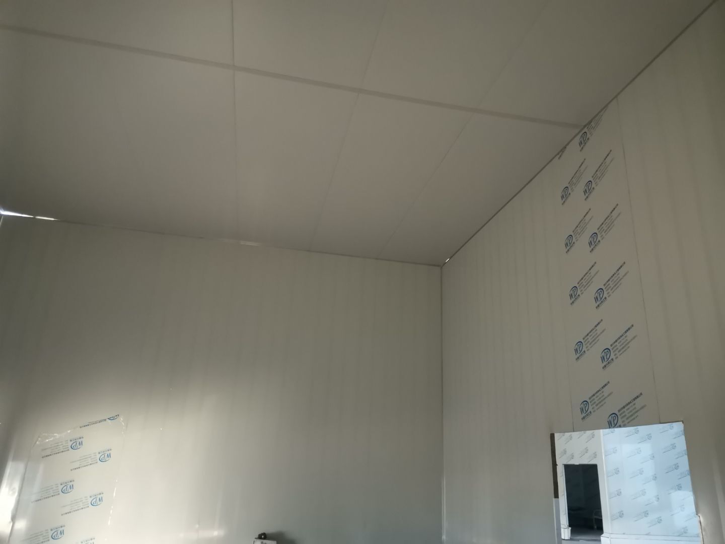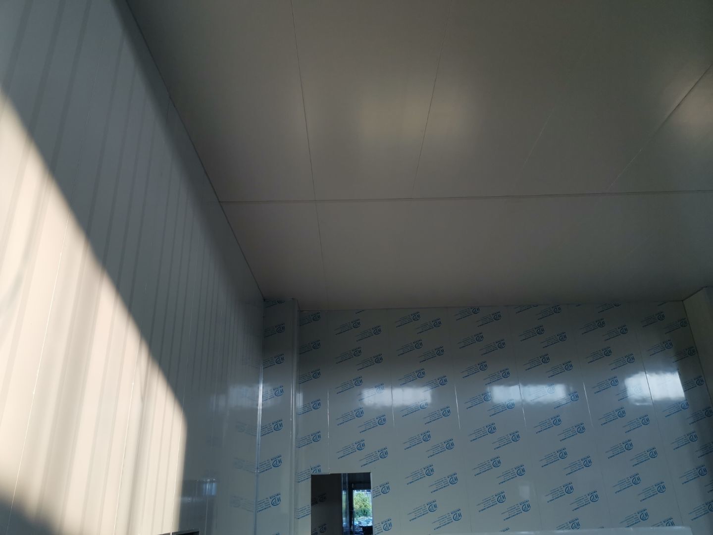 吊筋安裝完成,頂板安裝完成;彩鋼墻板安裝完成,門洞開設(shè)完成,自制門框安裝;墻板撕膜打膠完成;場地清理。