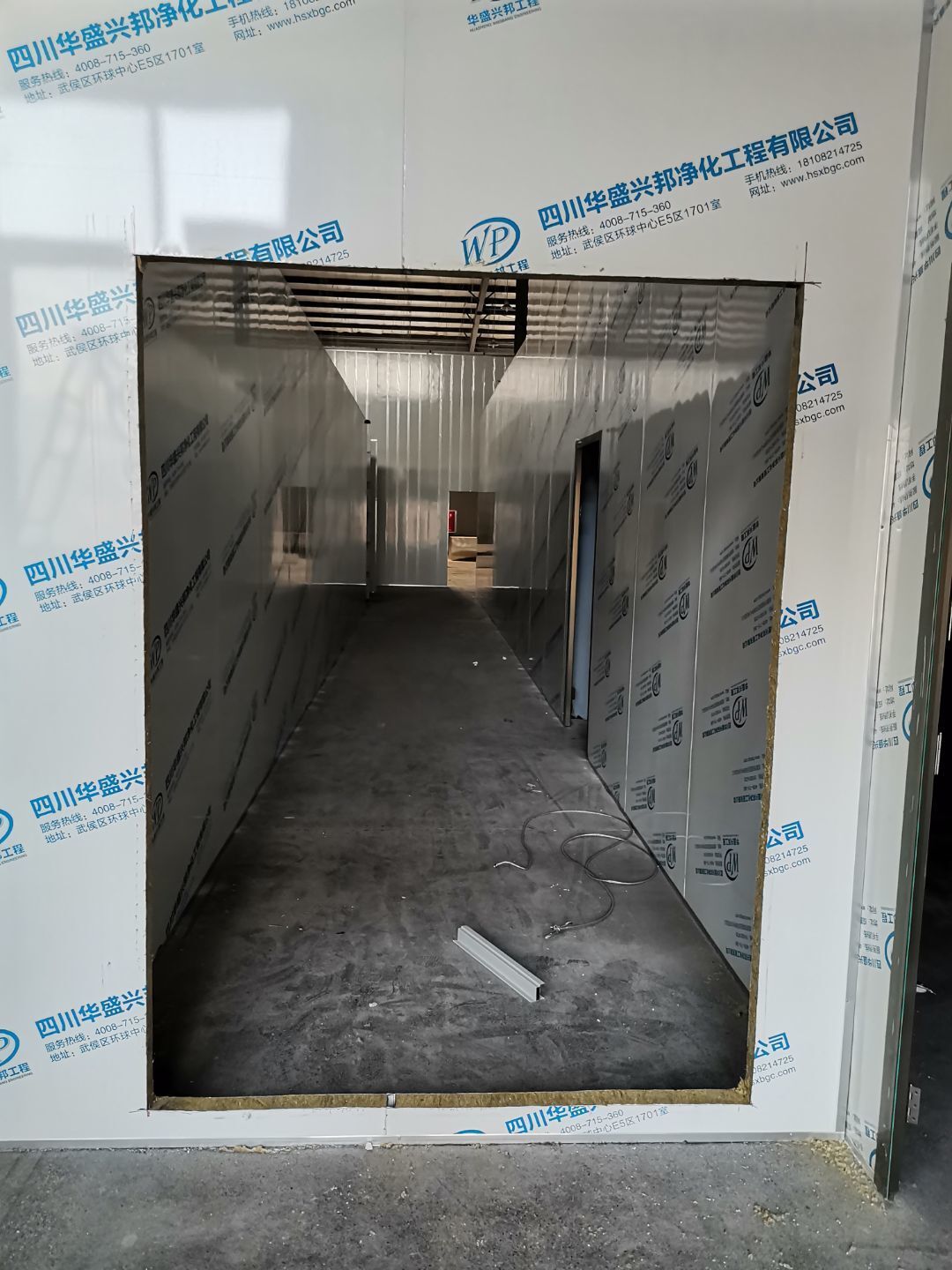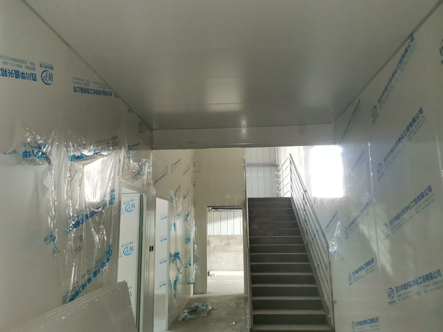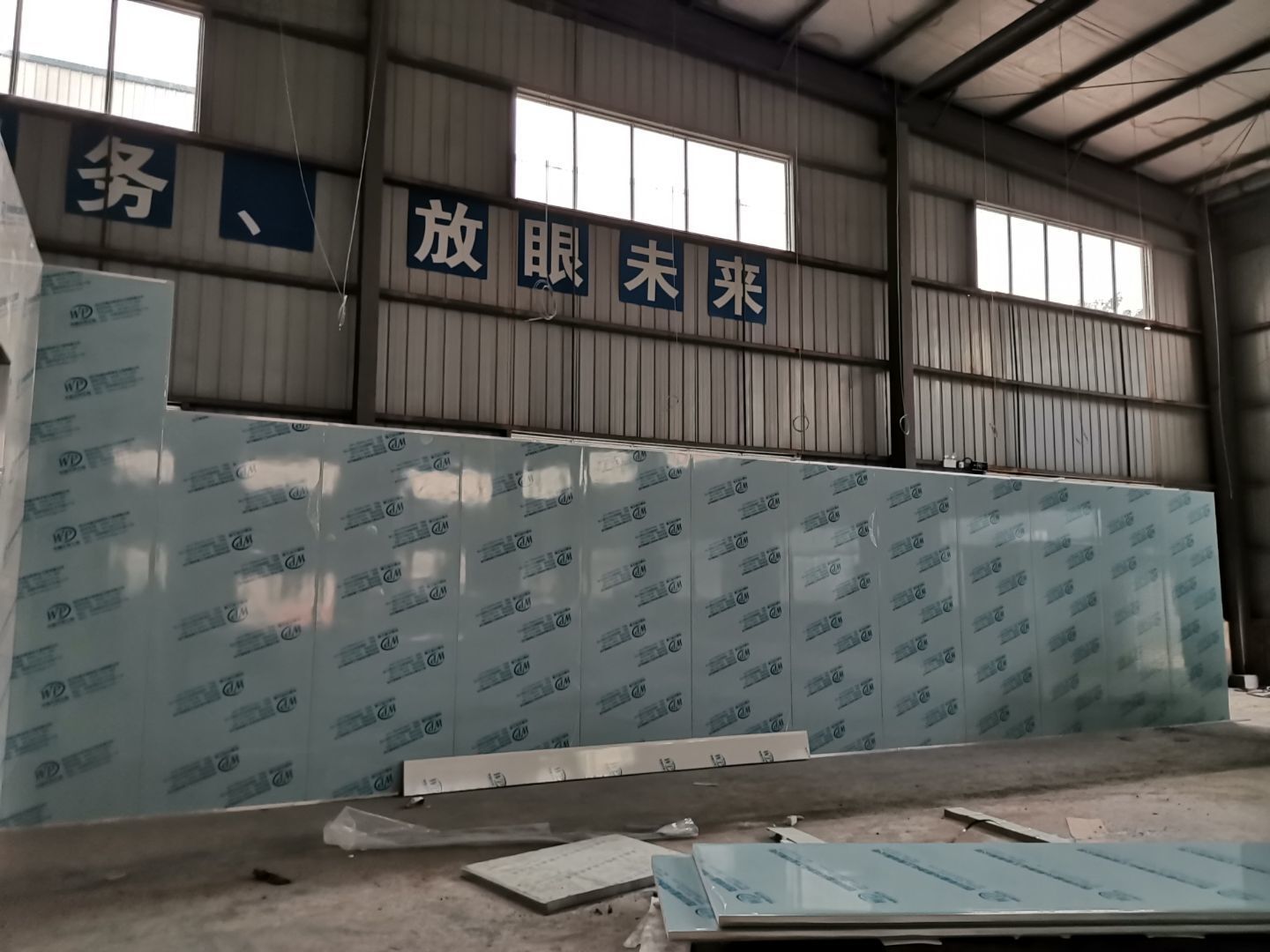 吊筋安裝完成,頂板安裝完成;彩鋼墻板安裝完成,門洞開設(shè)完成,自制門框安裝;墻板撕膜打膠完成;場地清理。