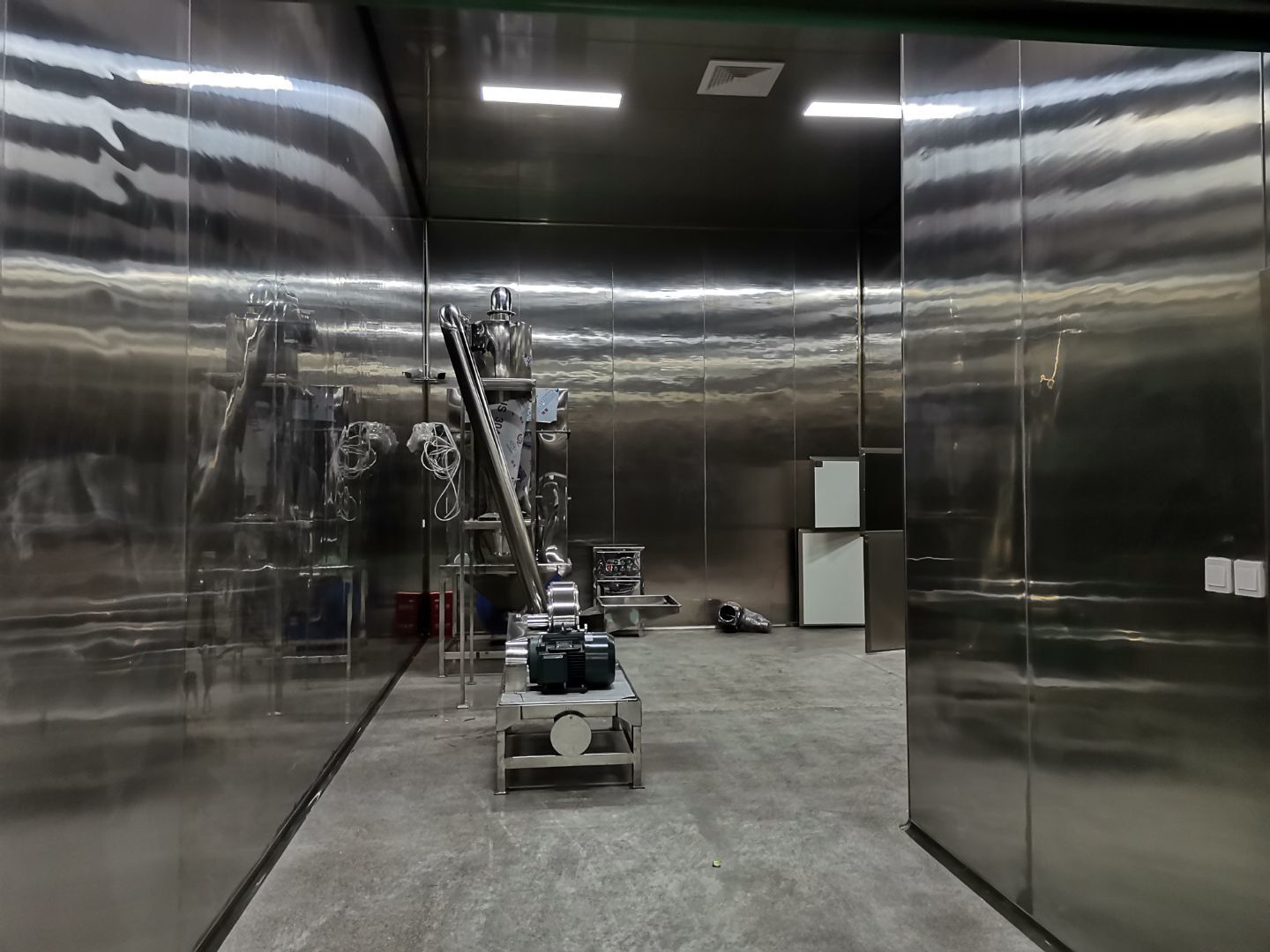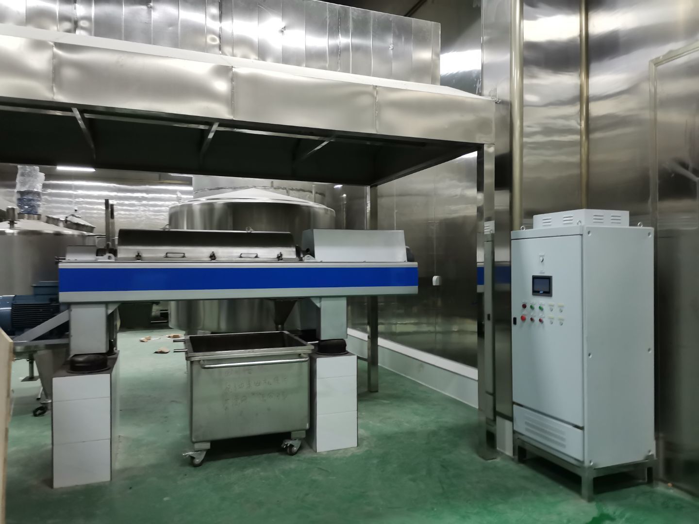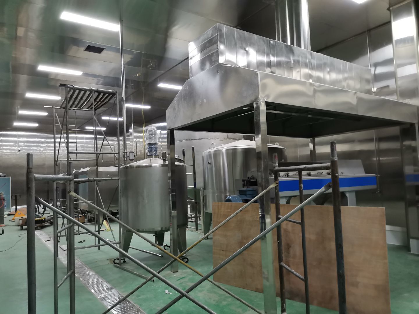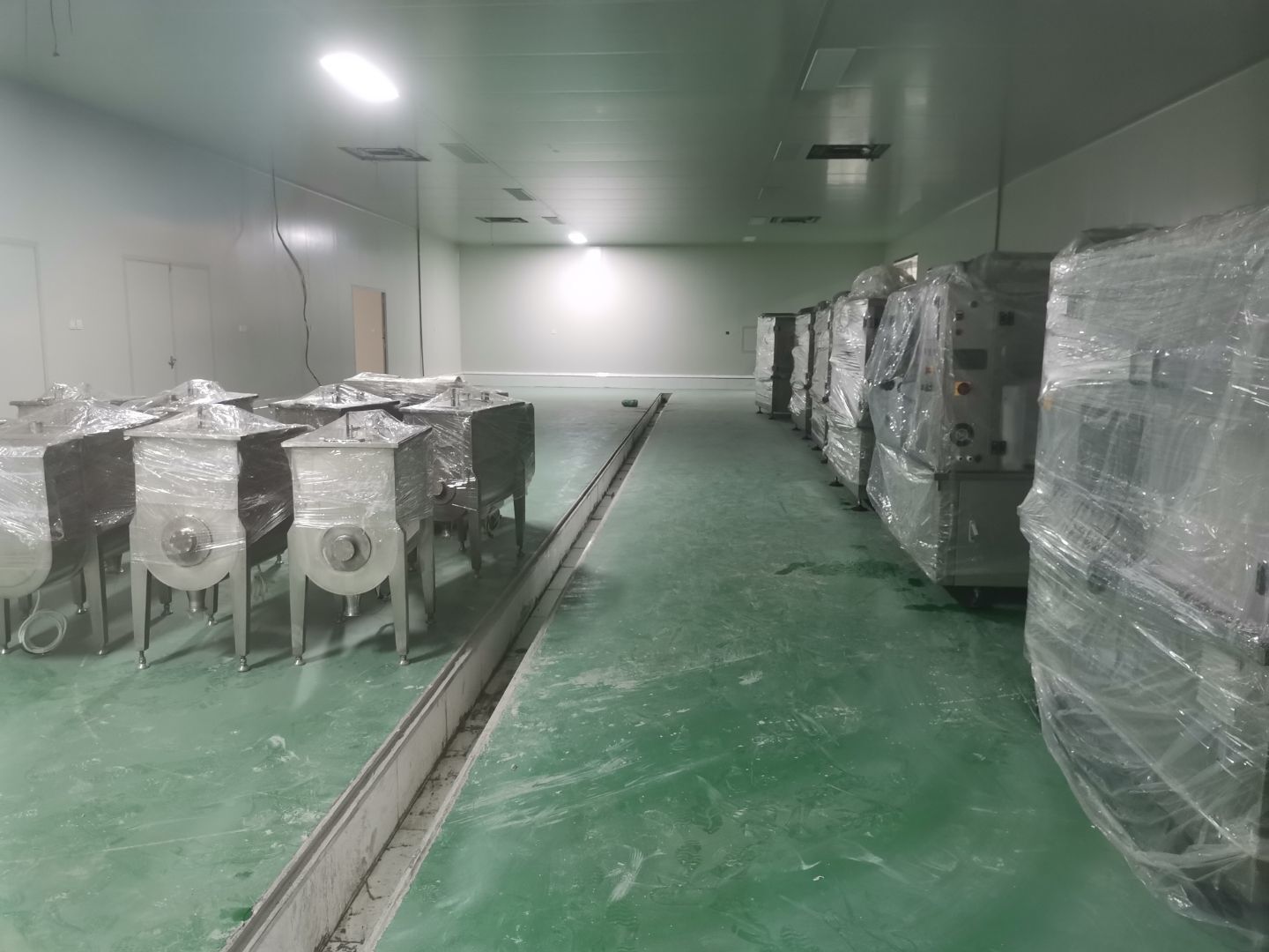1、彩鋼墻板安裝完成97%,門洞開設(shè)完成95%,自制門框安裝完成95%,原材庫板面加高完成; 2、內(nèi)包間、粉料間、炒制間地坪面漆完成100%; 3、水電燈具安裝完成100%,插座布線完成100%,照明插座回路線布設(shè)完成100%,排風(fēng)扇安裝完成; 4、彩鋼圓弧安裝完成,窗洞開設(shè)完成100%,玻璃安裝完成100%; 5、原水溝混凝土面層固化完成90%,參觀通道地面基層處理完成100%,PVC地面完成100%; 6、墻板撕膜打膠完成100%; 7、場地清理。