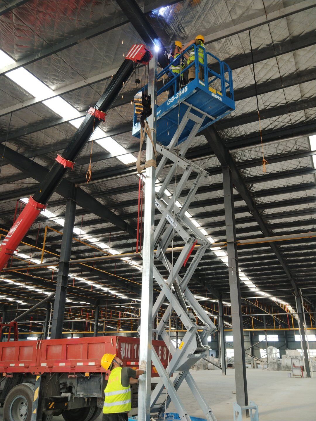 1、二次吊掛鋼構立柱放線定位; 2、鋼立柱下料焊接完成,柱腳板安裝完成; 3、臨電布設完成。