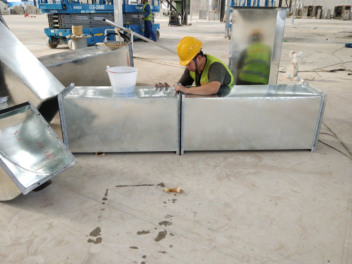1、風管主管半成品組裝完成; 2、風管主管清洗,打膠密封,吊裝施工
