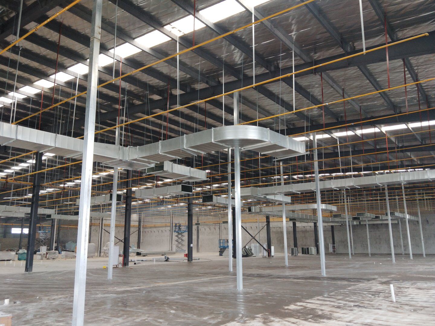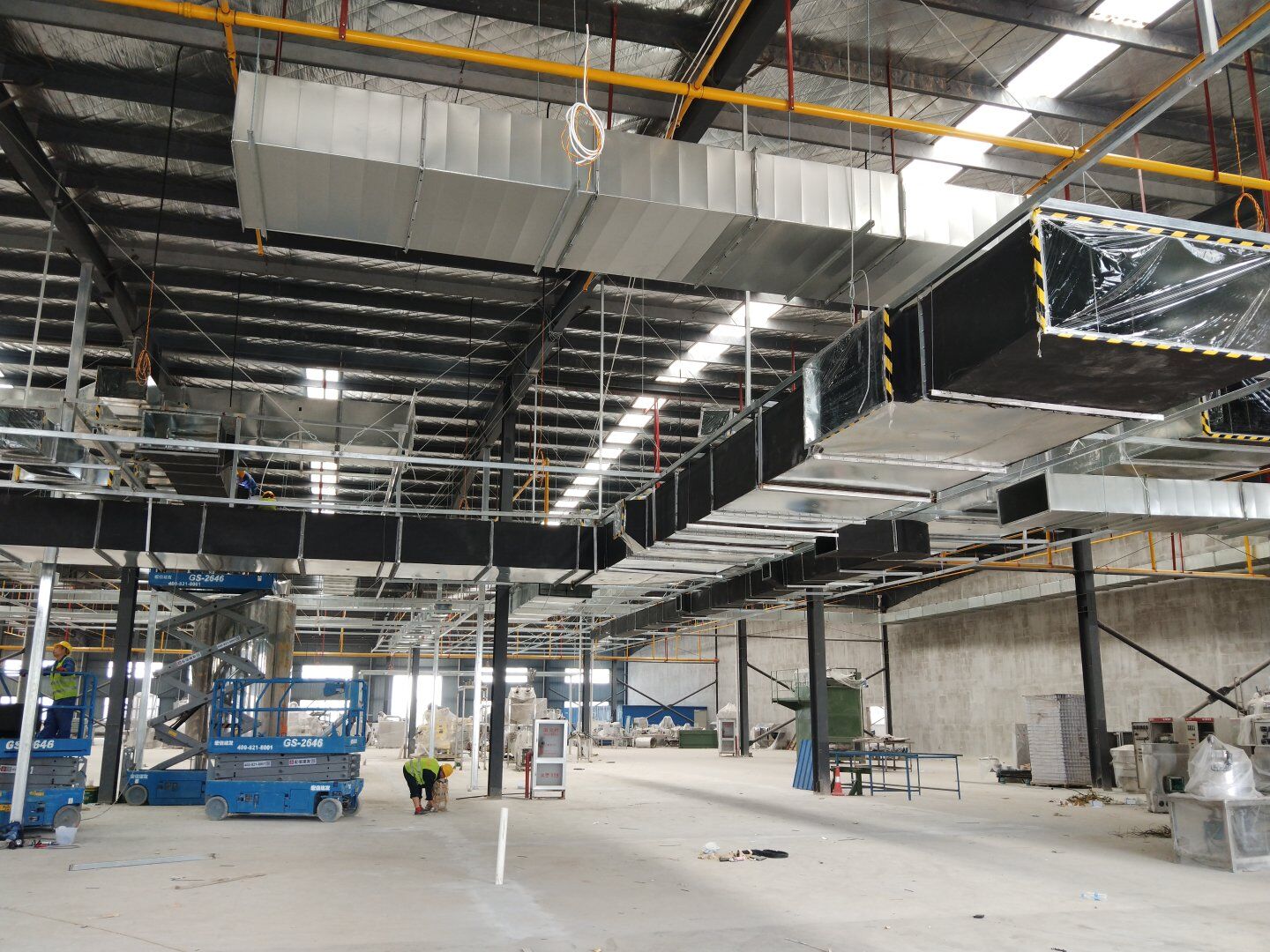 1,風管干管清洗,保溫及吊裝完成80%; 2,主風管保溫施工