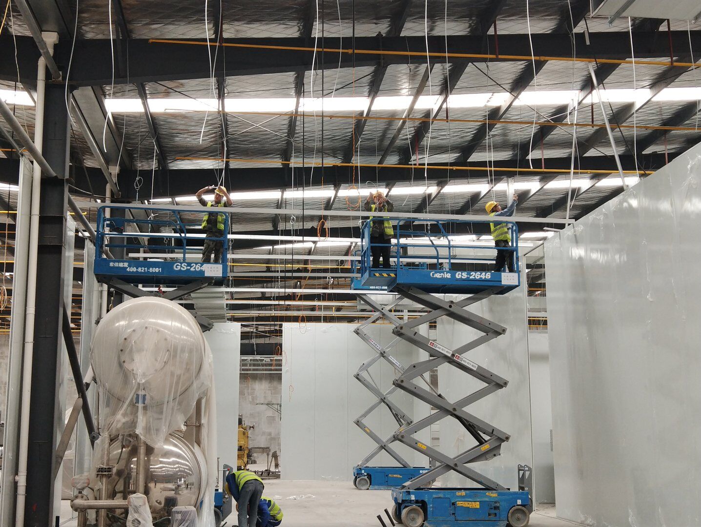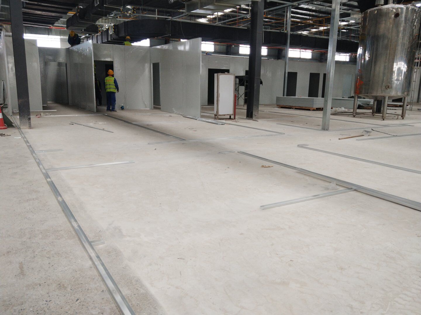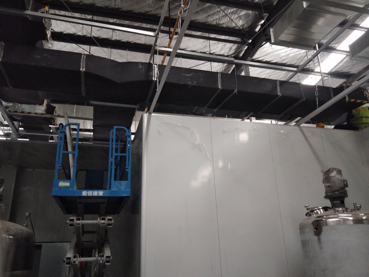 液體車間: 1、剩余風管拼裝完成80%;2、彩鋼板打膠完成95%;3、空調自控放線完成95%。