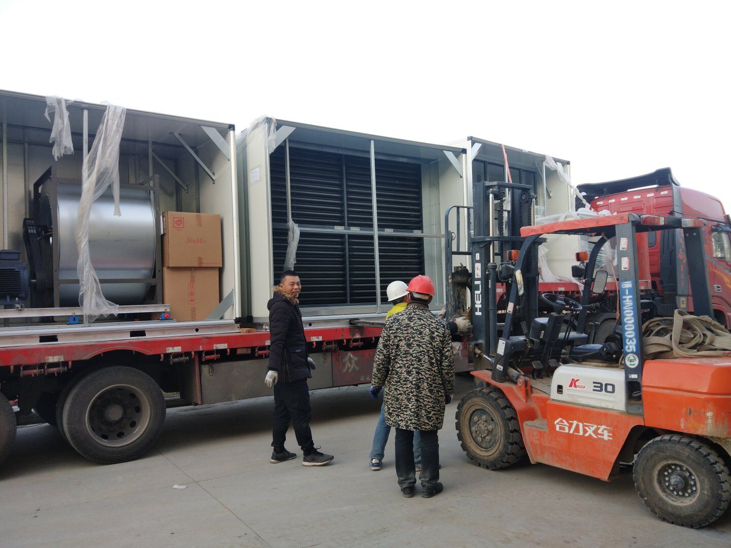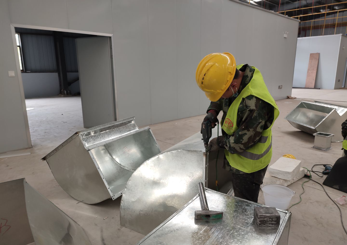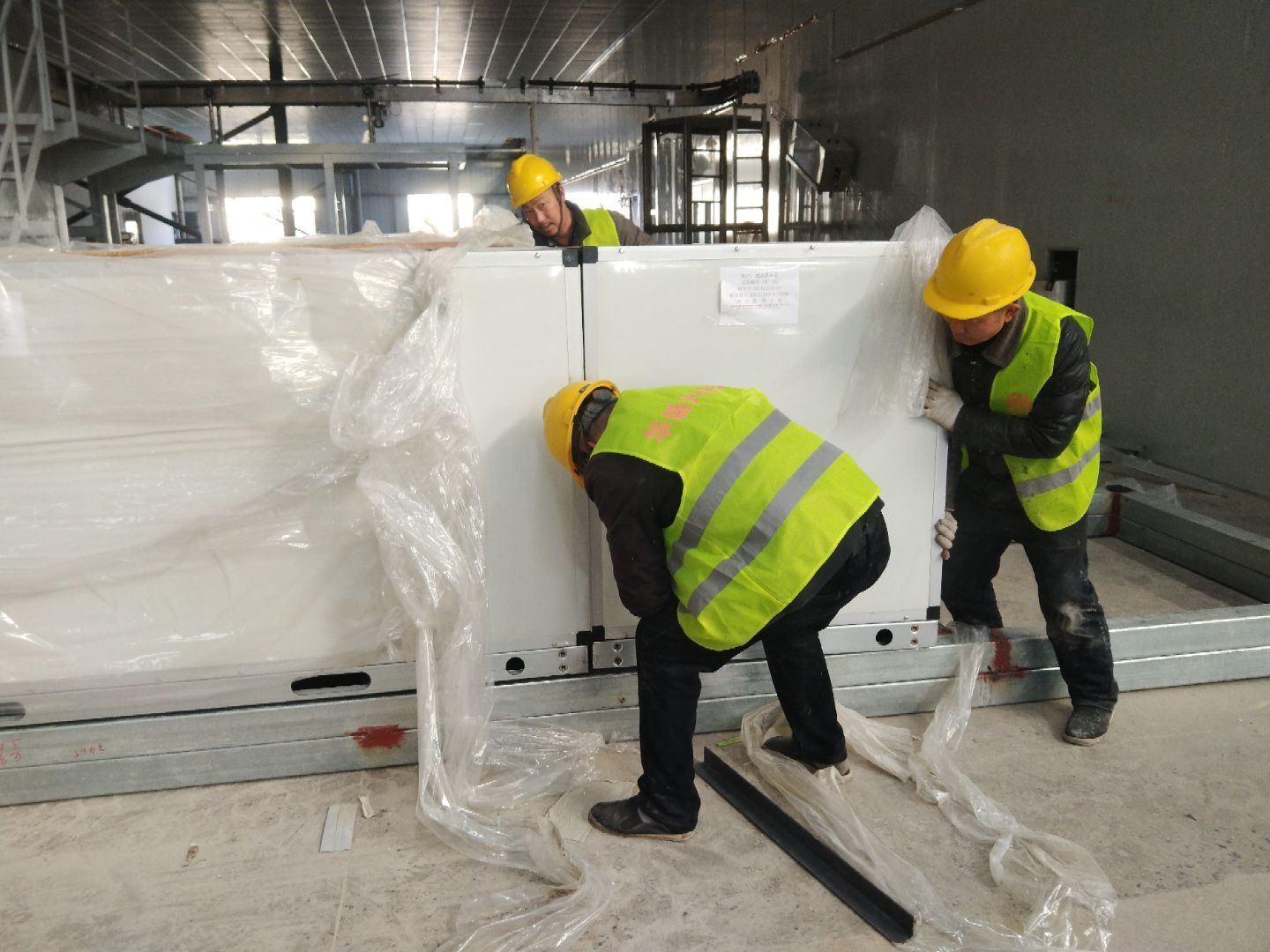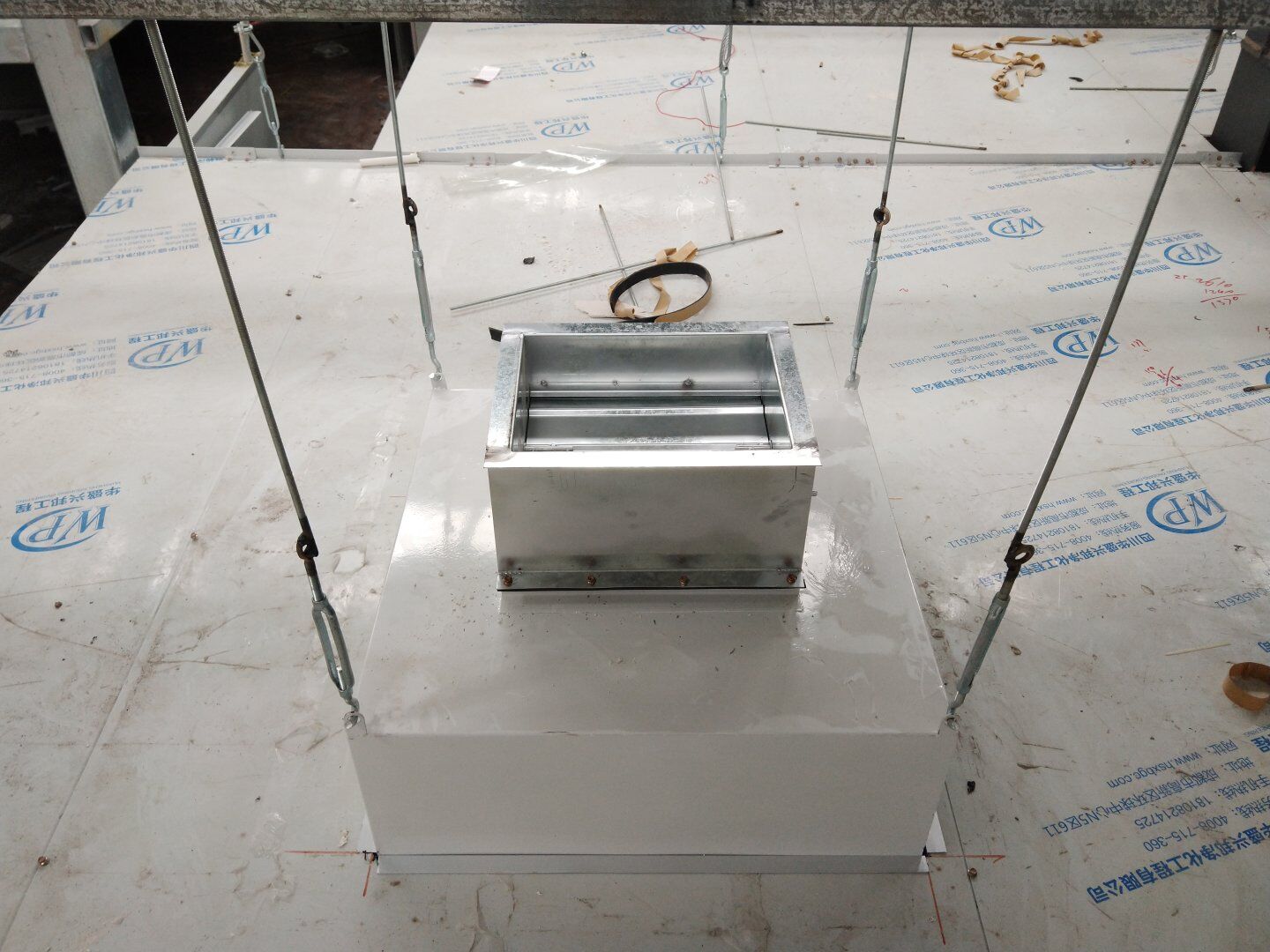液體車間: 1、剩余風管拼裝完成80%;2、彩鋼板打膠完成95%;3、空調自控放線完成95%。