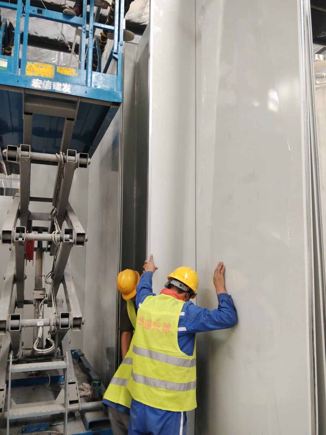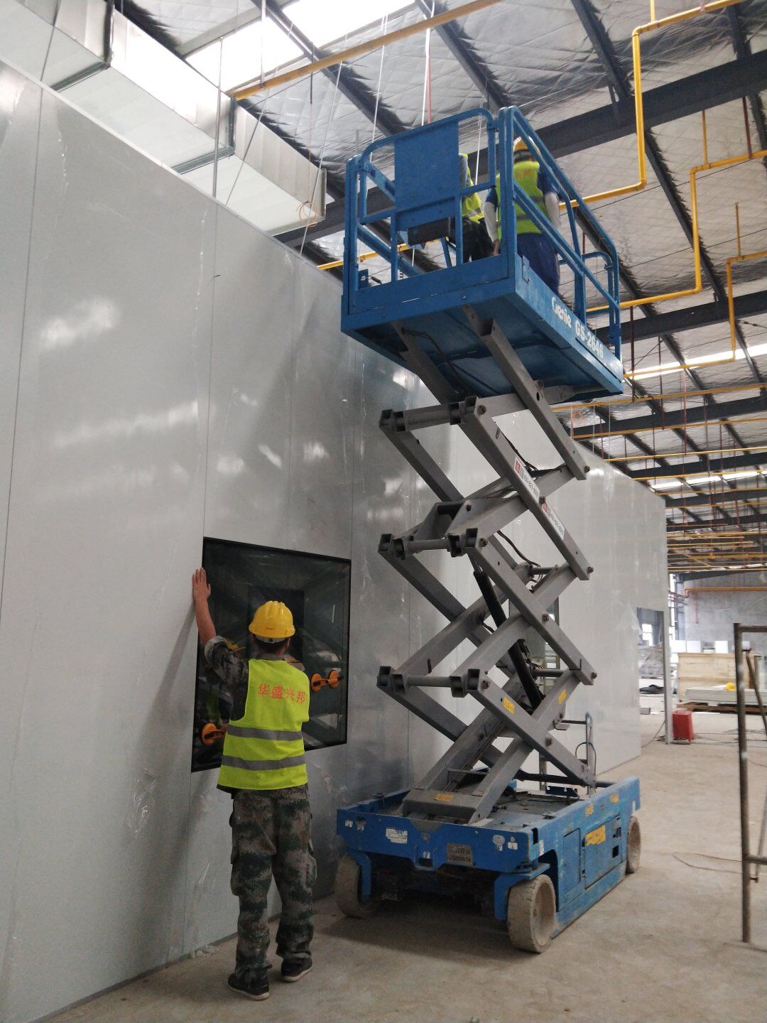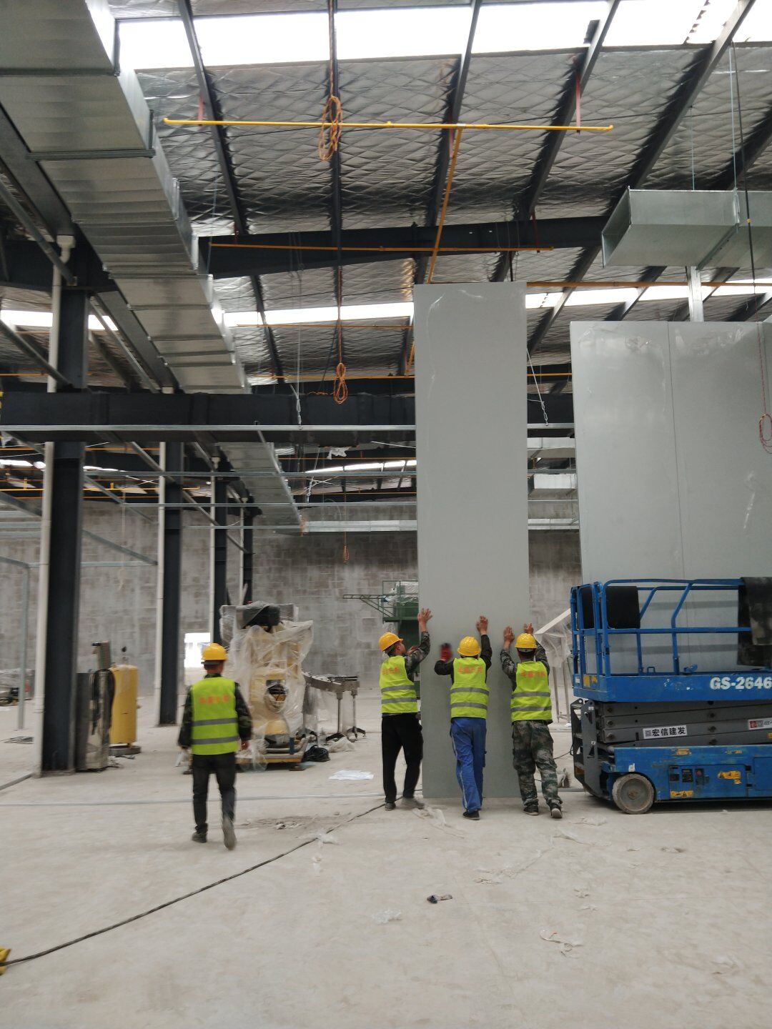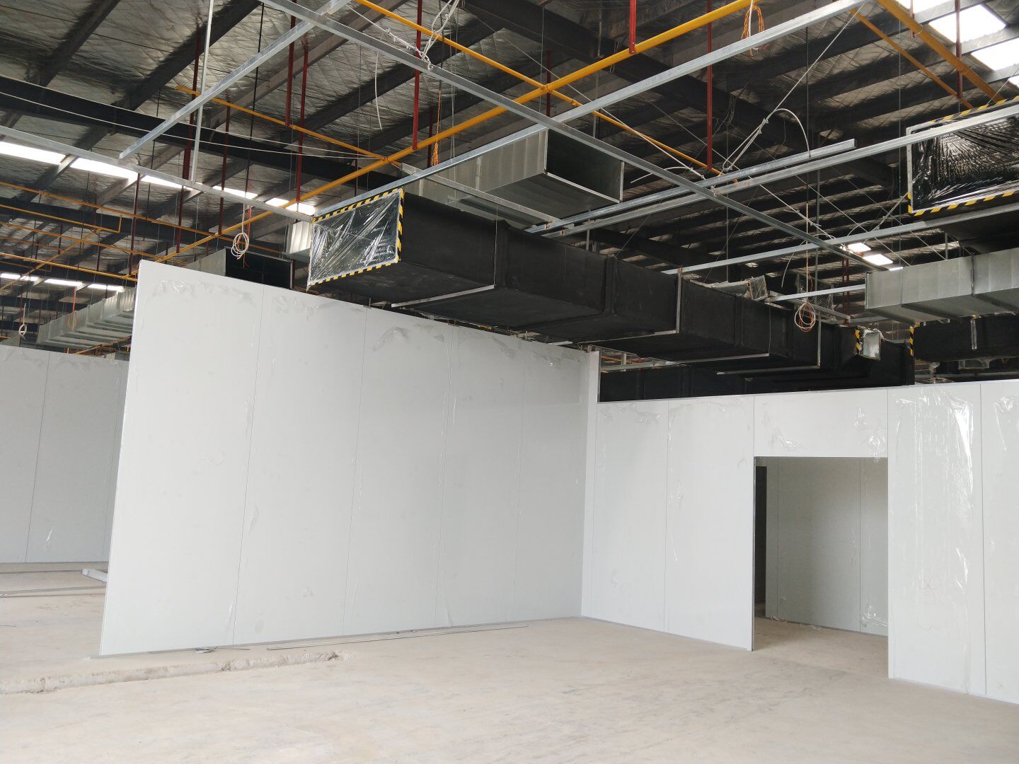 1,除預留設備通道外的彩鋼板墻板完成; 2,彩鋼板頂板完成80%。