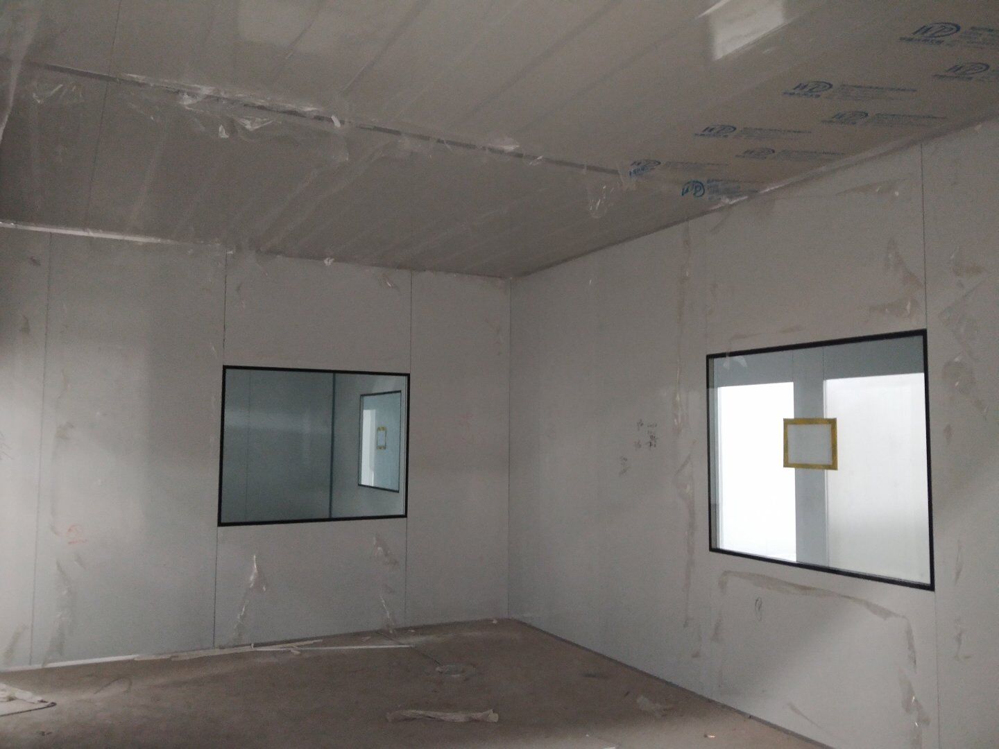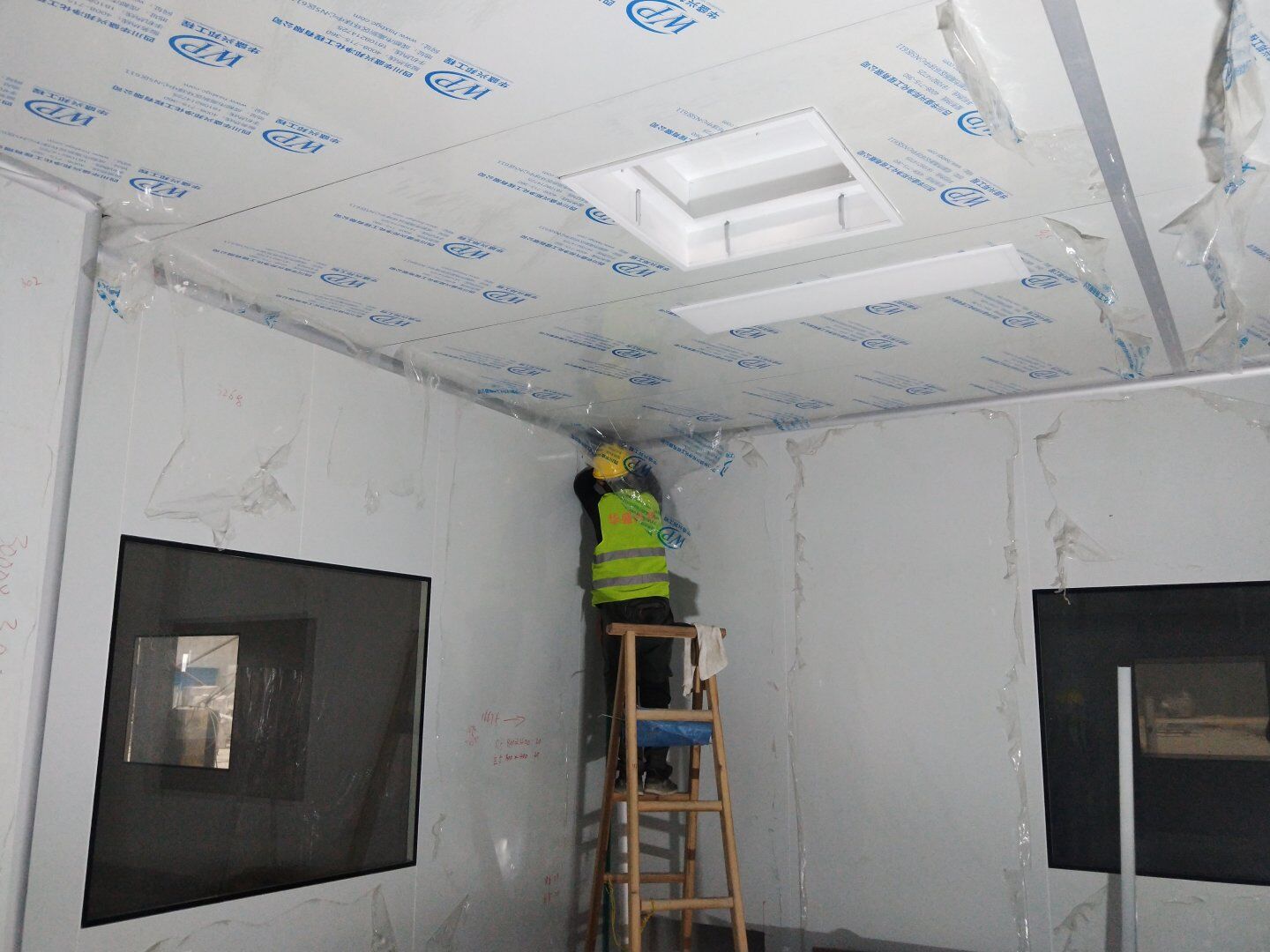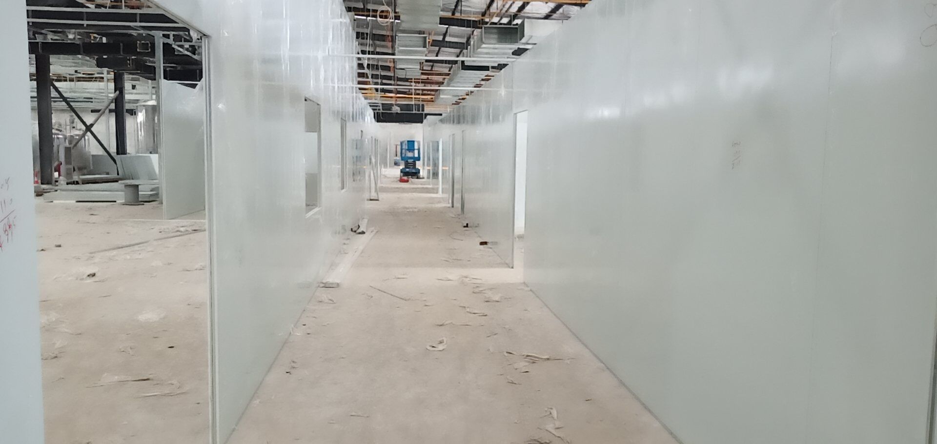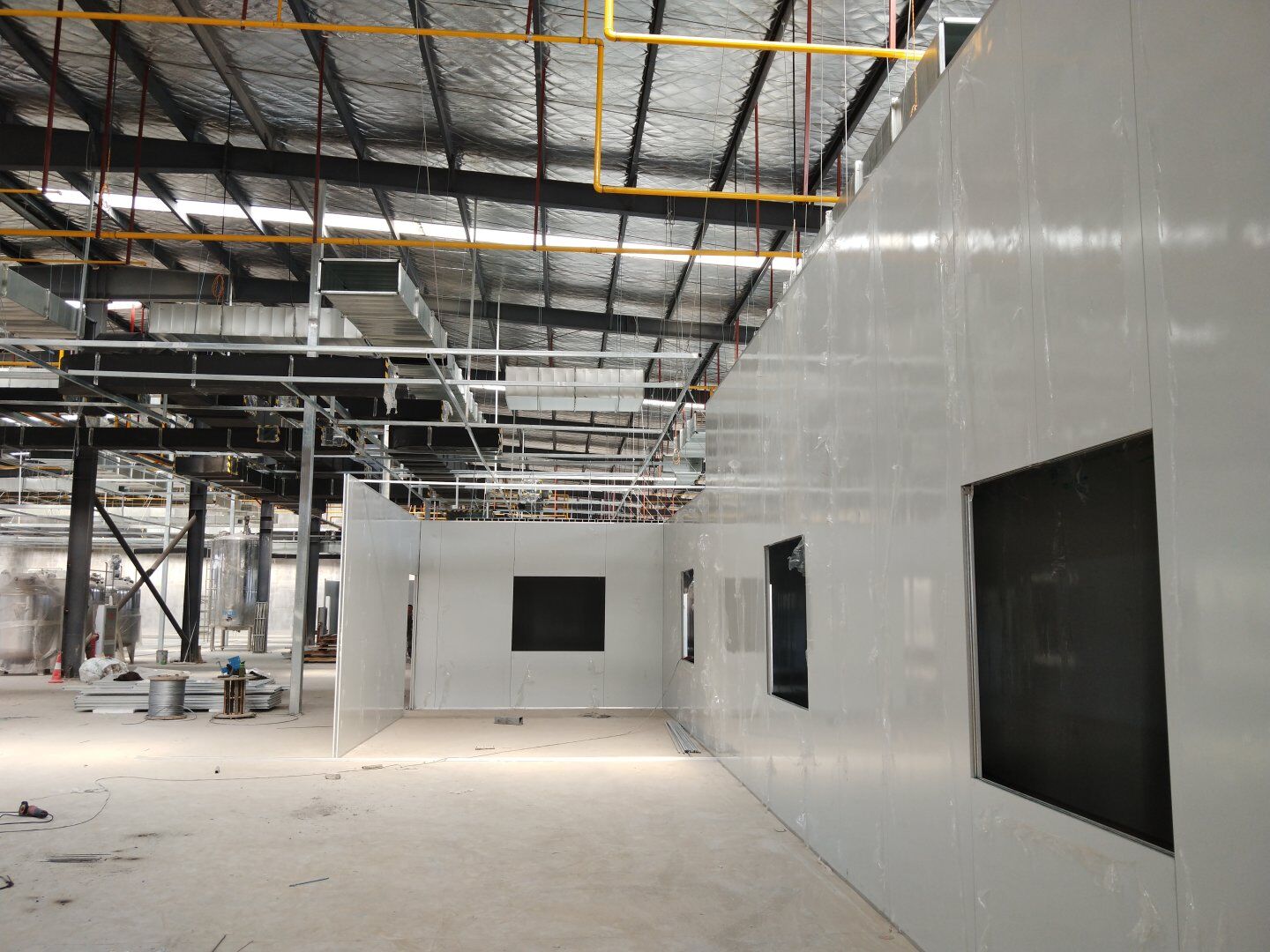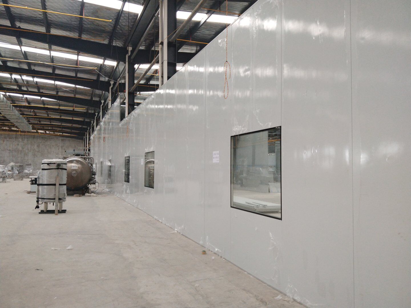 1,彩鋼板墻板完成75% 2,回風夾道安裝,撕膜,打膠完成15% 3,潔凈窗安裝完成60%。