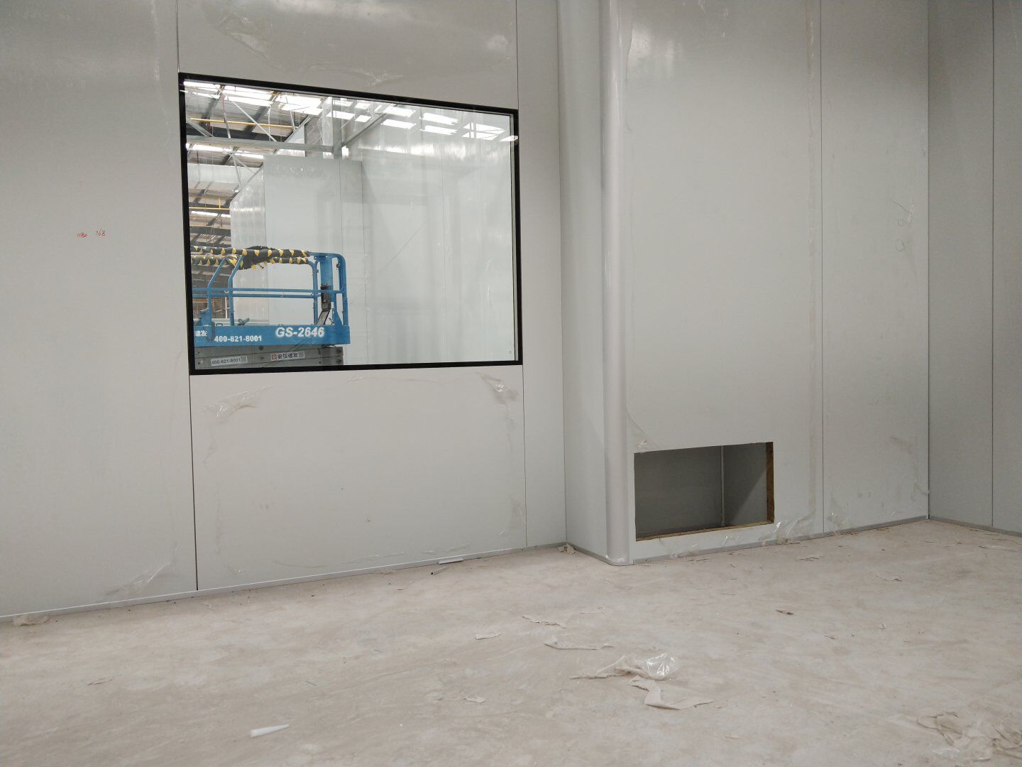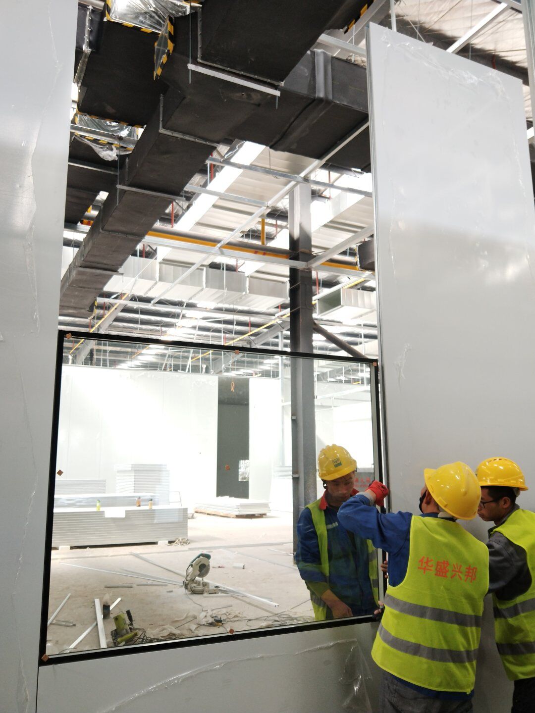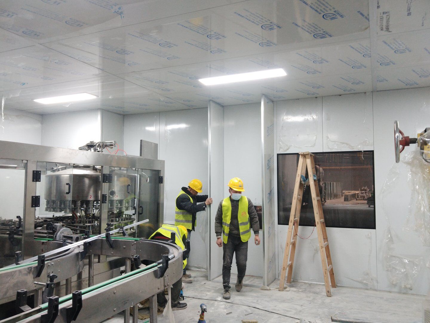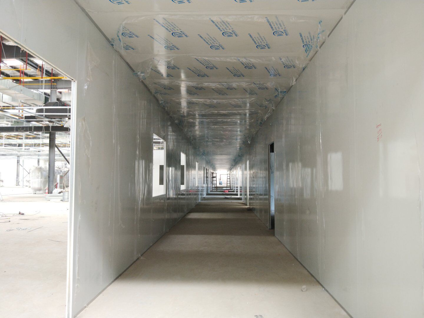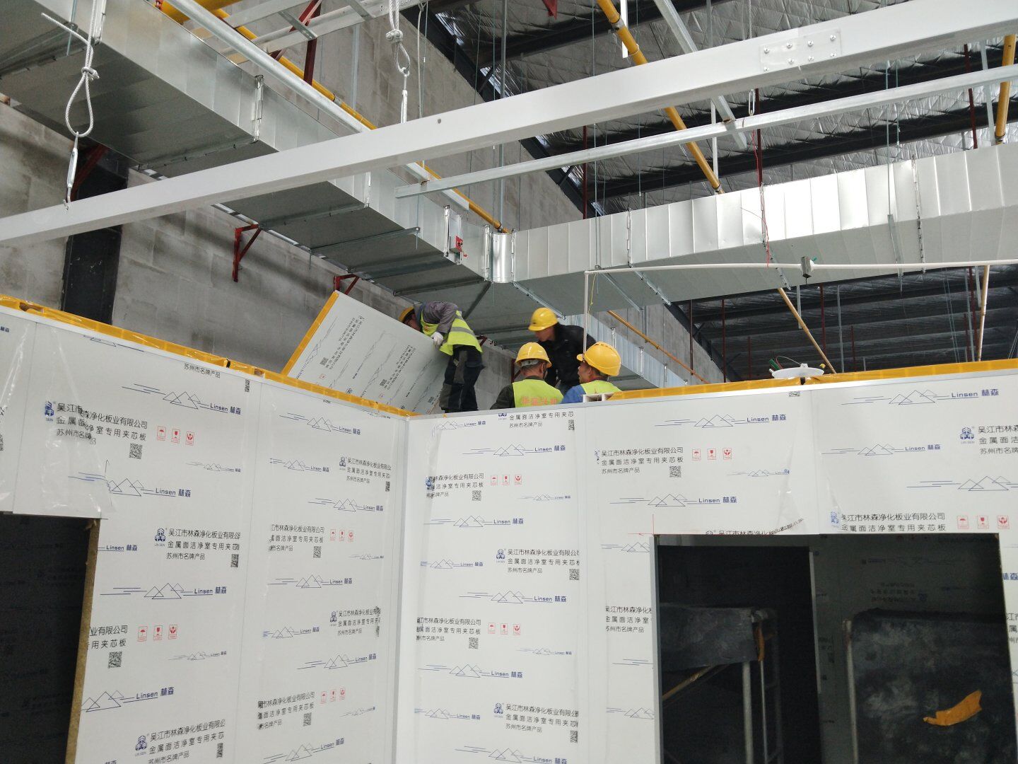 1,彩鋼板墻板完成75% 2,回風夾道安裝,撕膜,打膠完成15% 3,潔凈窗安裝完成60%。