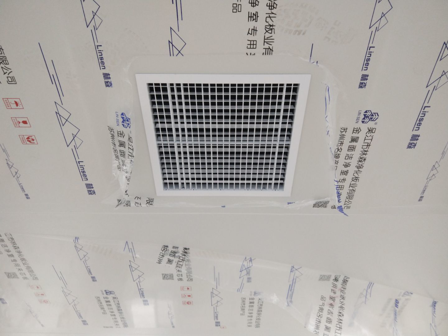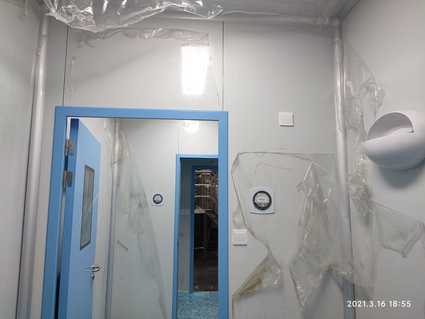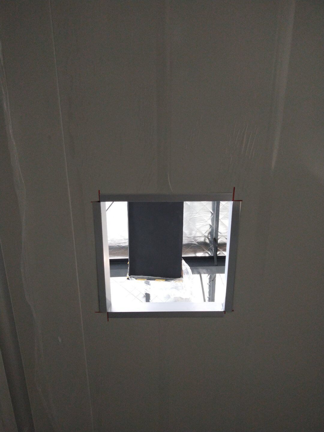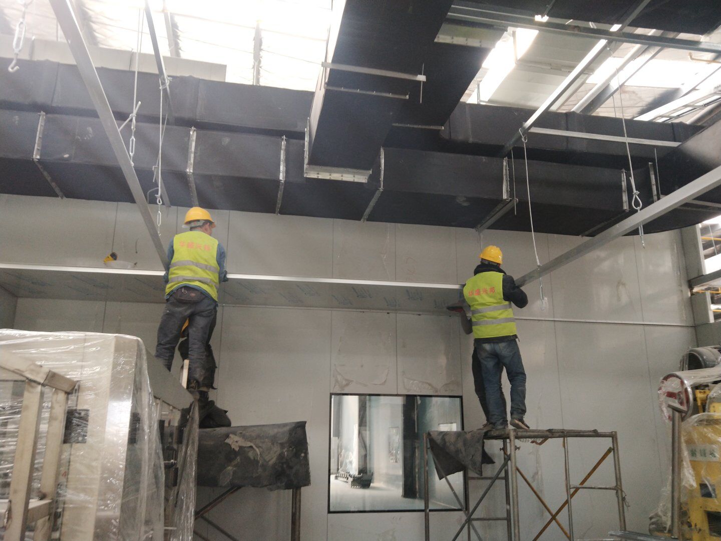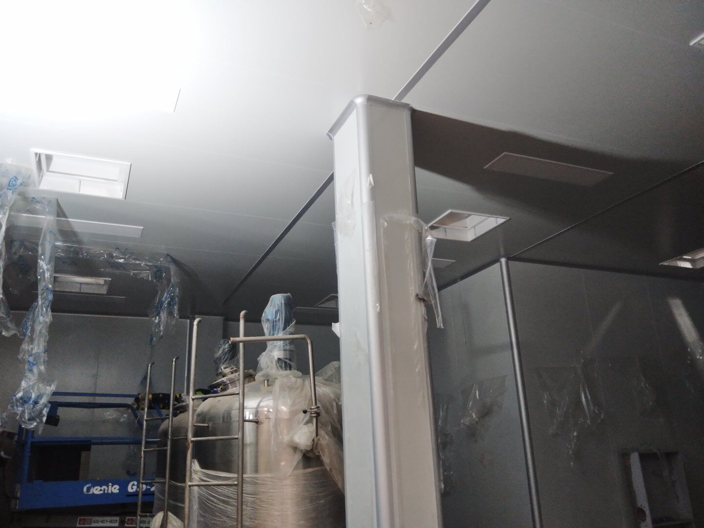 1,應甲方變更拆除參觀走廊一部分墻頂板及部分隔墻(讓增加的設備進入); 2,風管支管保溫完成70%; 3,圓弧完成65%,撕膜打膠完成20%; 4,潔凈燈盤安裝完成25%。