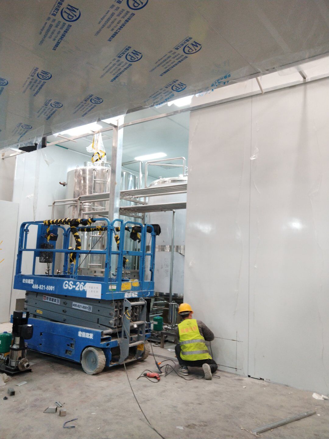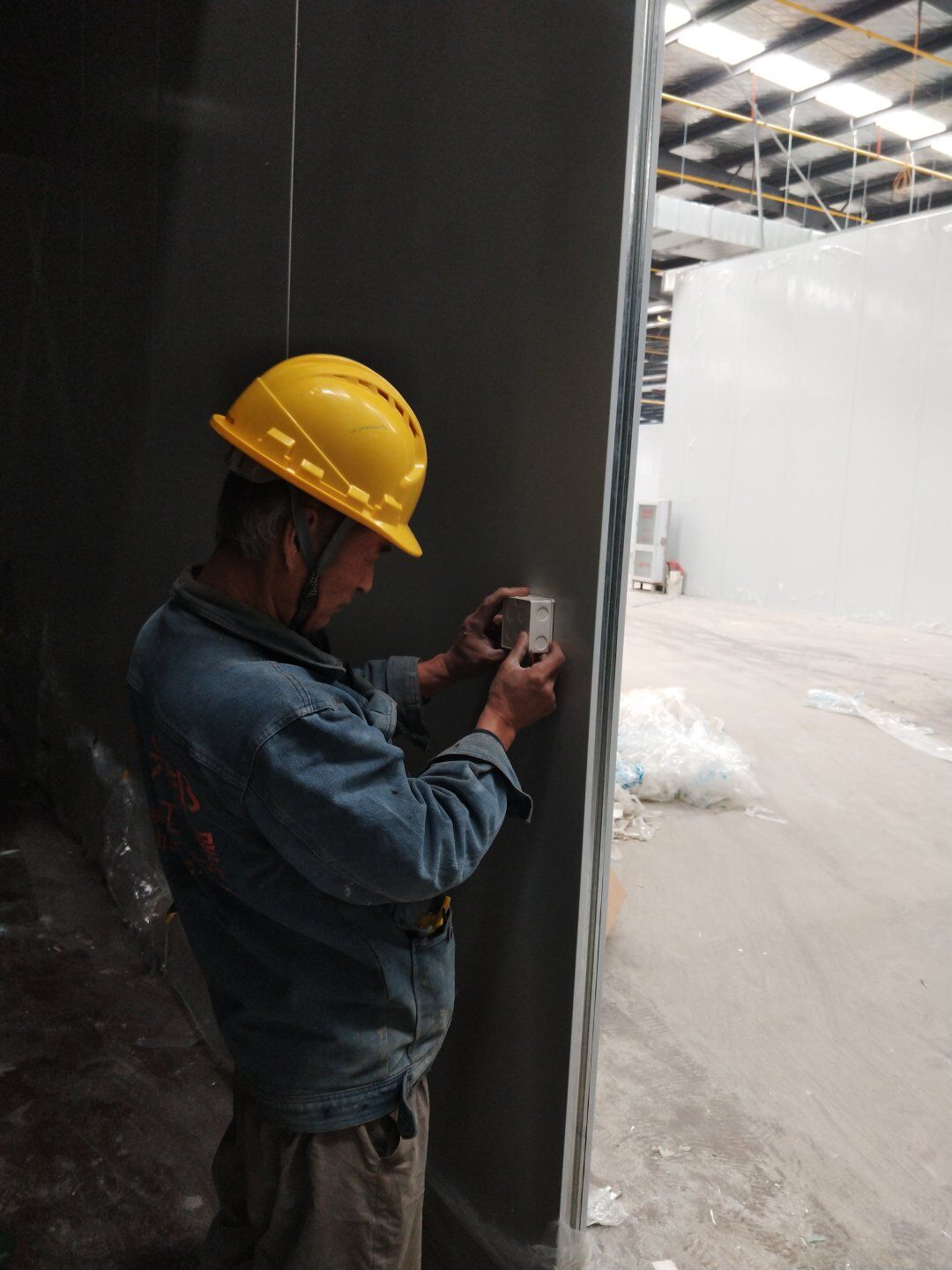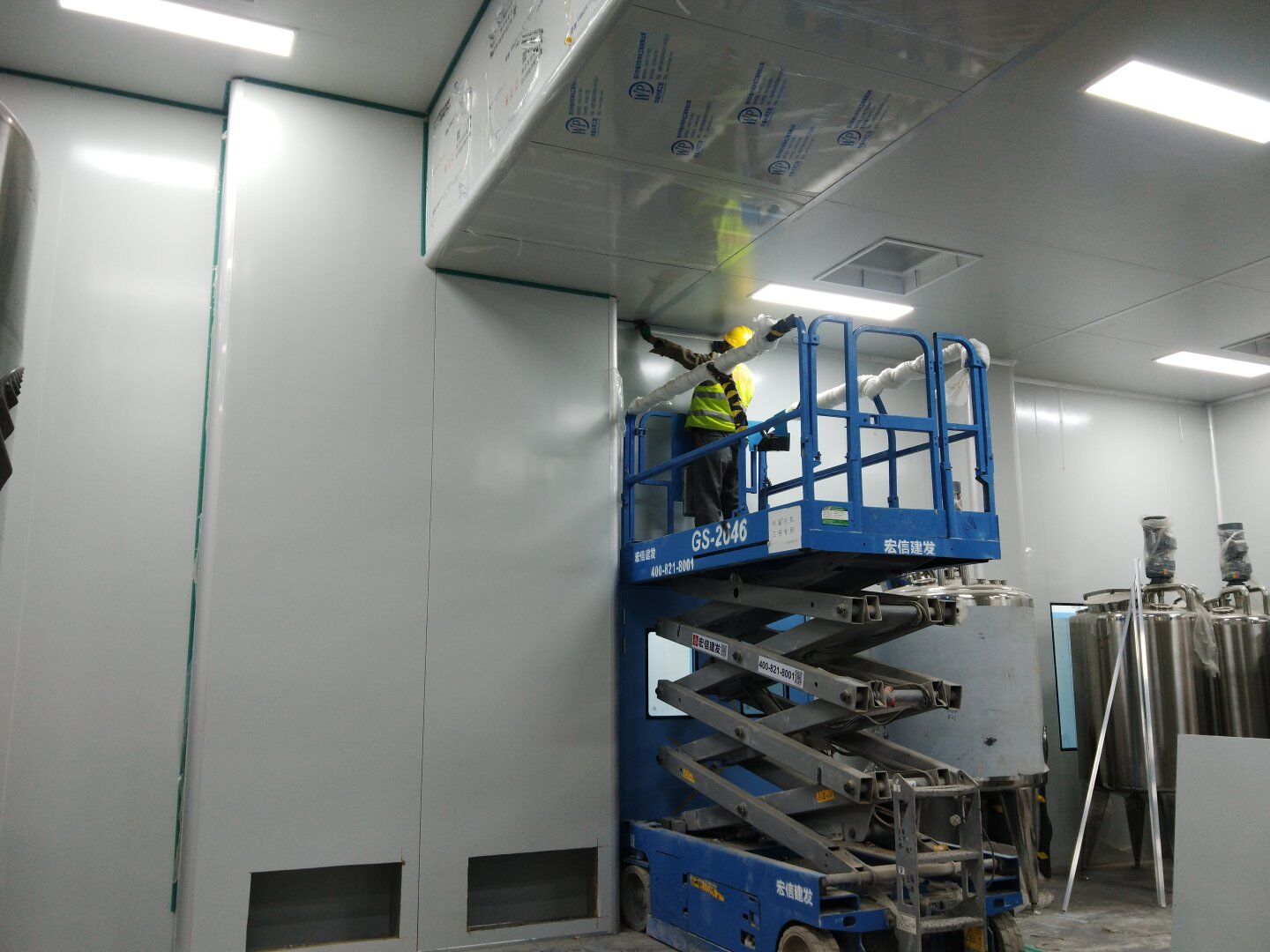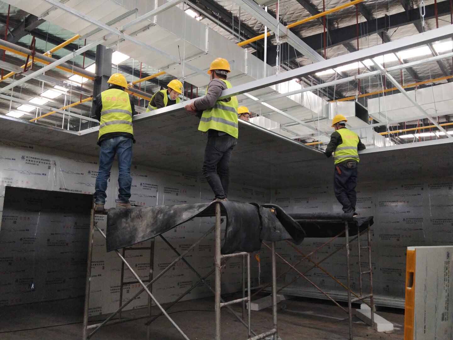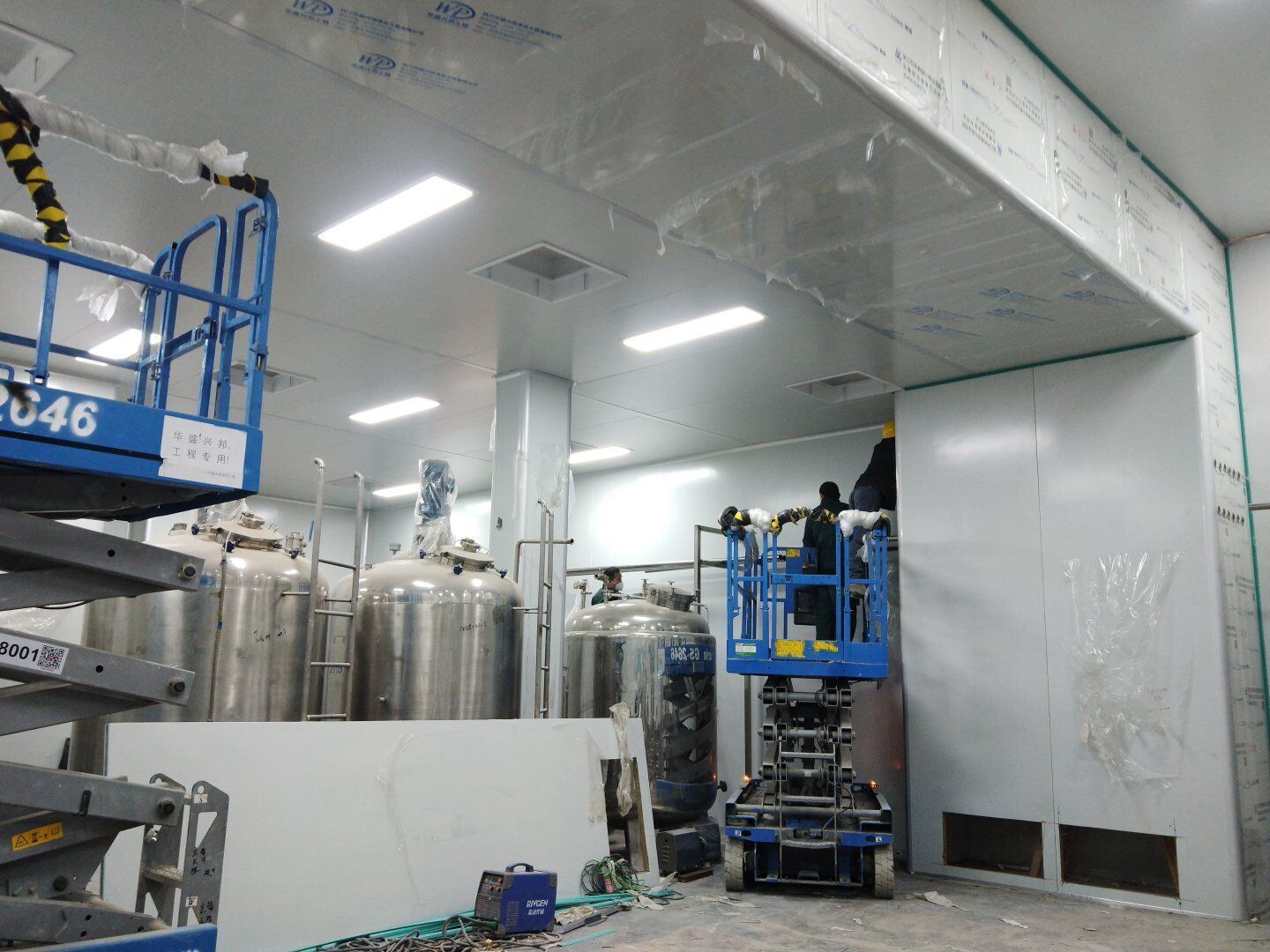 1,工礦燈安裝完成25% 飲片車間: 1,頂板完成35%,高房間撕膜打膠貼圓弧完成。