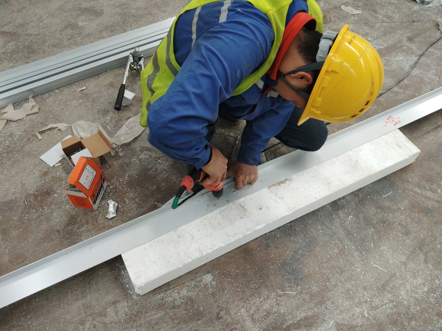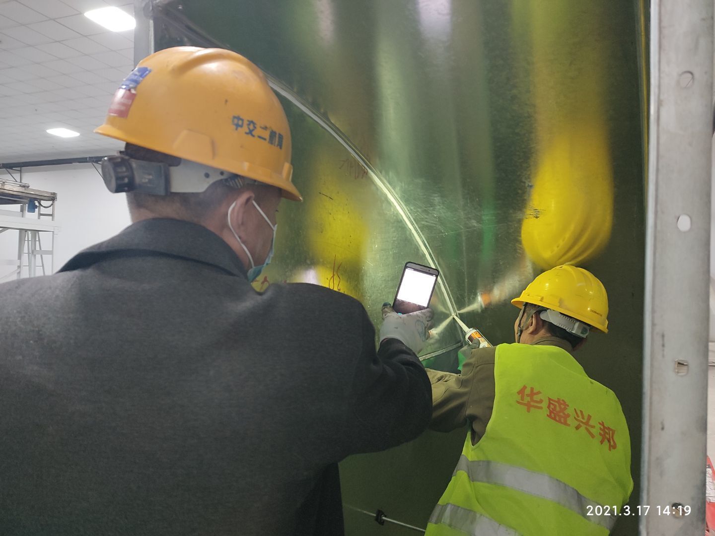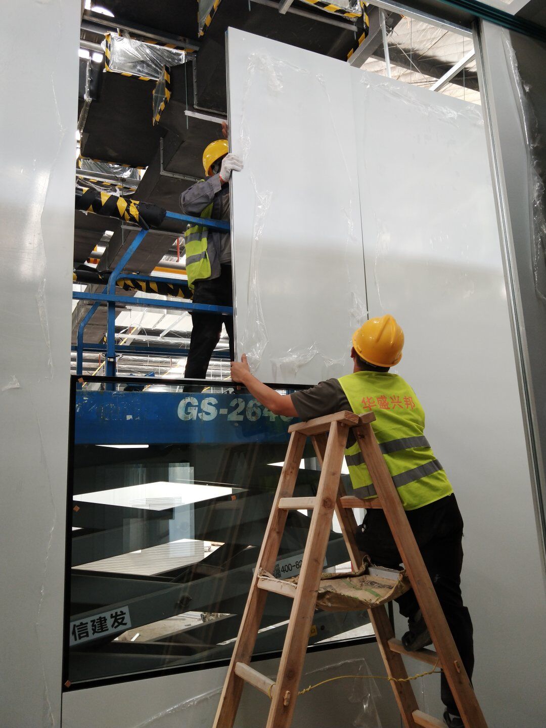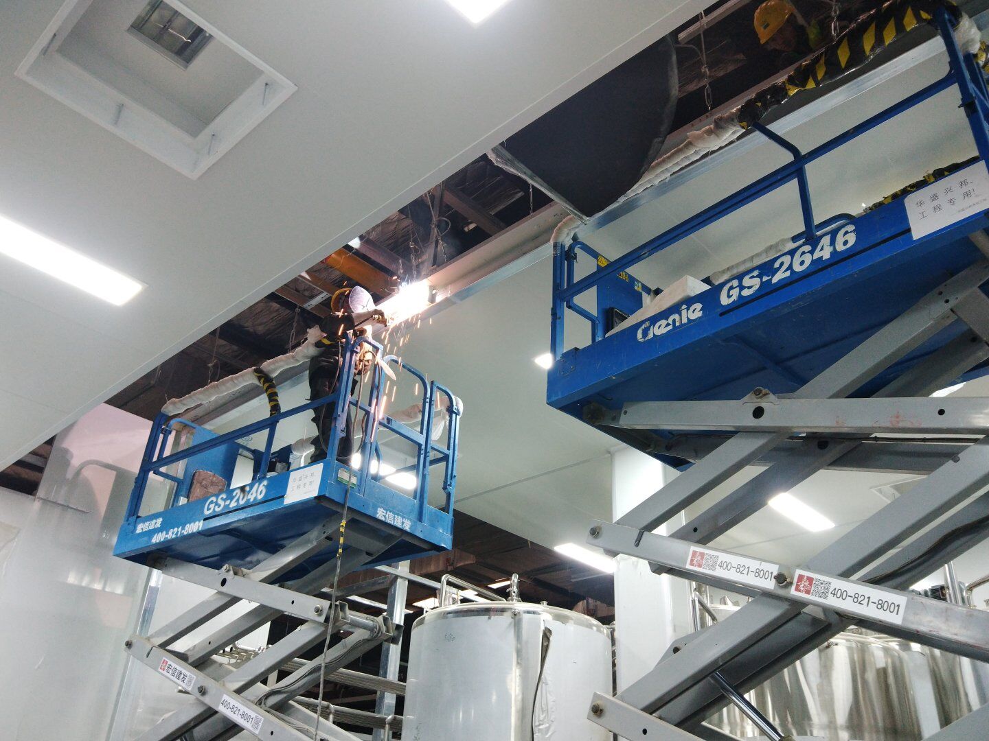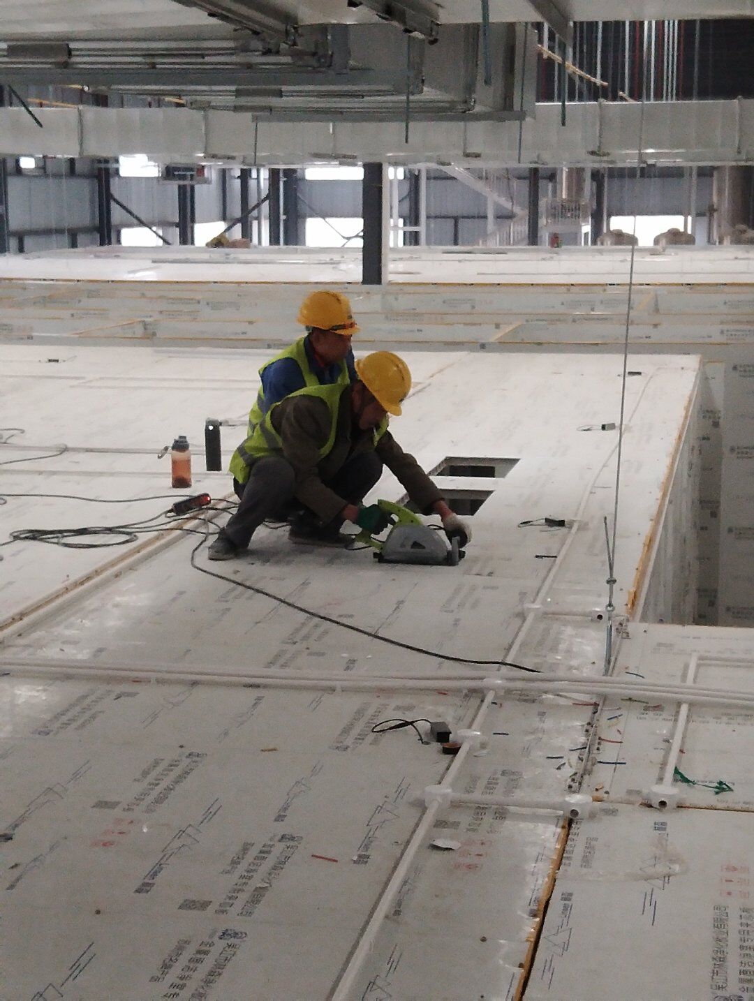 1,工礦燈安裝完成25% 飲片車間: 1,頂板完成35%,高房間撕膜打膠貼圓弧完成。