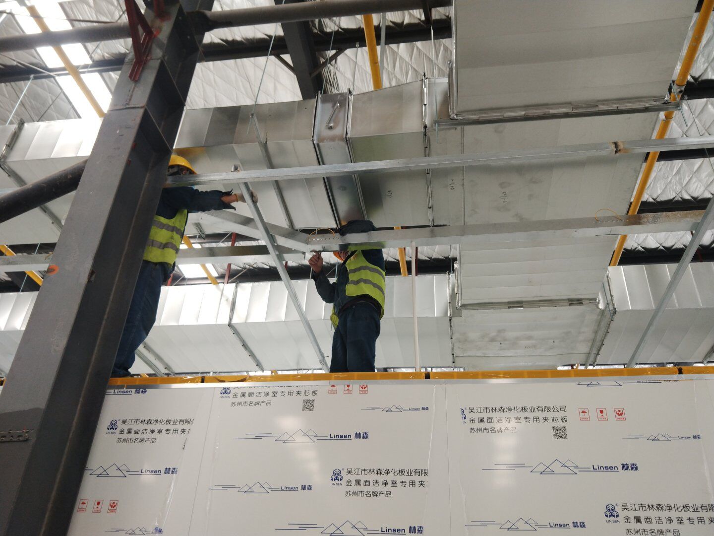 二次吊掛鋼構網架施工;車間定基準線及彩鋼板隔墻放線;凈化風管施工