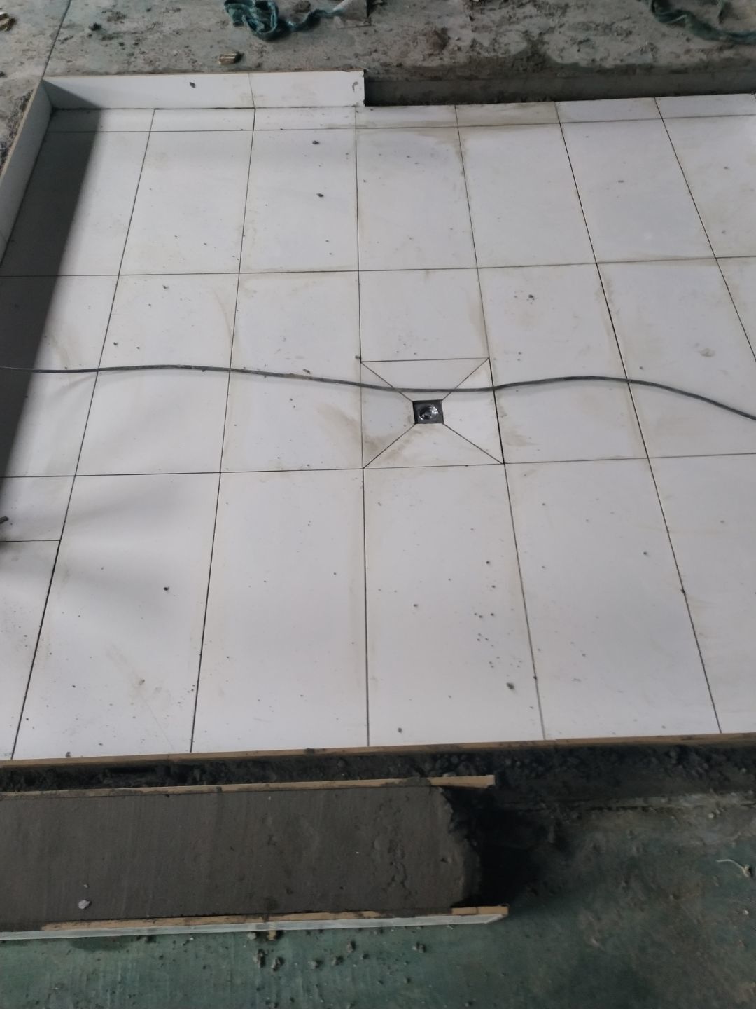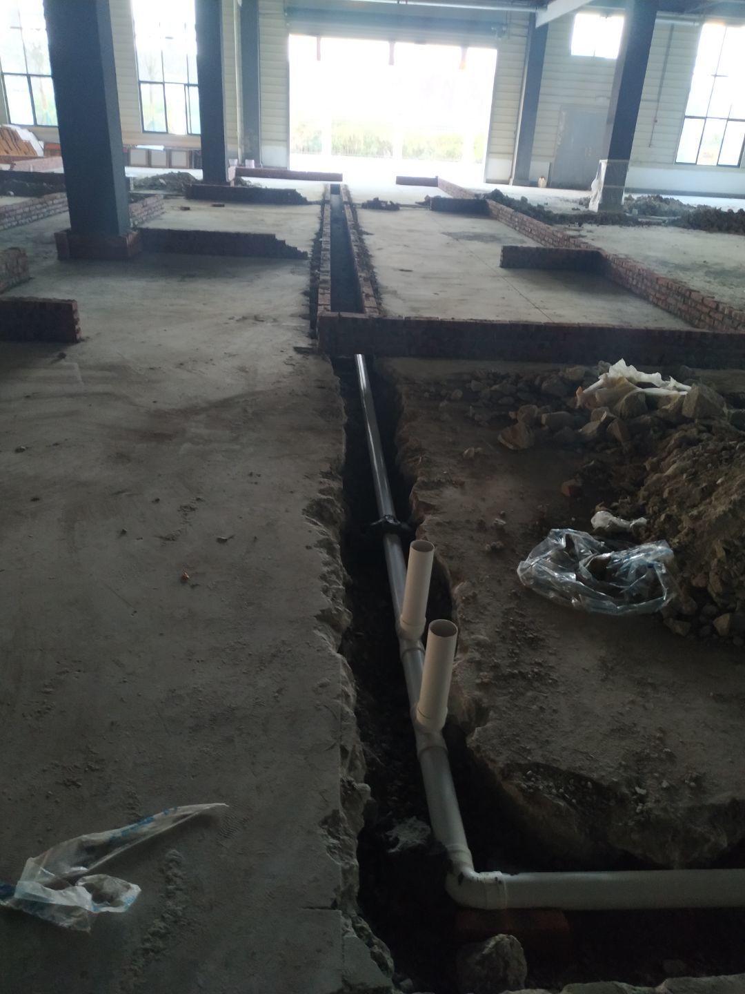 排水溝砌磚完成75%,瓷磚、地磚、排水管、防水材料、排水溝折邊件和水篦子到場卸貨。