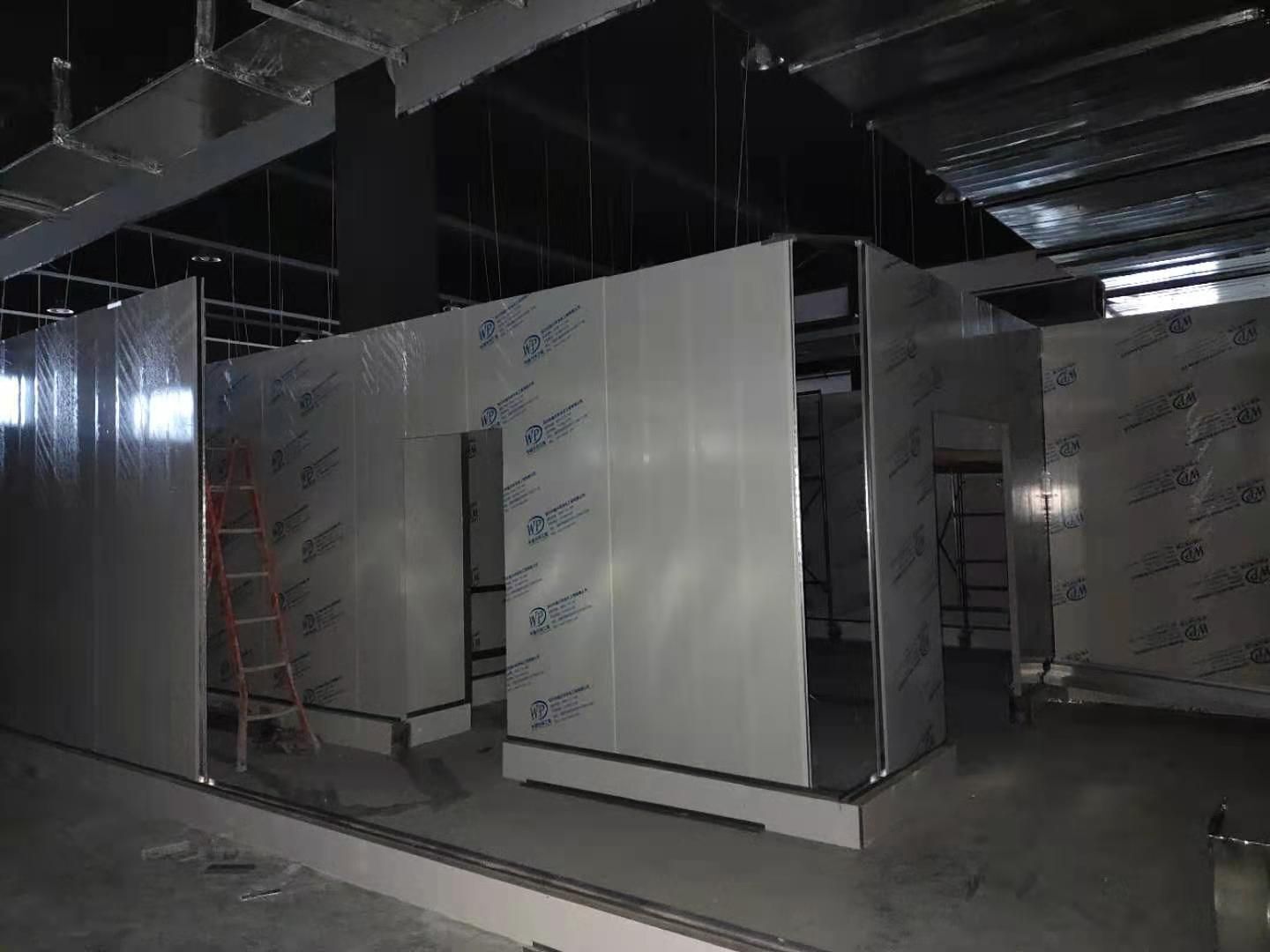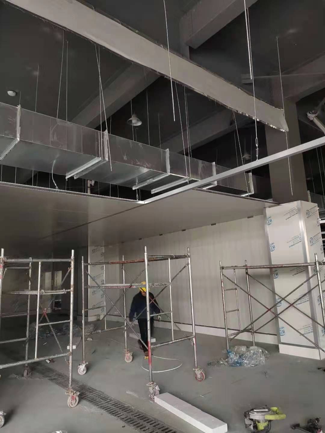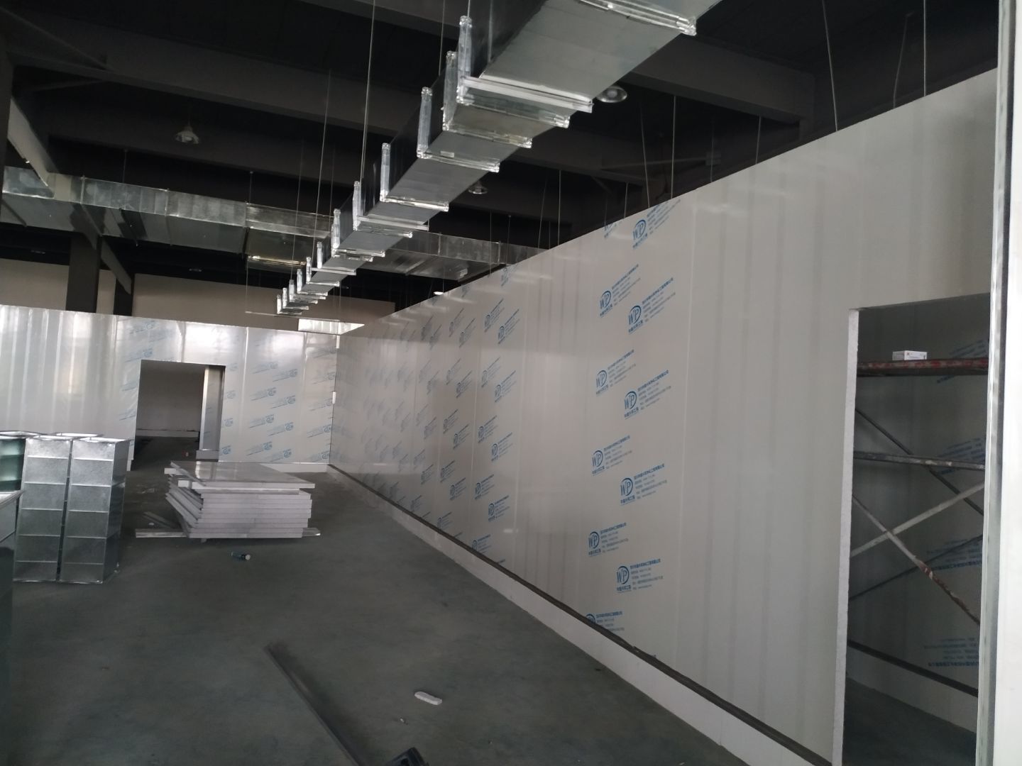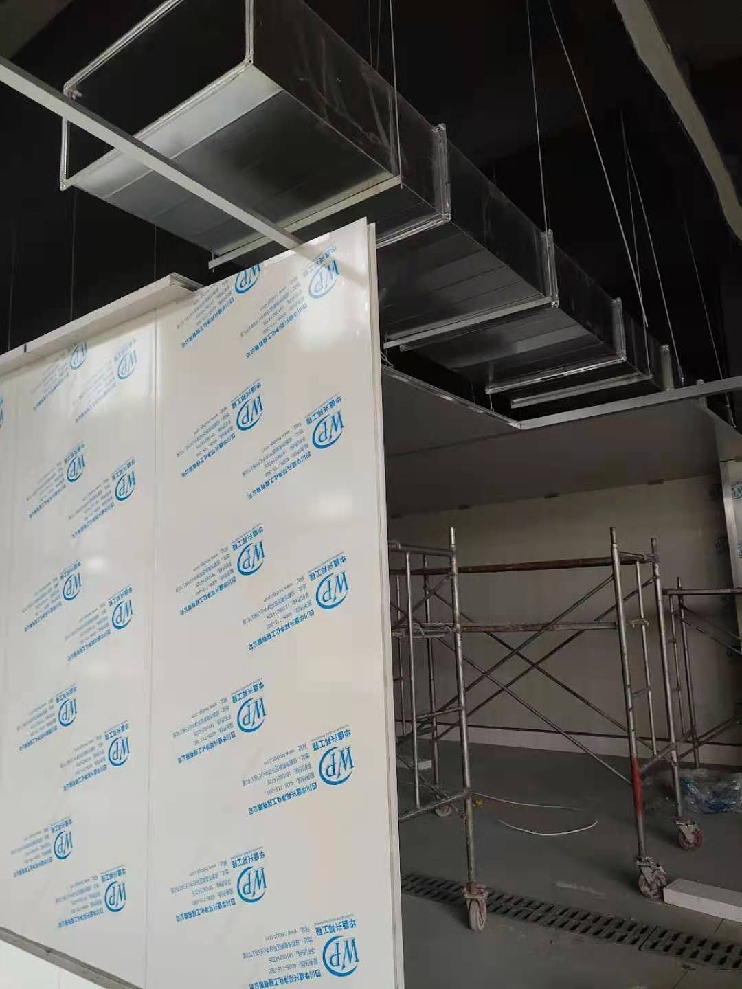 彩鋼板墻板安裝完成70%,頂板安裝完成30%,風管安裝完成70%。