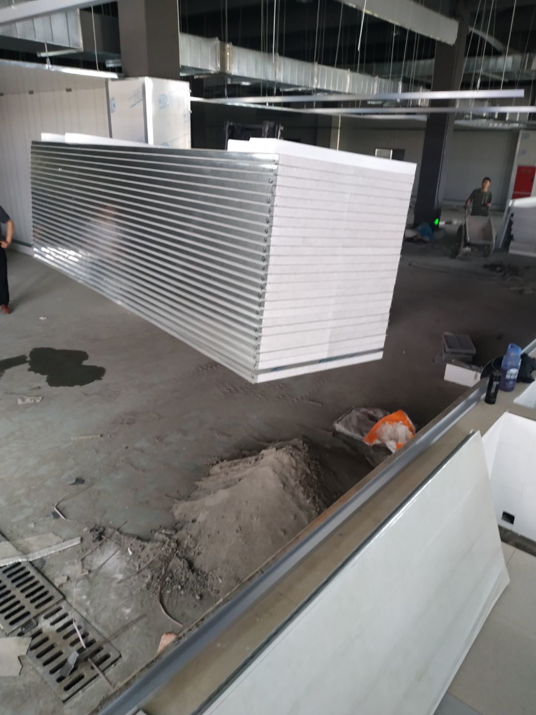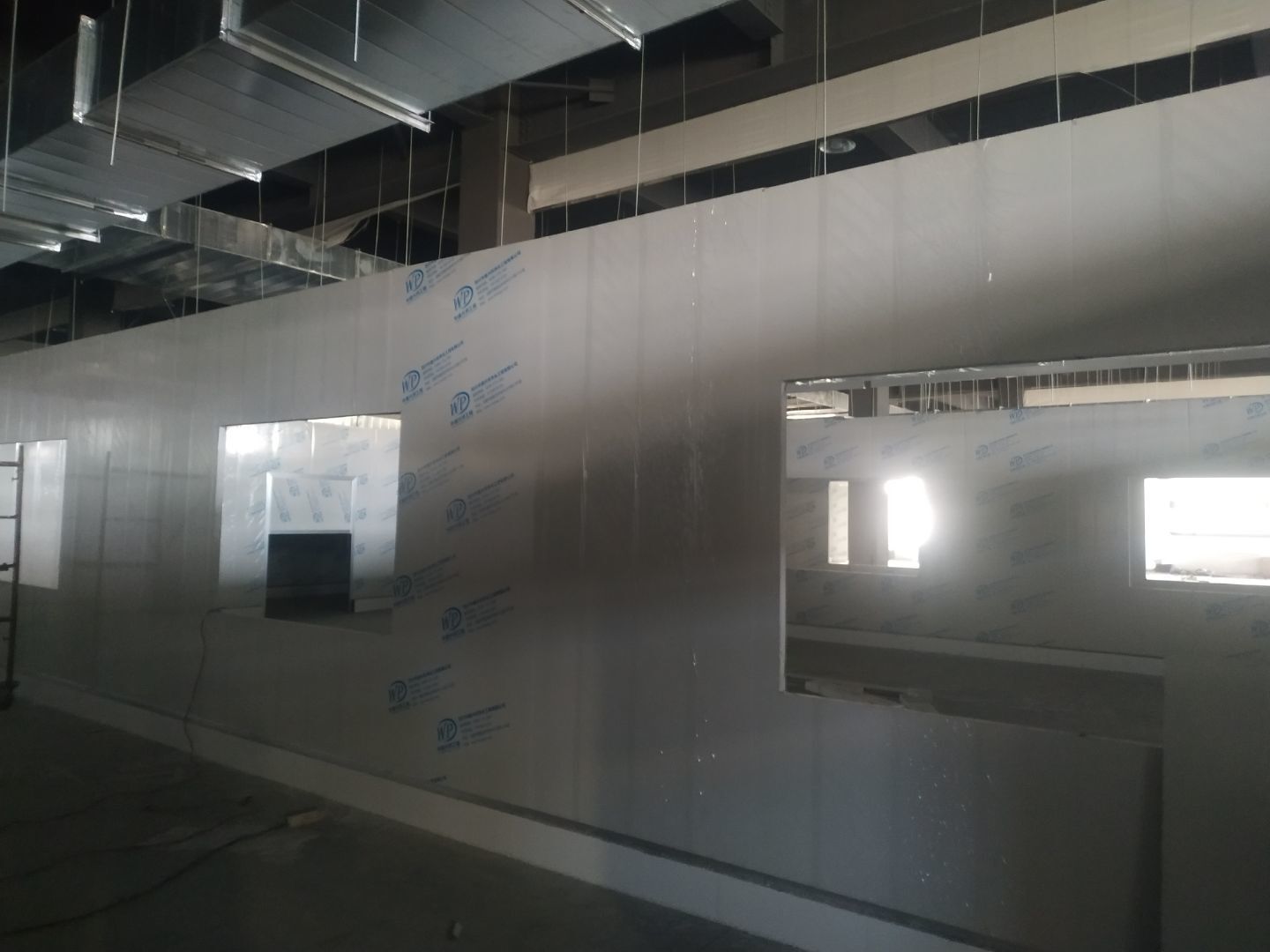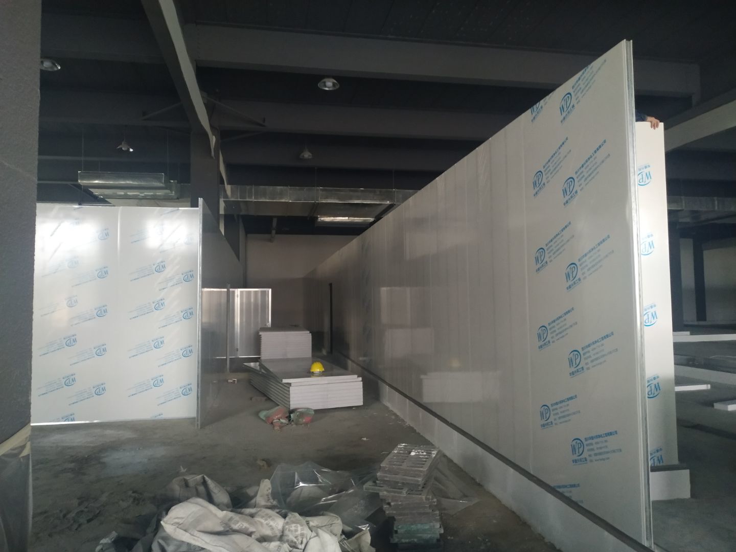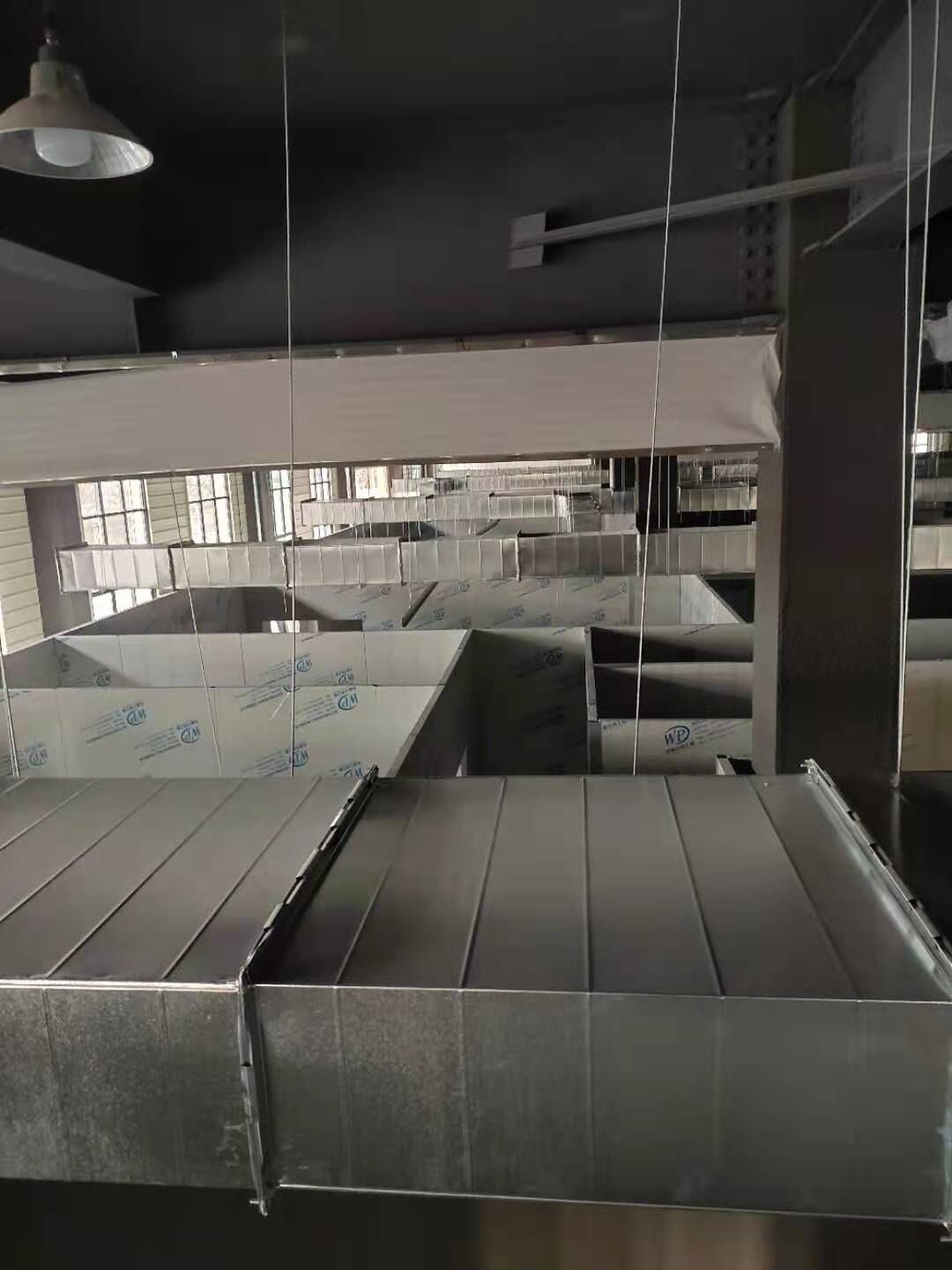 彩鋼板墻板安裝完成70%,頂板安裝完成30%,風管安裝完成70%。