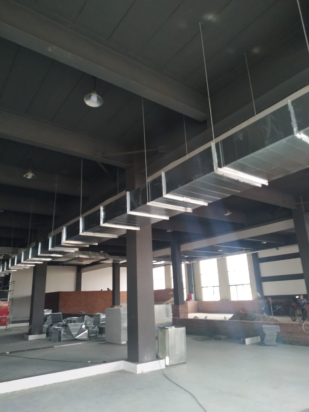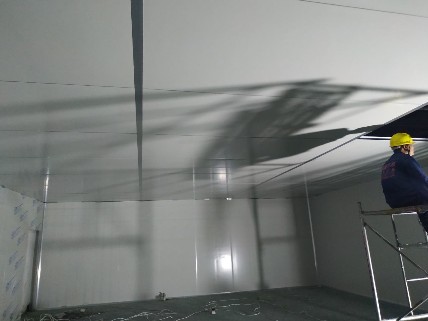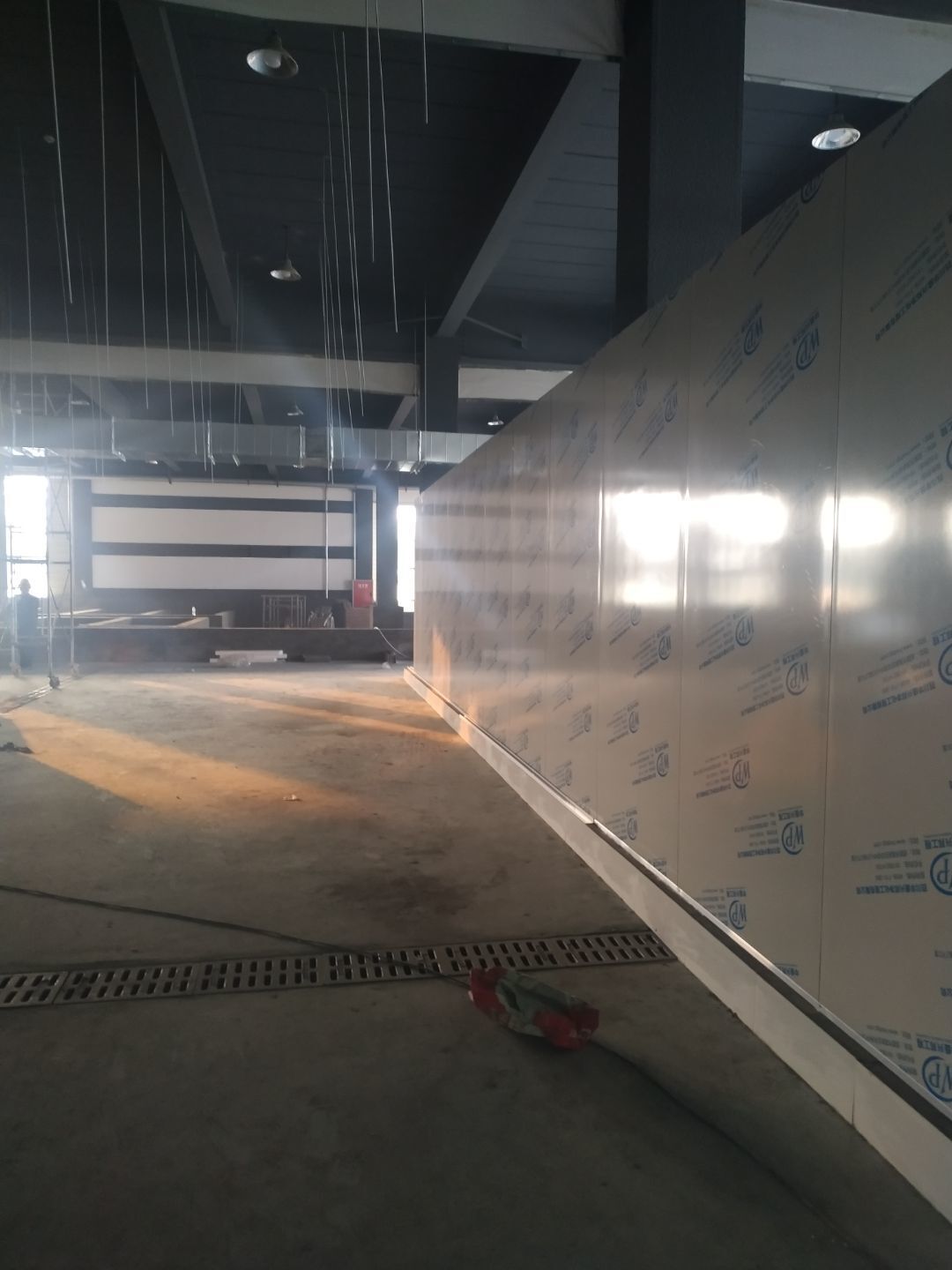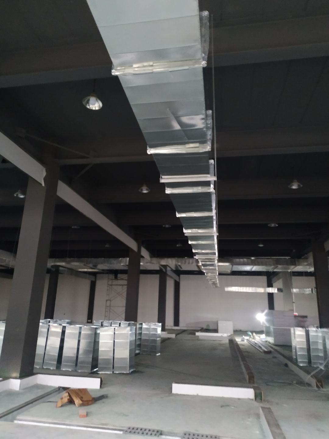 彩鋼板墻板安裝完成70%,頂板安裝完成30%,風管安裝完成70%。