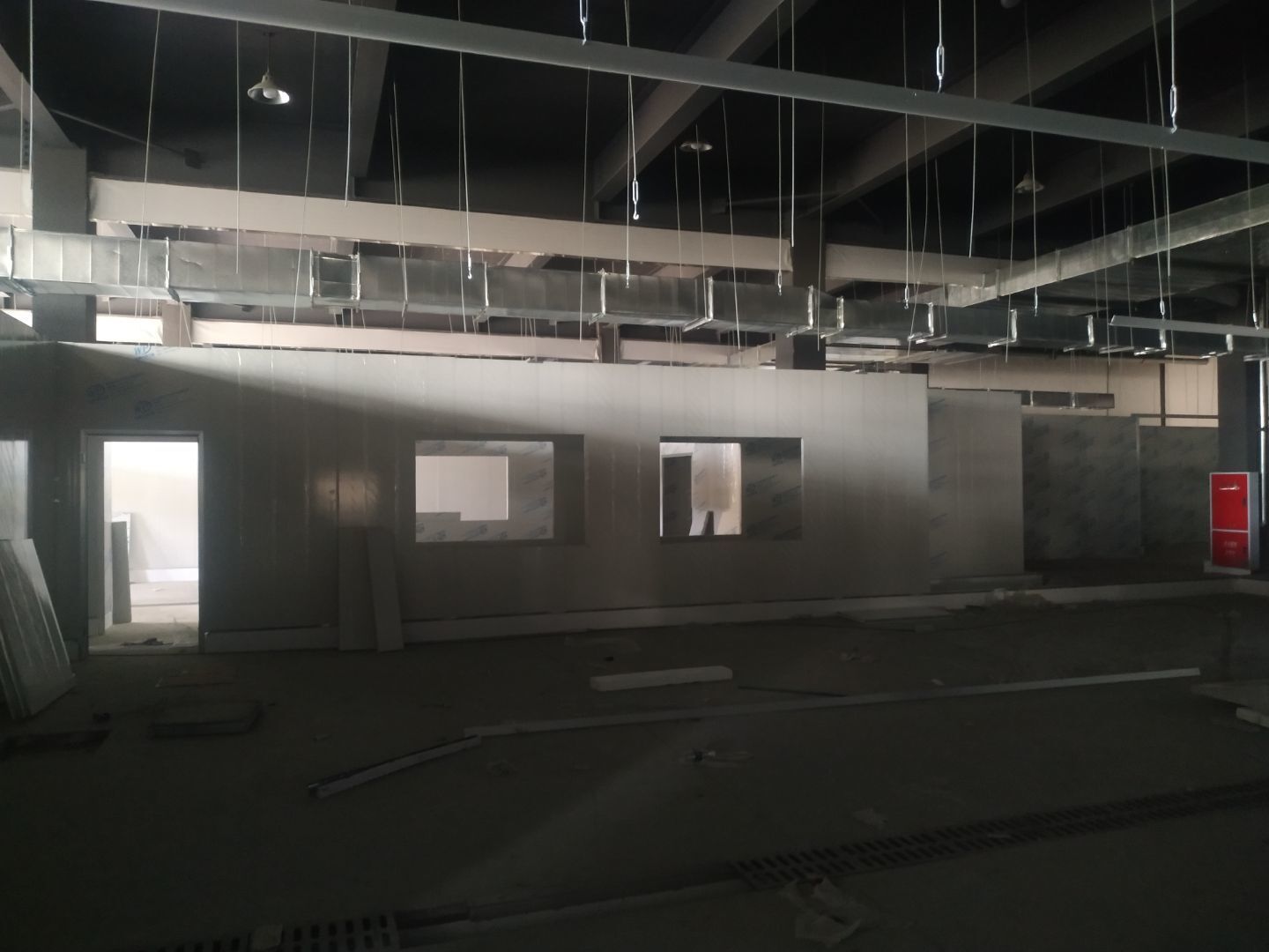 防火隔斷墻上門洞開孔完成,彩鋼墻窗戶開孔完成,門料預制,撕膜打膠,彩鋼板材料到場。