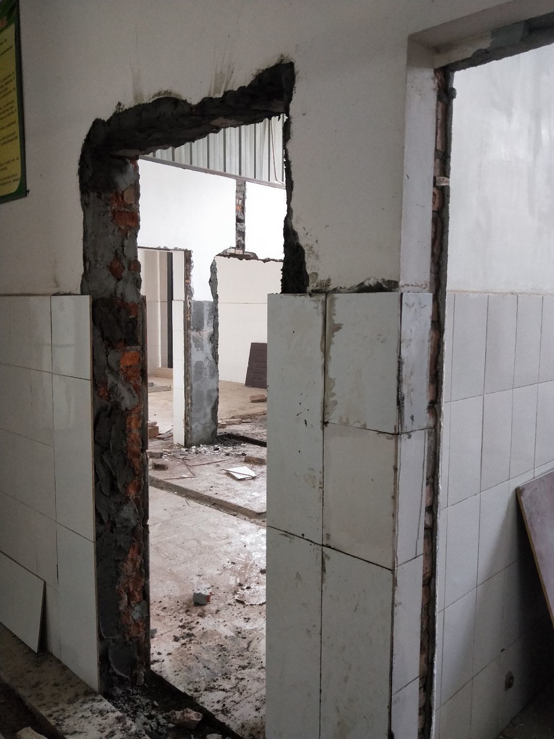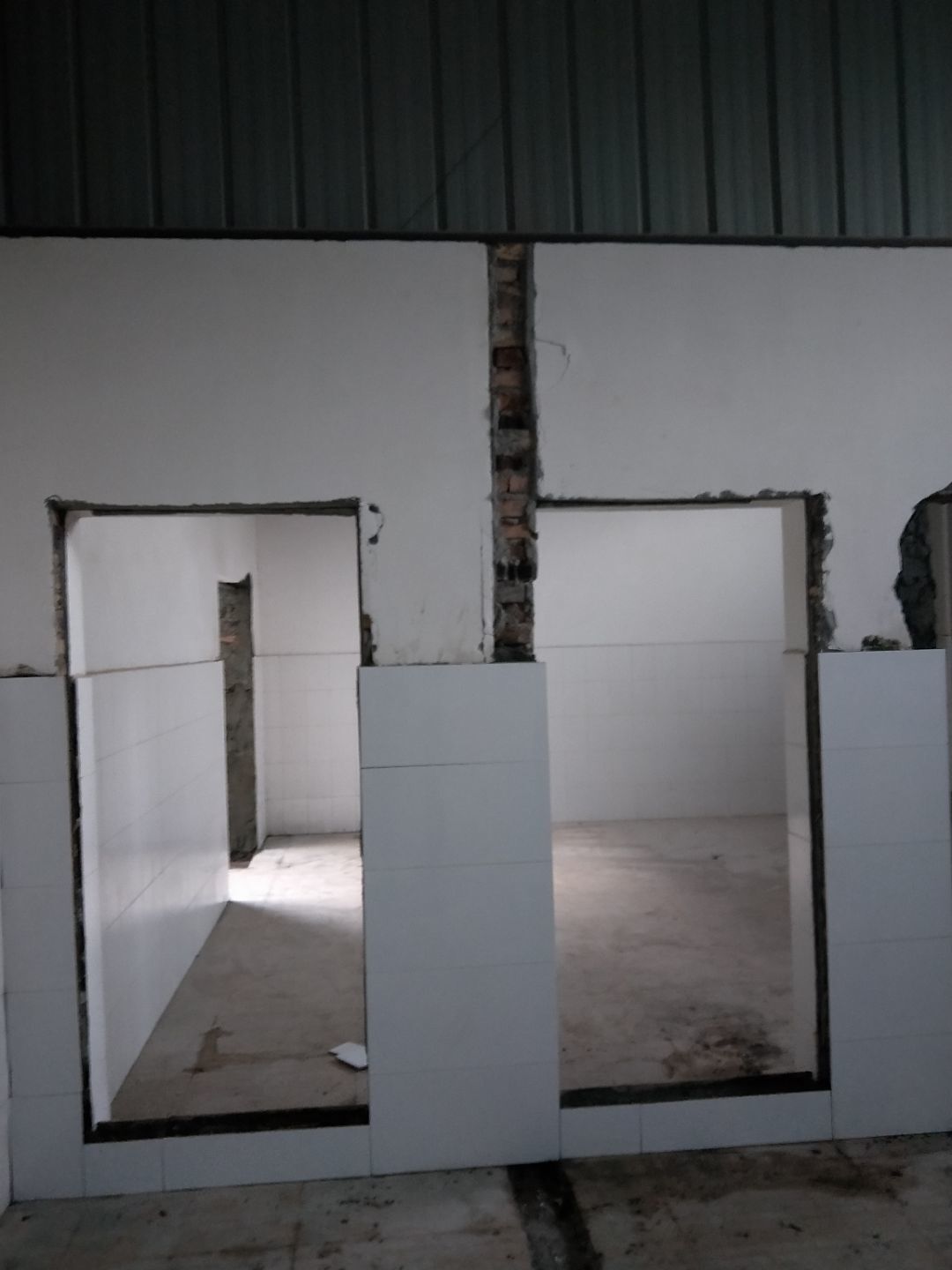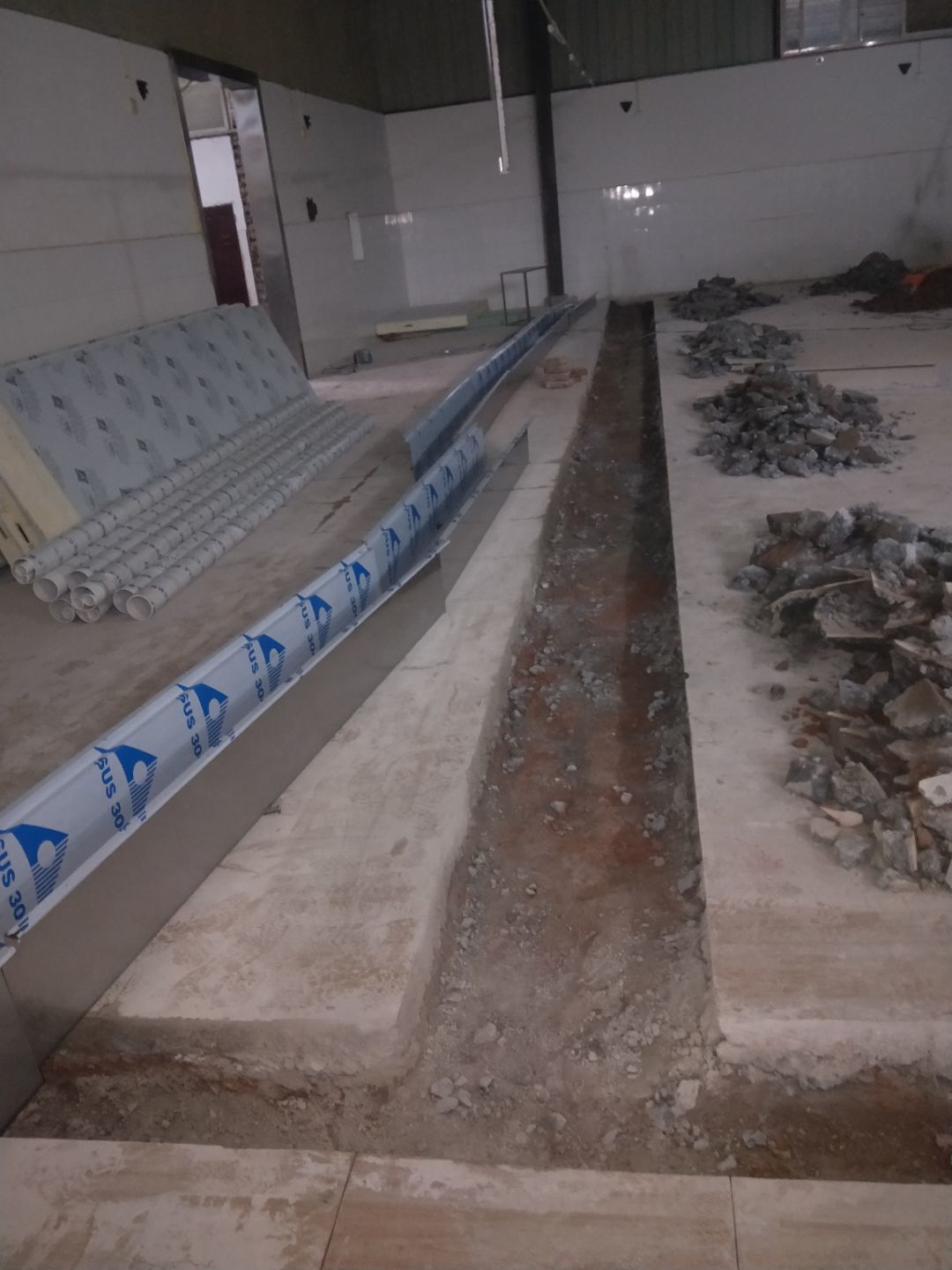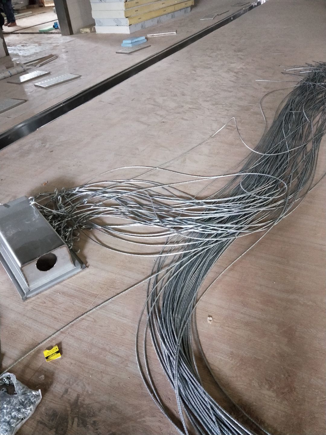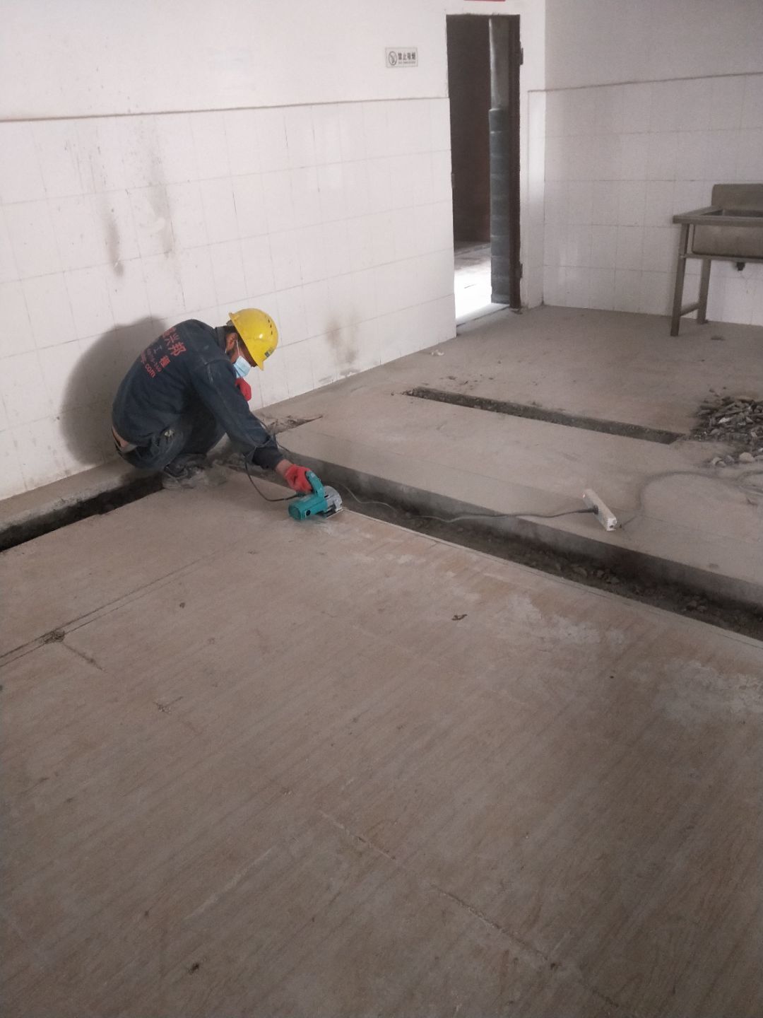 板材到場下貨,掛鋼繩,門洞貼磚修補,排水點貼磚