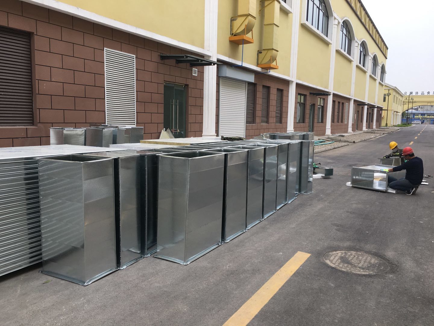 1:彩板吊頂全部門框扣料完成,門板構件同步制作中。收尾工作分區域暫進行配合地坪施工。2:空調班組~風管合縫完成,完成材料轉運至二樓,主機設備到場卸裝。3:水電班組-控制線配線完成80%,樓頂配管20%左右。