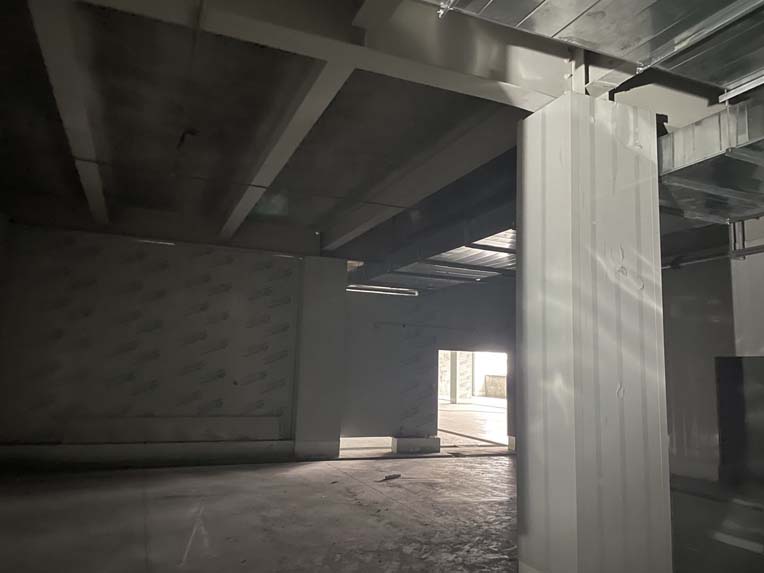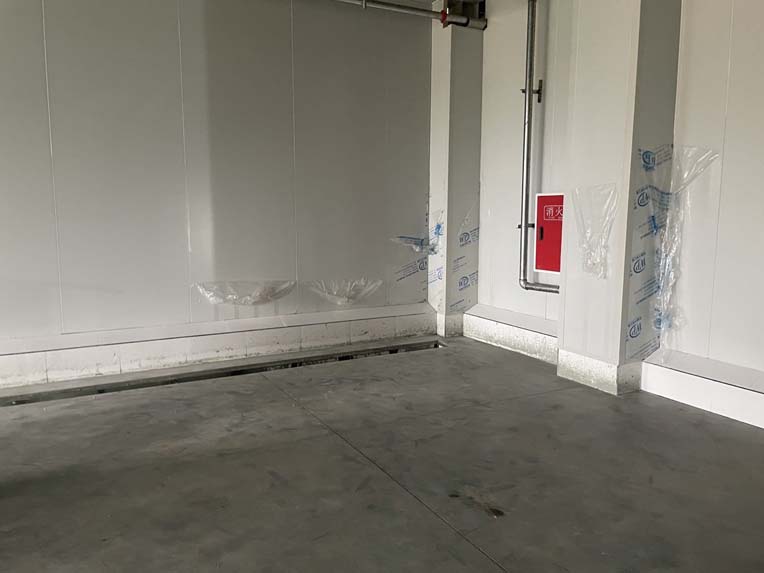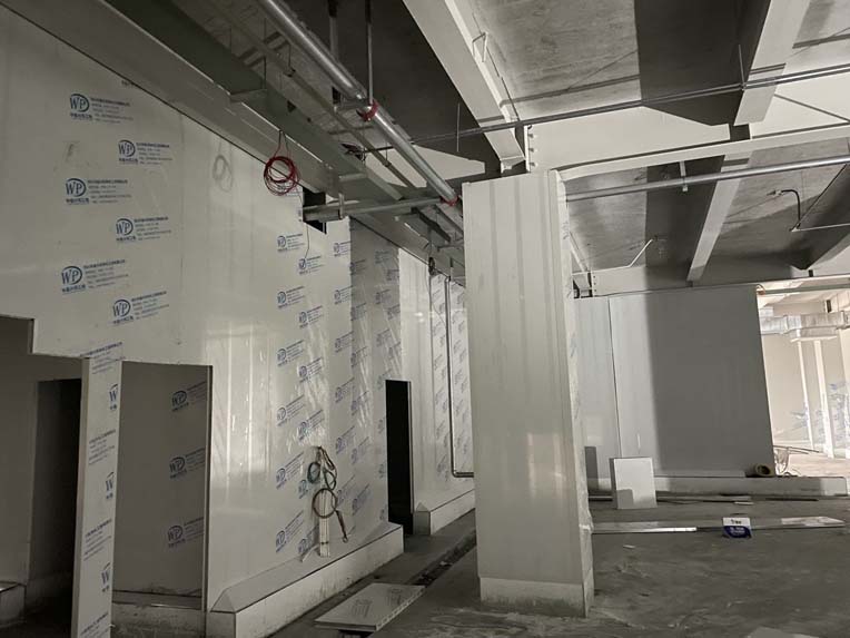 一層彩鋼隔斷完成100%,現貼圓弧、打膠、包柱子。 斜面瓷磚完成60%。