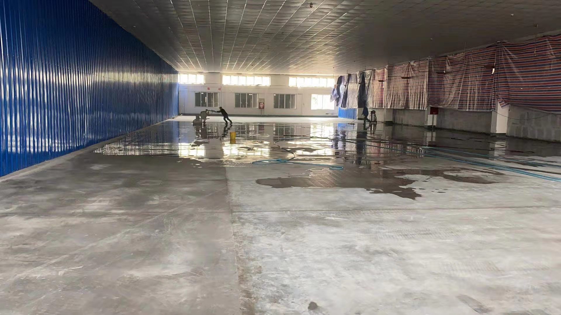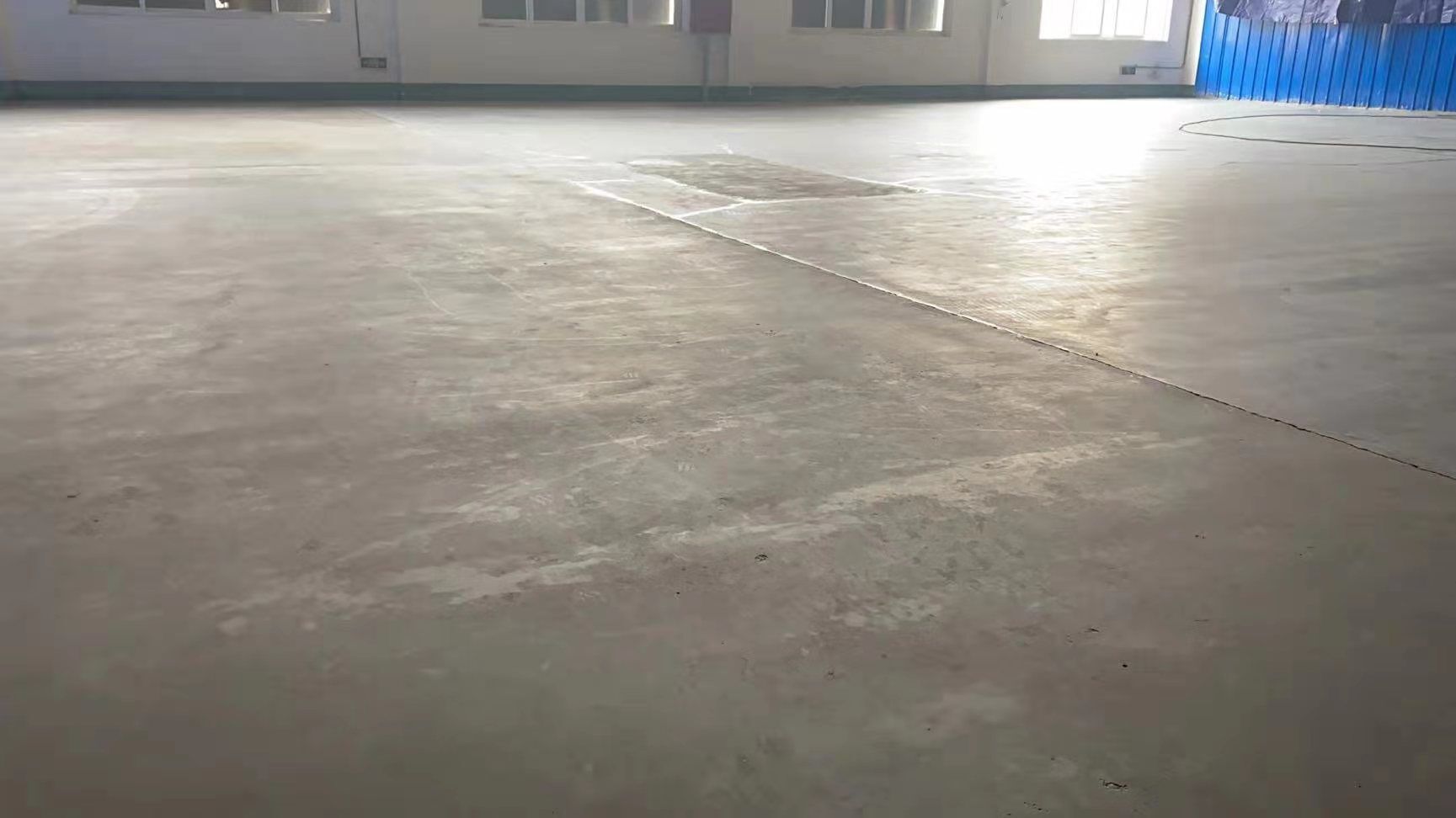 庫房固化地坪施工完成,周轉框清洗新打地坪伸縮縫切割完成。