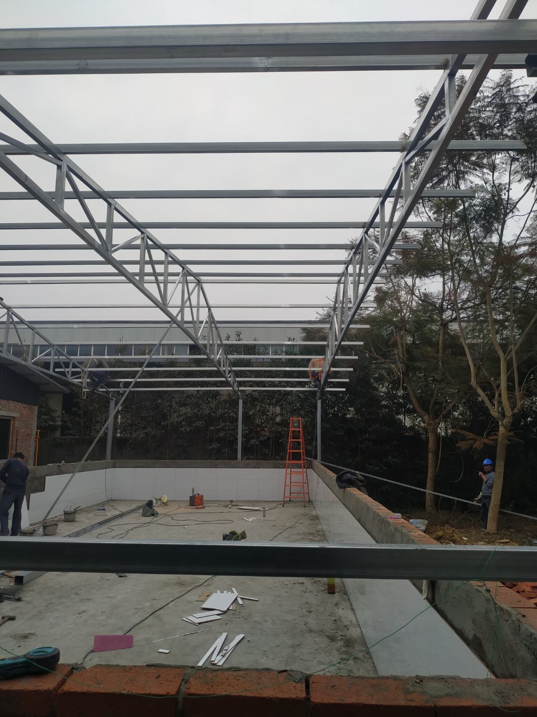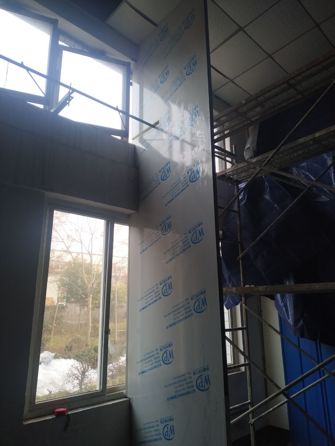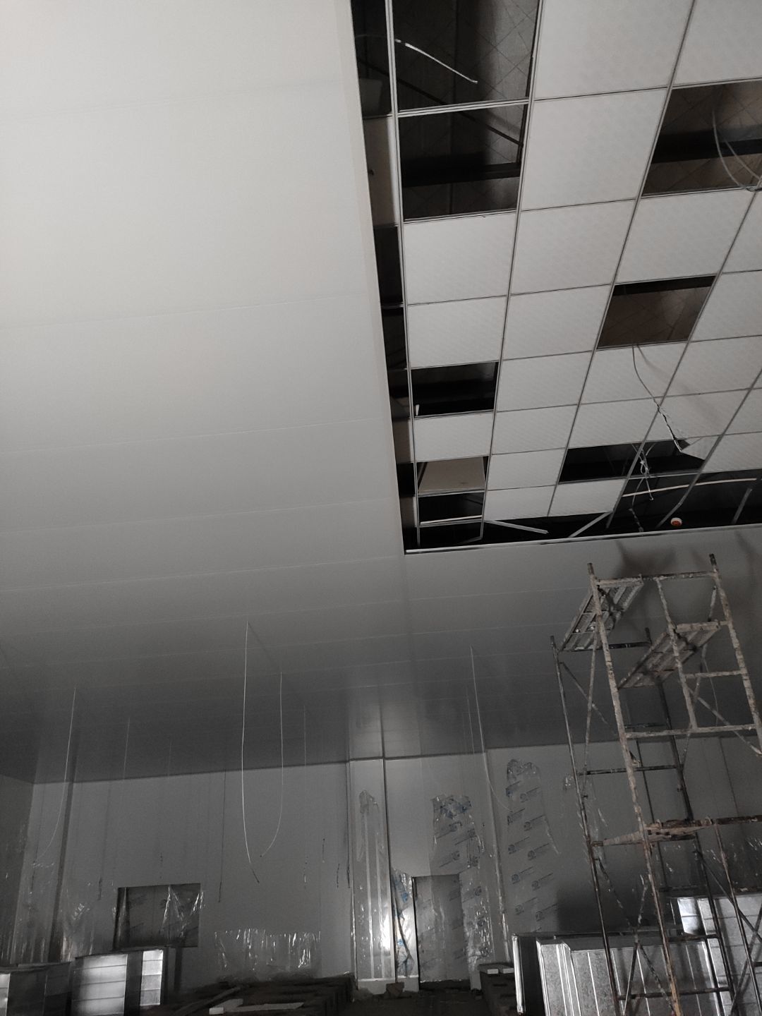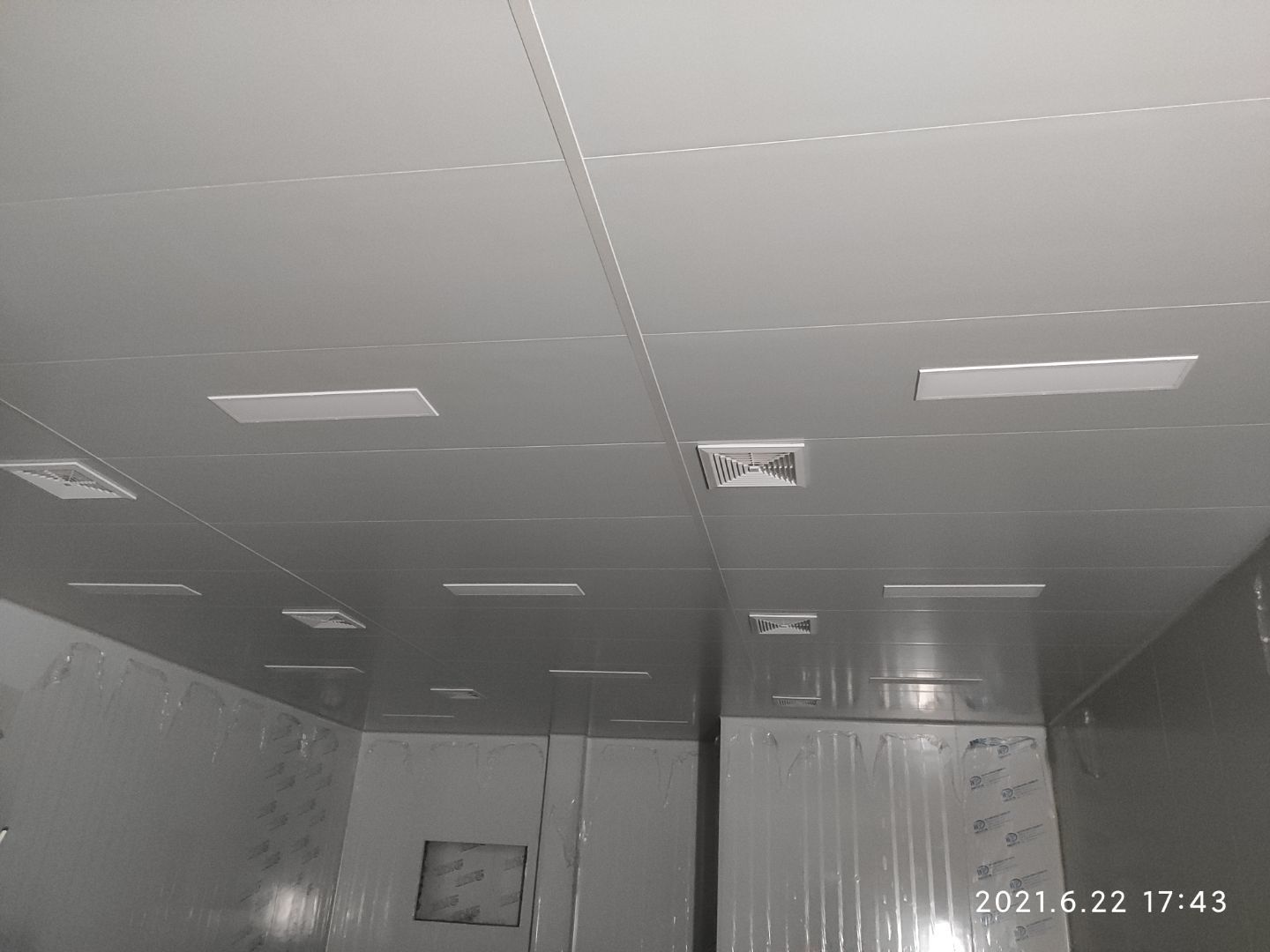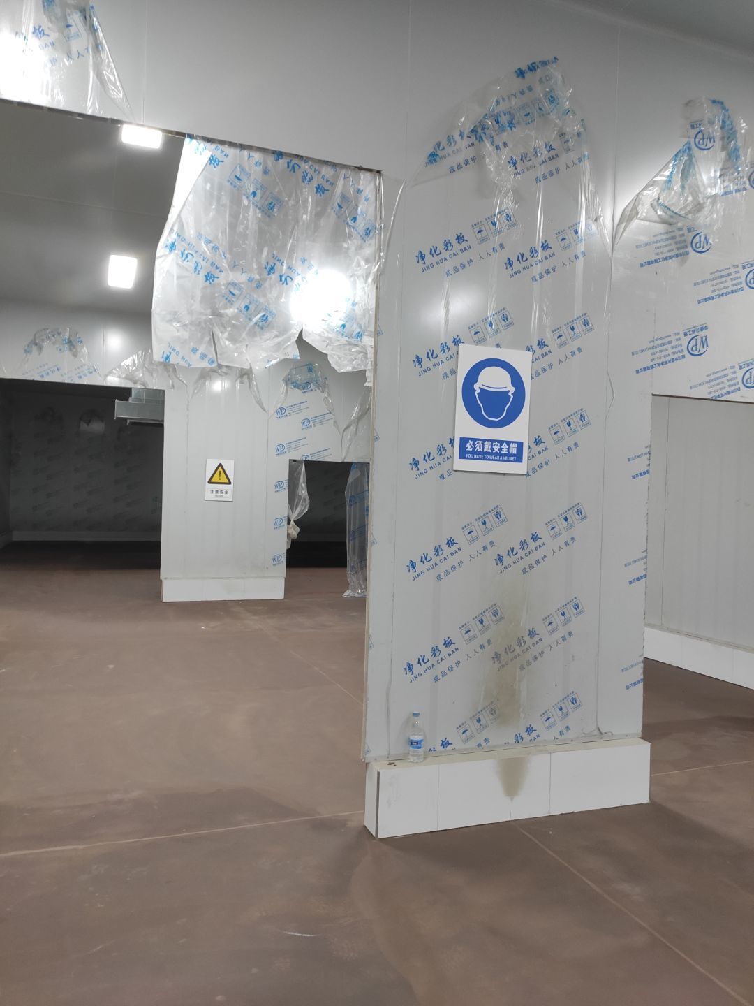 周轉框清洗間彩鋼板吊頂安裝完成,庫房撕膜打膠完成,周轉框清洗間彩鋼瓦墻板安裝完成。撕膜完成40%,圓弧安裝完成50%。