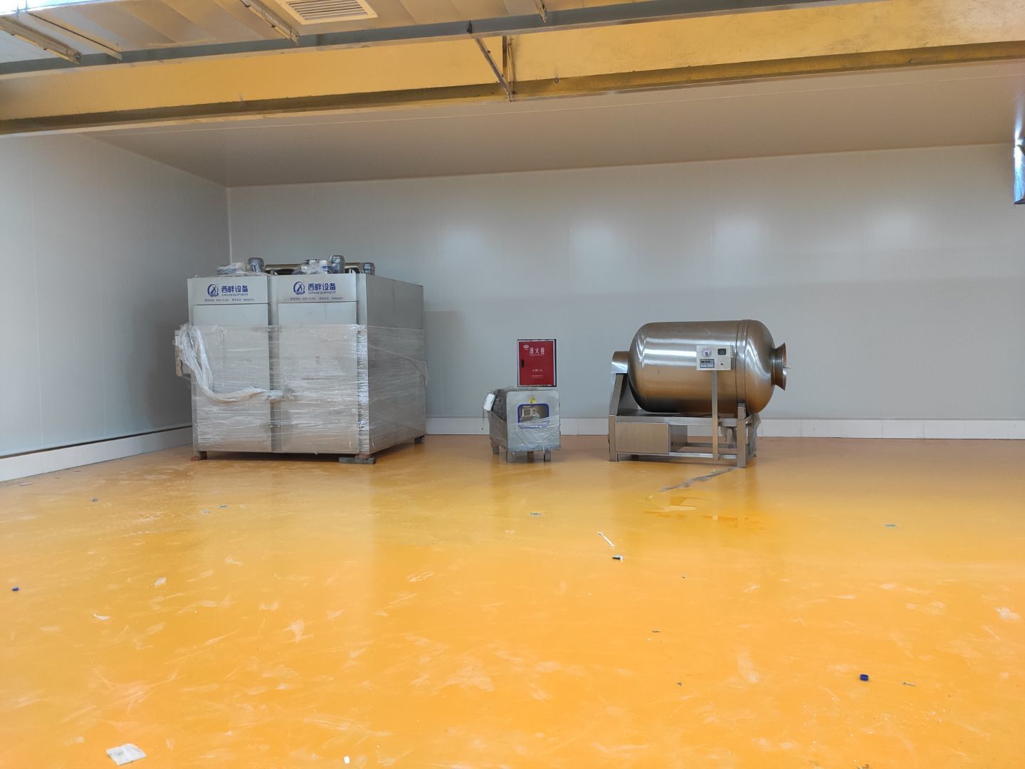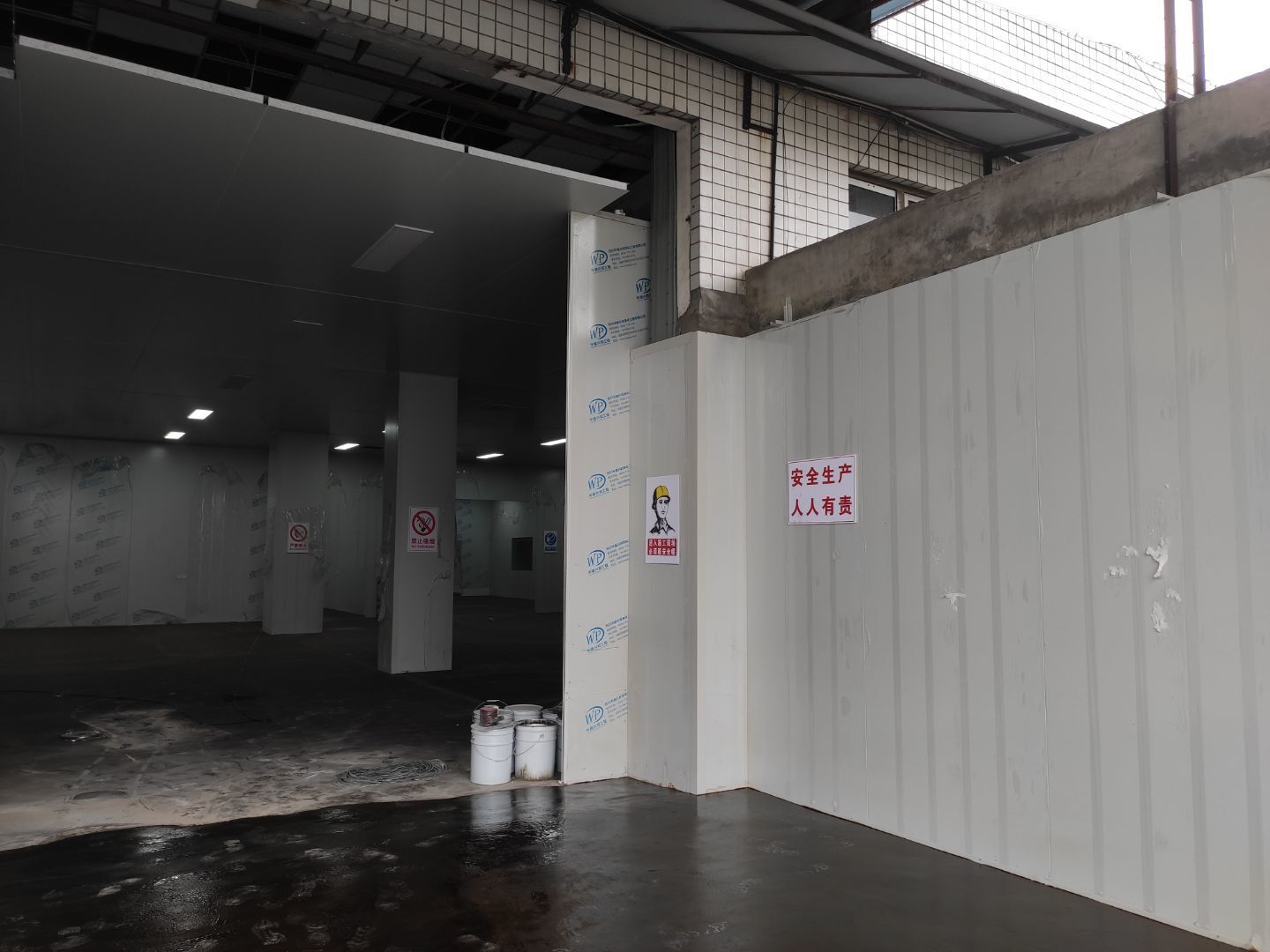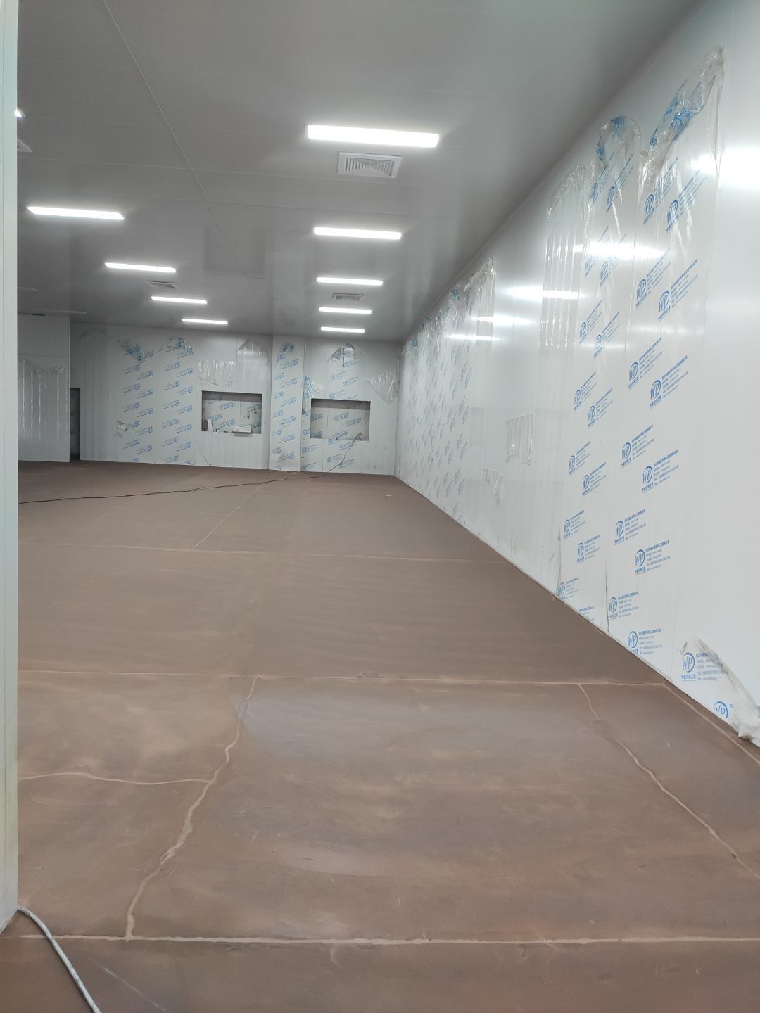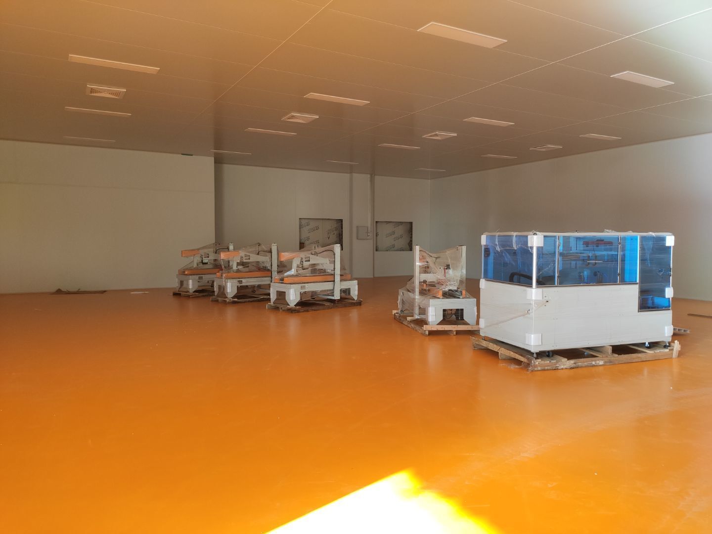 機器設備已到現場 地面施工,打磨完成底漆施工完成 水電工程,車間燈全部通電