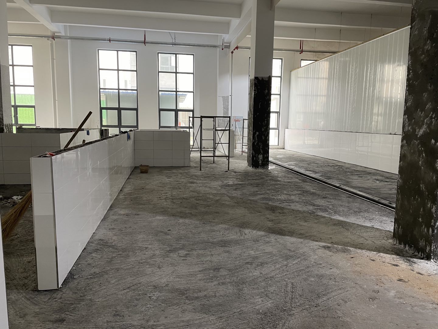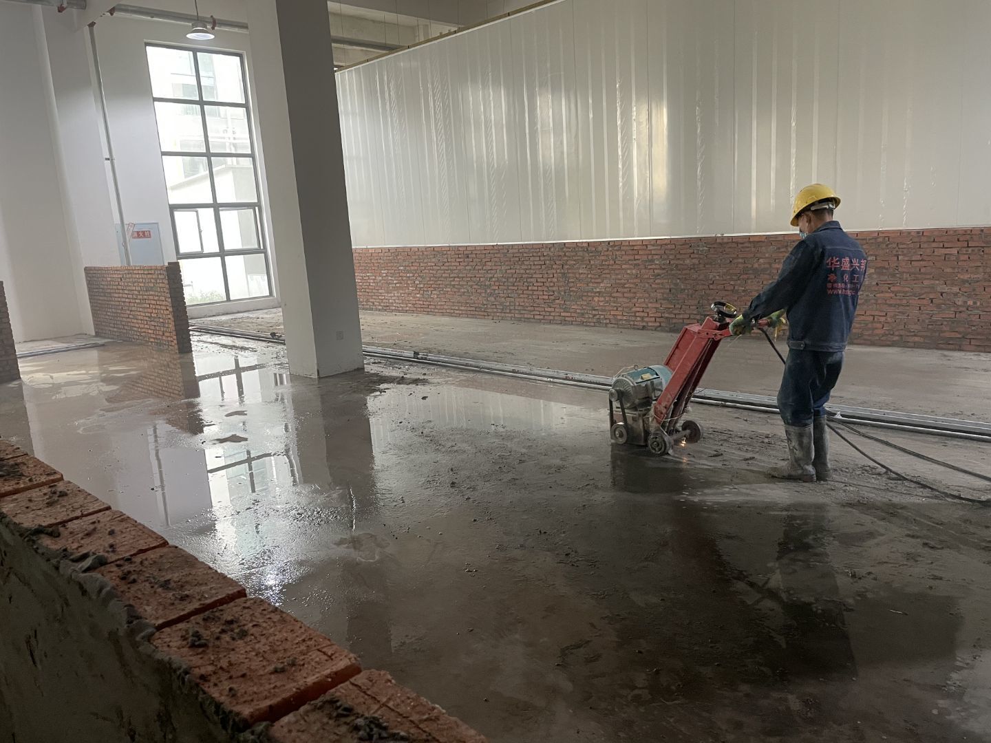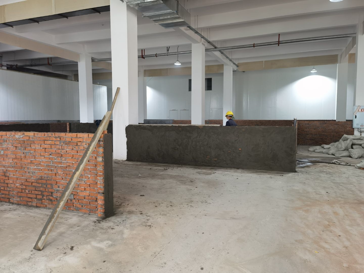 四川鮮美滋食品有限公司廠房裝修現場:1、擋水墻抹灰完成百分之30。 2、水磨石地面抓毛完成百分之35。