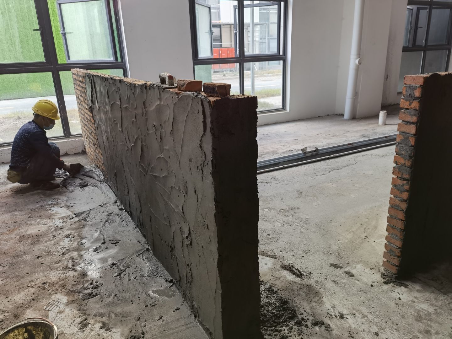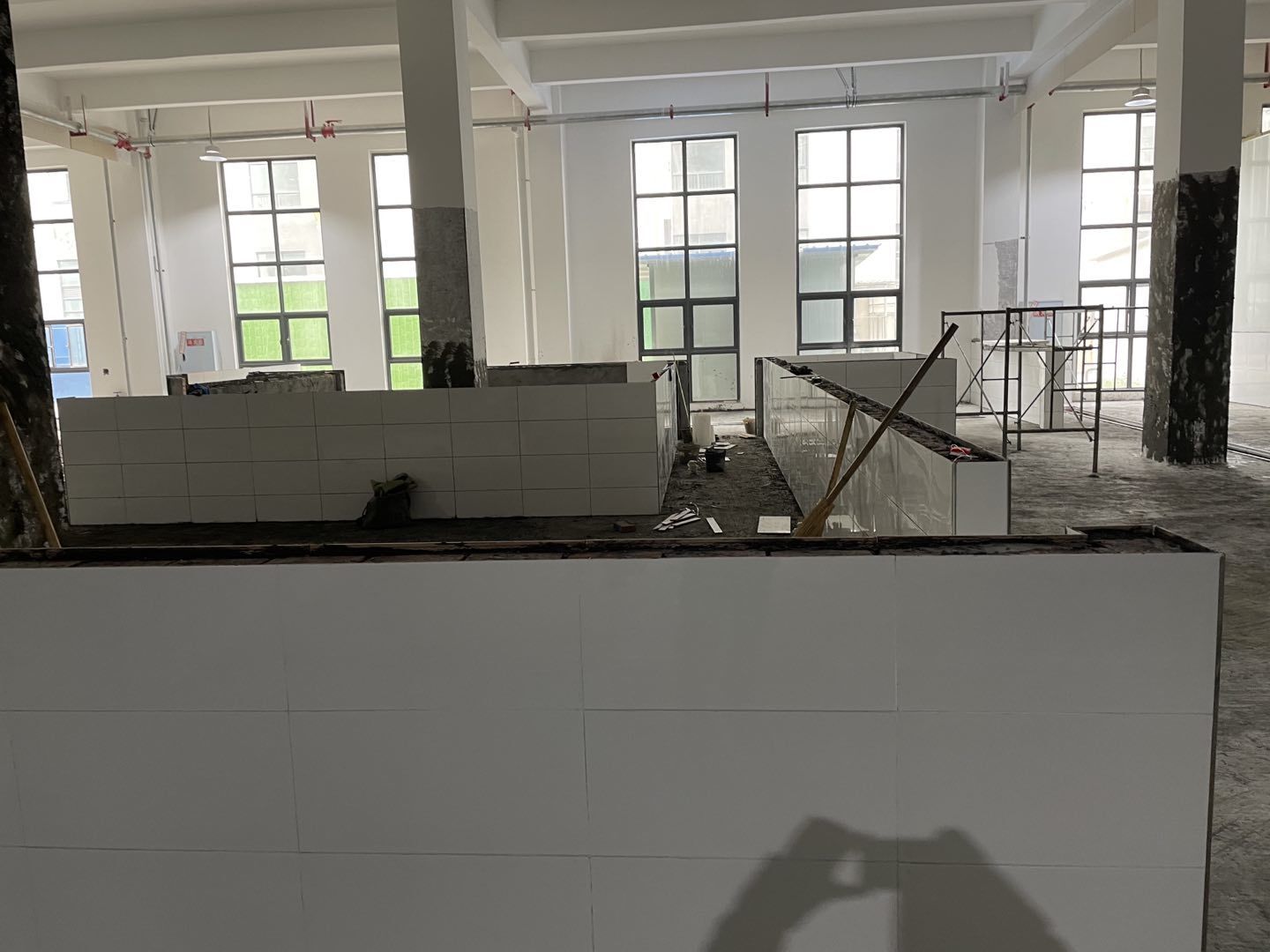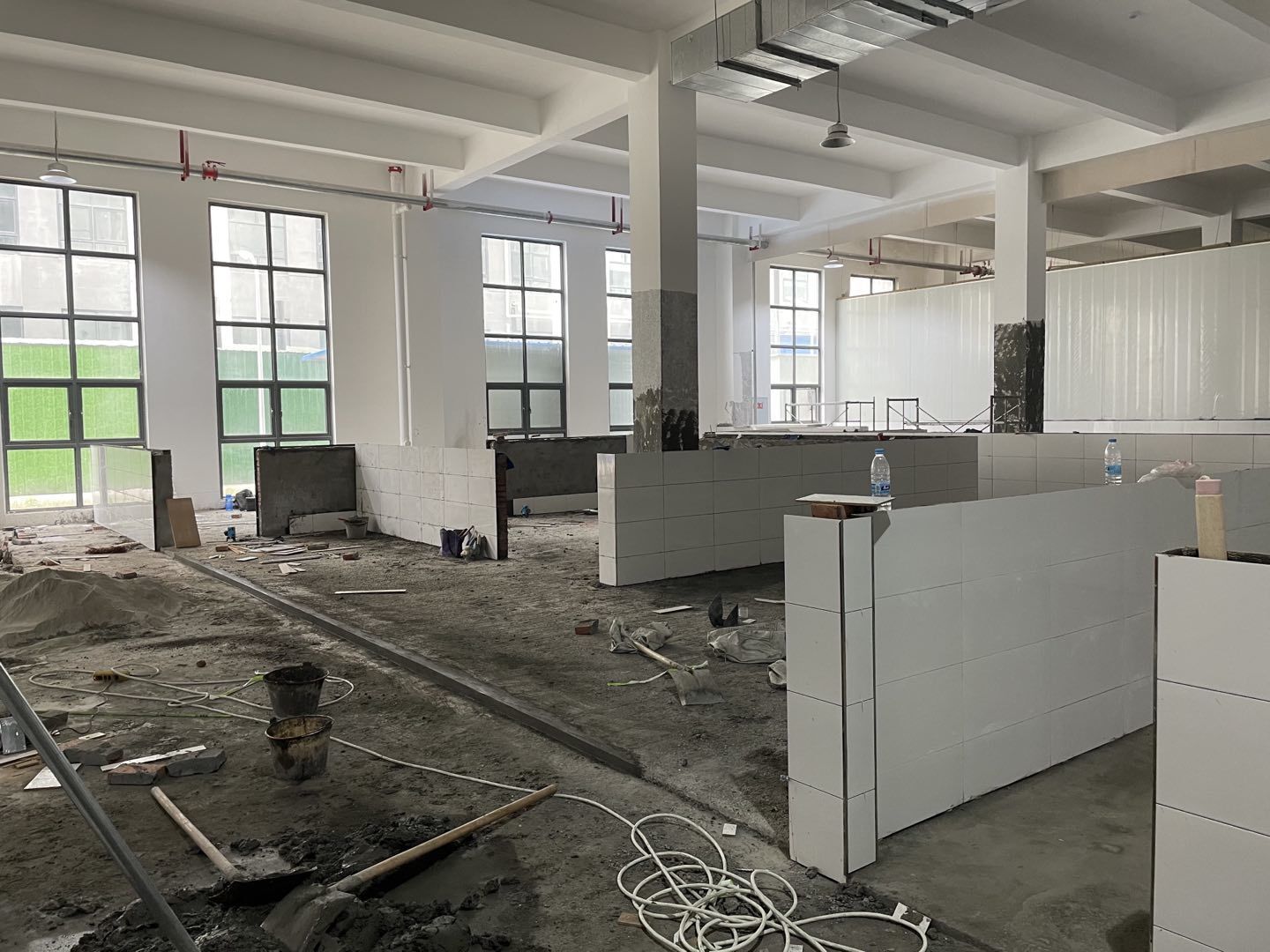 四川鮮美滋食品有限公司廠房裝修現場:1、擋水墻抹灰完成百分之30。 2、水磨石地面抓毛完成百分之35。