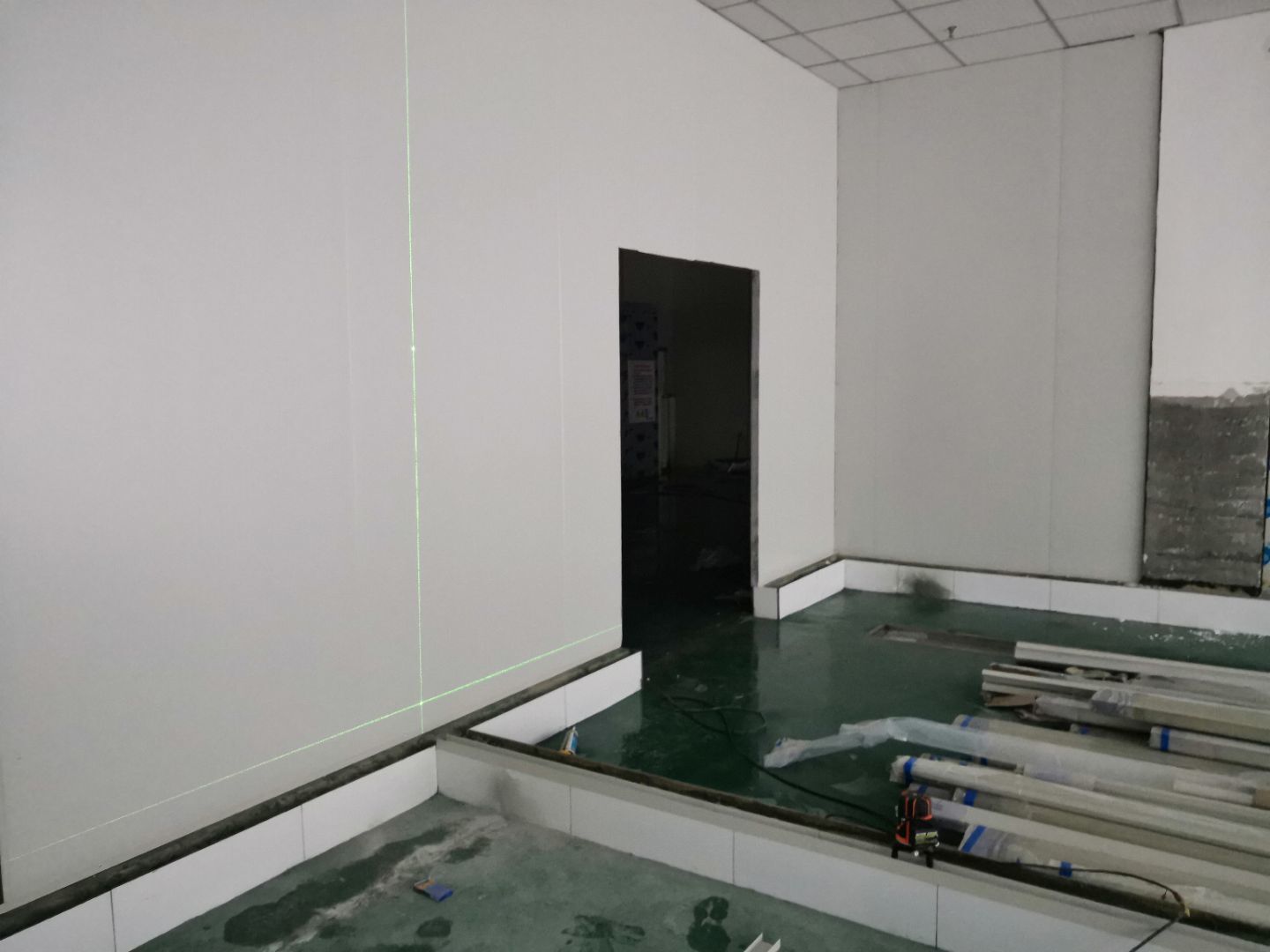 1、擋水墻磚砌完成,貼磚完成90%(剩余待彩鋼墻板完成后進行); 2、地面標高控制線完成,靶點完成; 3、門洞補爛完成25%;4、排水管安裝,SBS防水完成,凍庫丙綸防水完成。