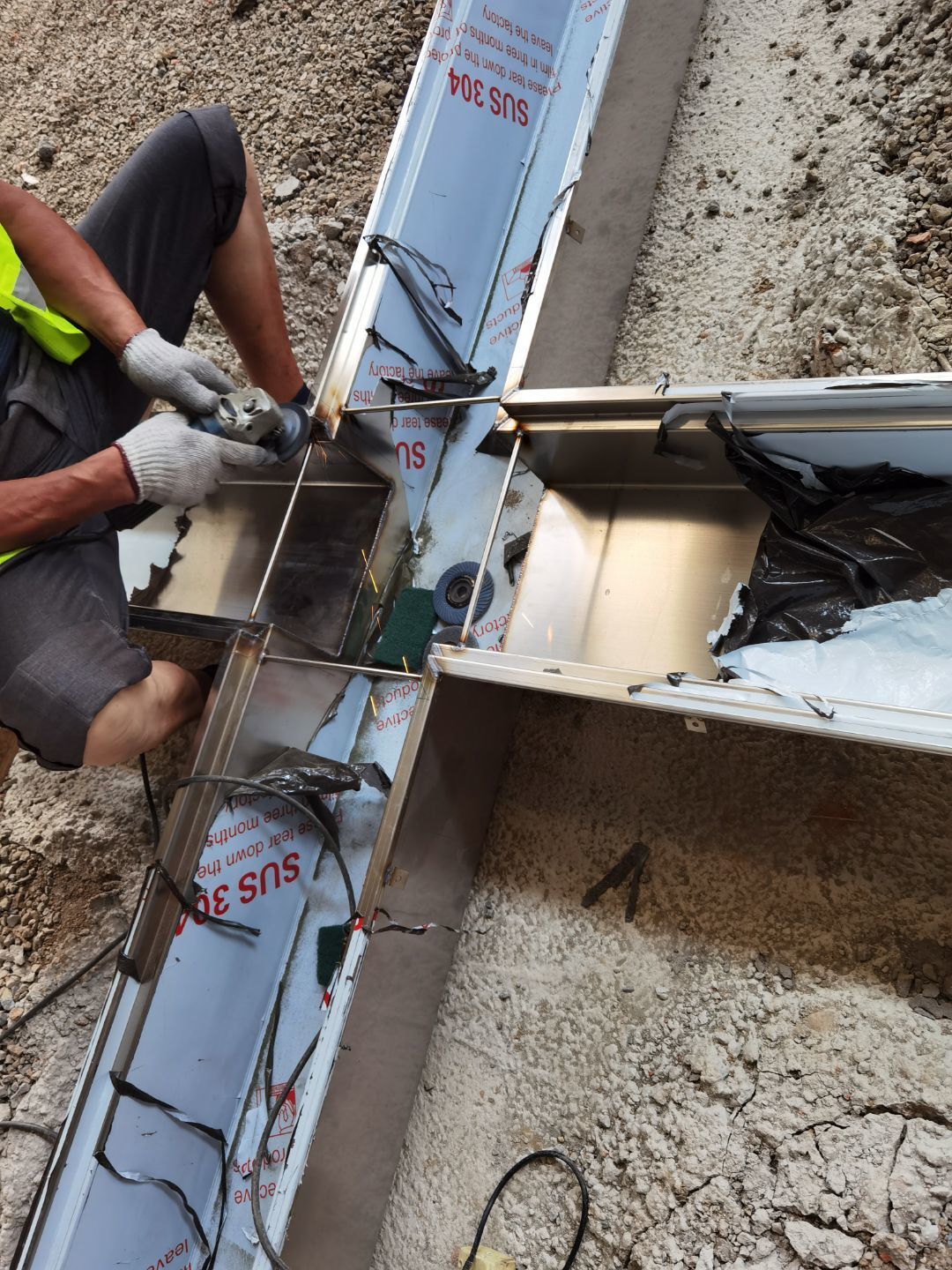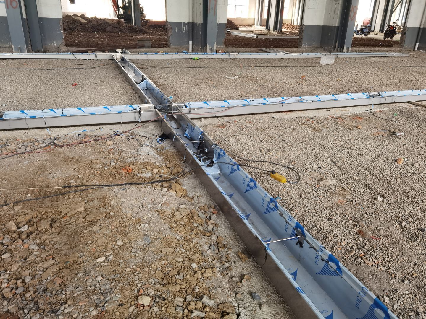 1,場地 整平 2,鋼構(gòu)施工 3,不銹鋼排水溝安裝 4,不銹鋼水溝第二批到場 焊接 5,pvc排水管安裝 6,室外電纜管安裝 今日材料進(jìn)場 不銹鋼排水溝材料