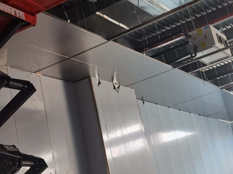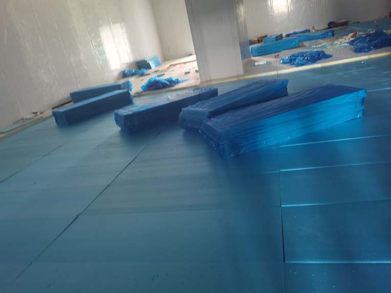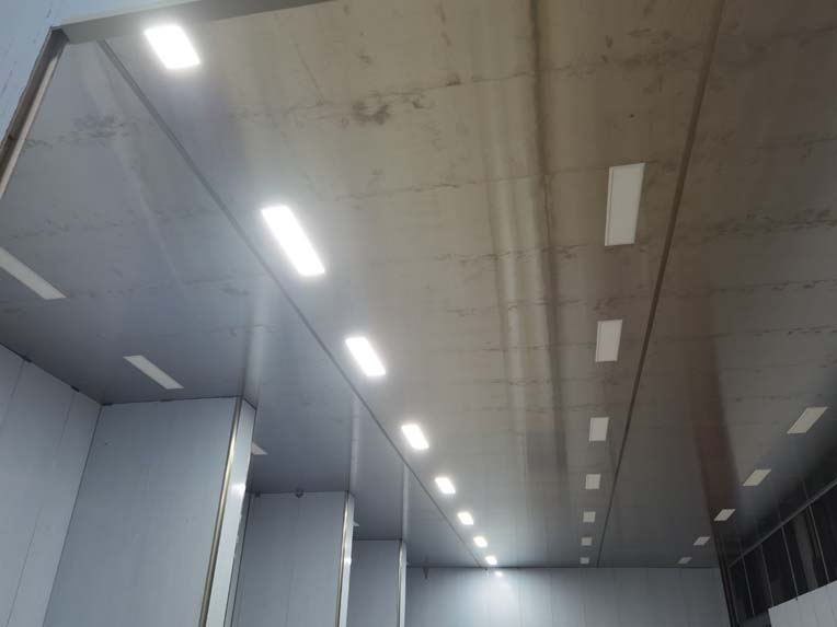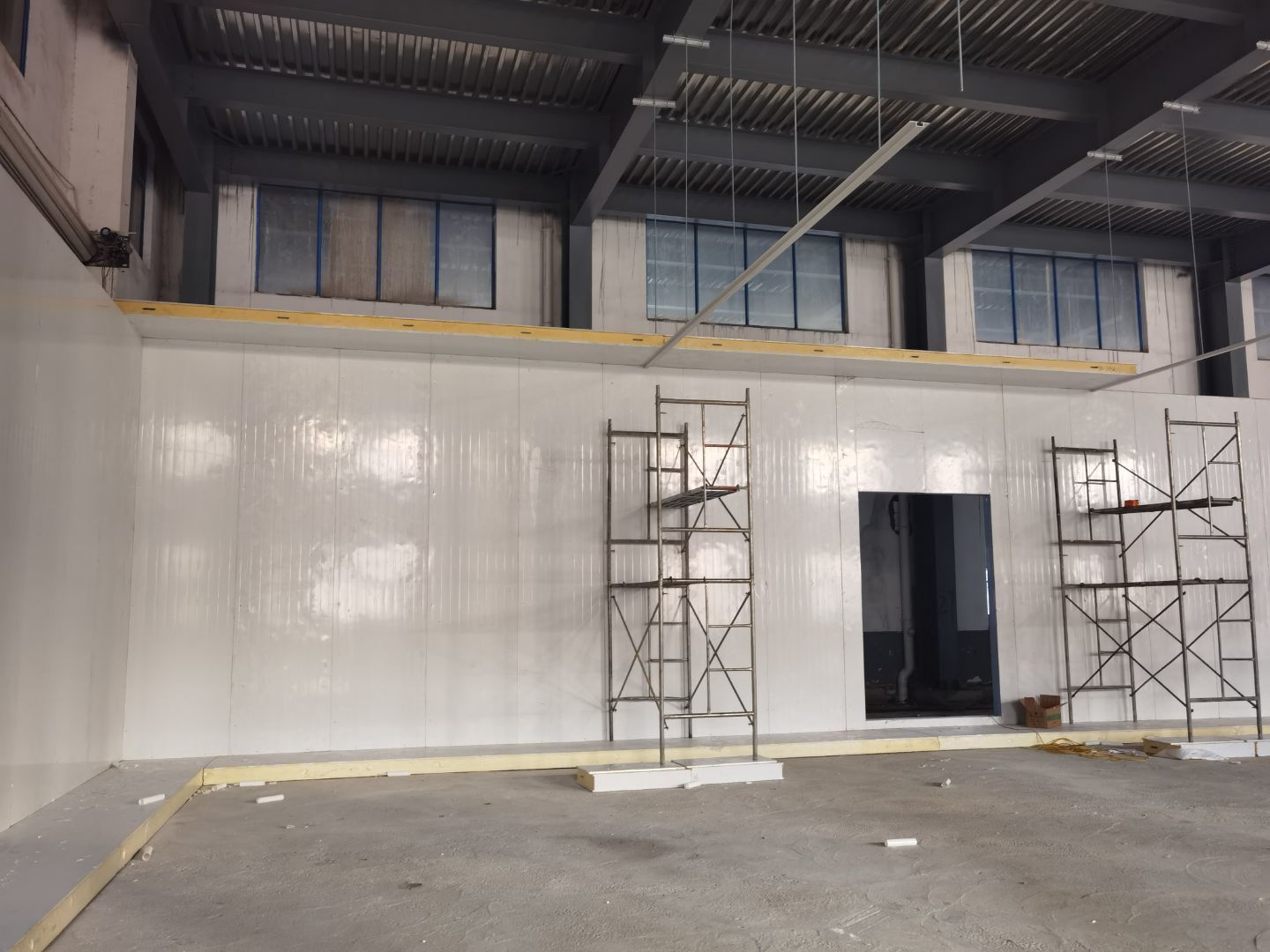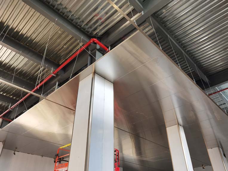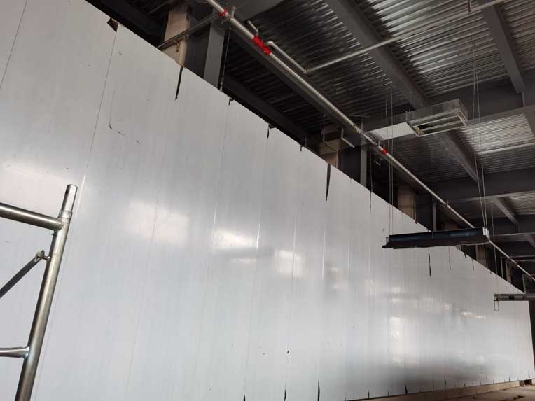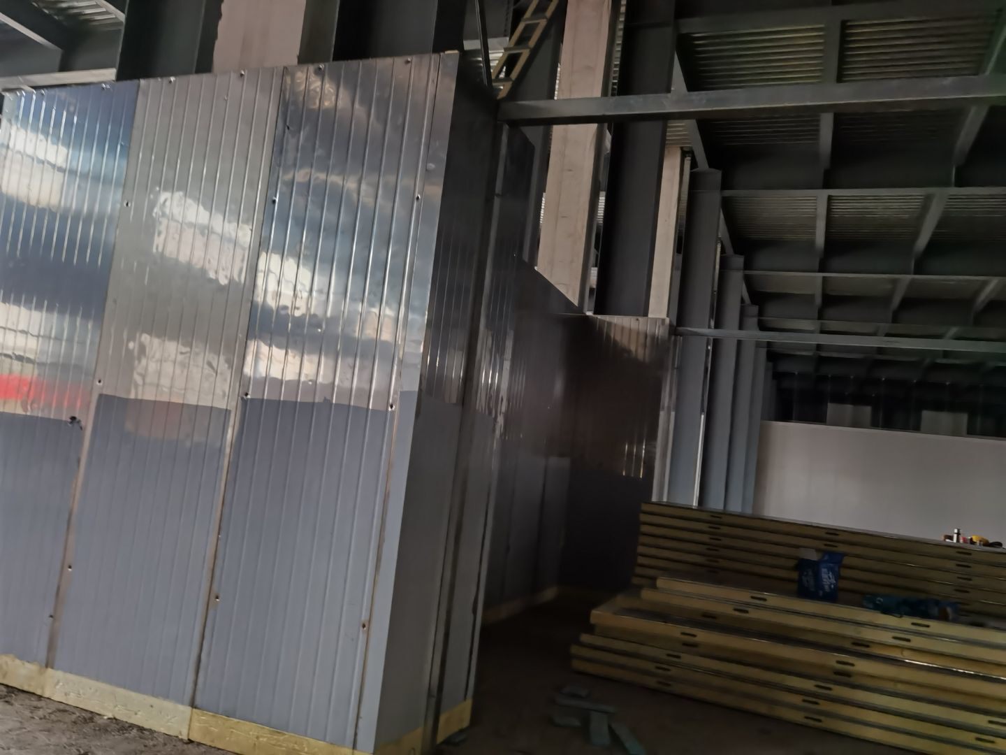 今日施工內(nèi)容 1,彩板拍圓弧 打膠 2, 二層鋁扣板安裝 3,二層風(fēng)管軟接 4,一層地坪施工 5,凍庫冷媒管安裝 6,二層墻板安裝 7,一層消防煙感安裝 8,蒸汽管道施工 9,門體安裝 今日材料進(jìn)場 彩板 消防主水管 工藝設(shè)備