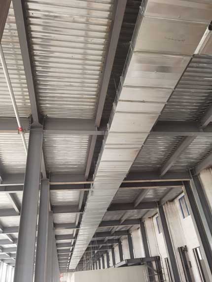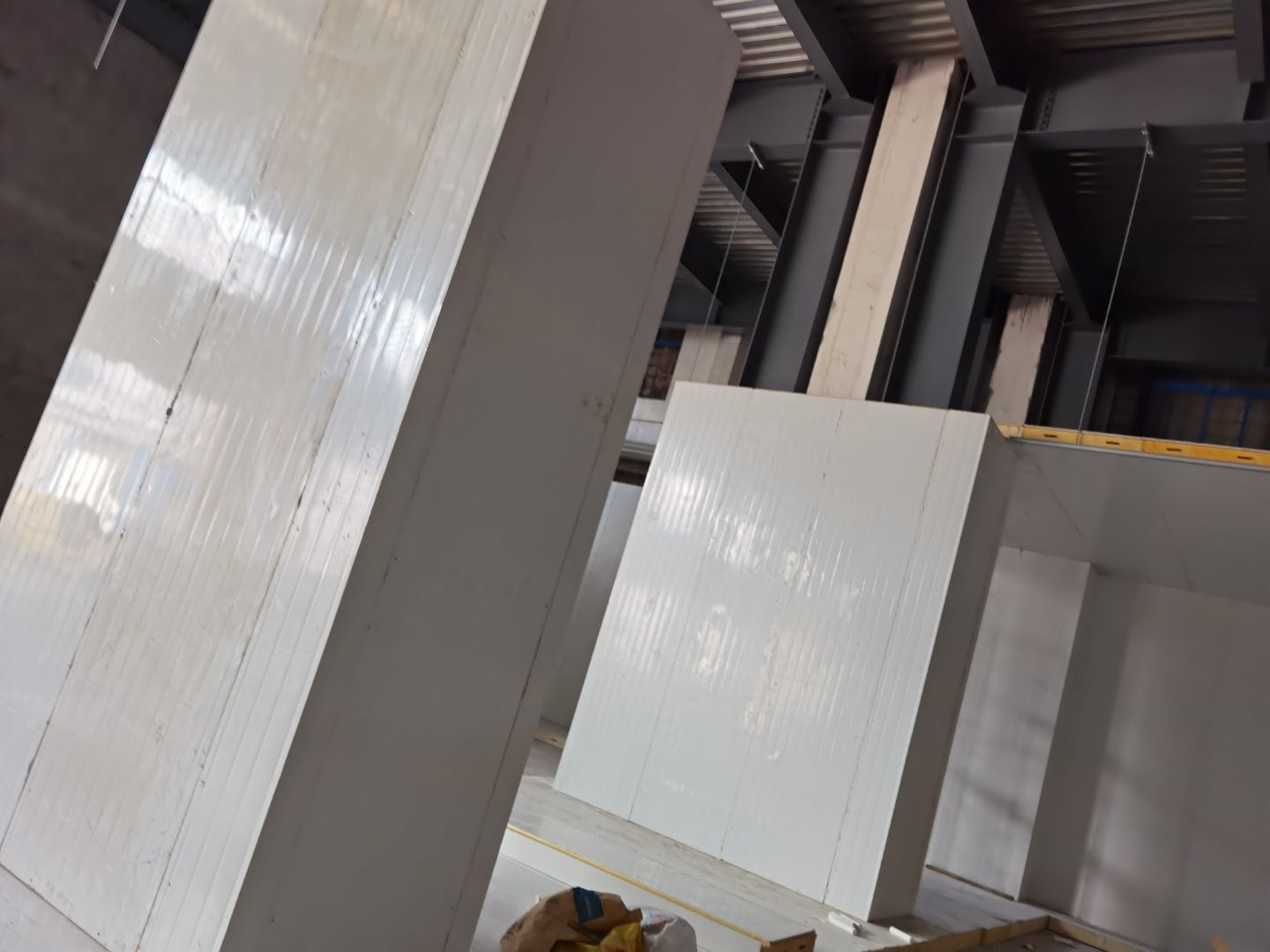 1,一樓地槽 彩板 吊筋安裝 2,一樓鋼構(gòu)頂刷漆 3,一層鋼構(gòu)平臺施工 4,西邊室外雨水管安裝 5,一樓凍庫門體安裝 6,一樓空調(diào)風(fēng)管吊裝 7,二樓空調(diào)柜機(jī)吊裝 8,電梯施工