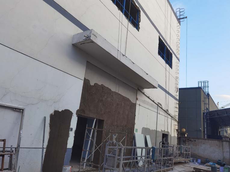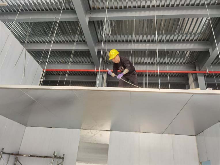 今日施工內(nèi)容: 1,彩板頂板安裝 掛T鋁 2,室外門衛(wèi)安抹灰 3,二樓動力電橋架支架開始施工 4,室外消防水箱安裝 5,土建擋水墻斜抹灰 修補(bǔ) 6,二樓消防噴淋施工 7,室外外墻噴真石漆